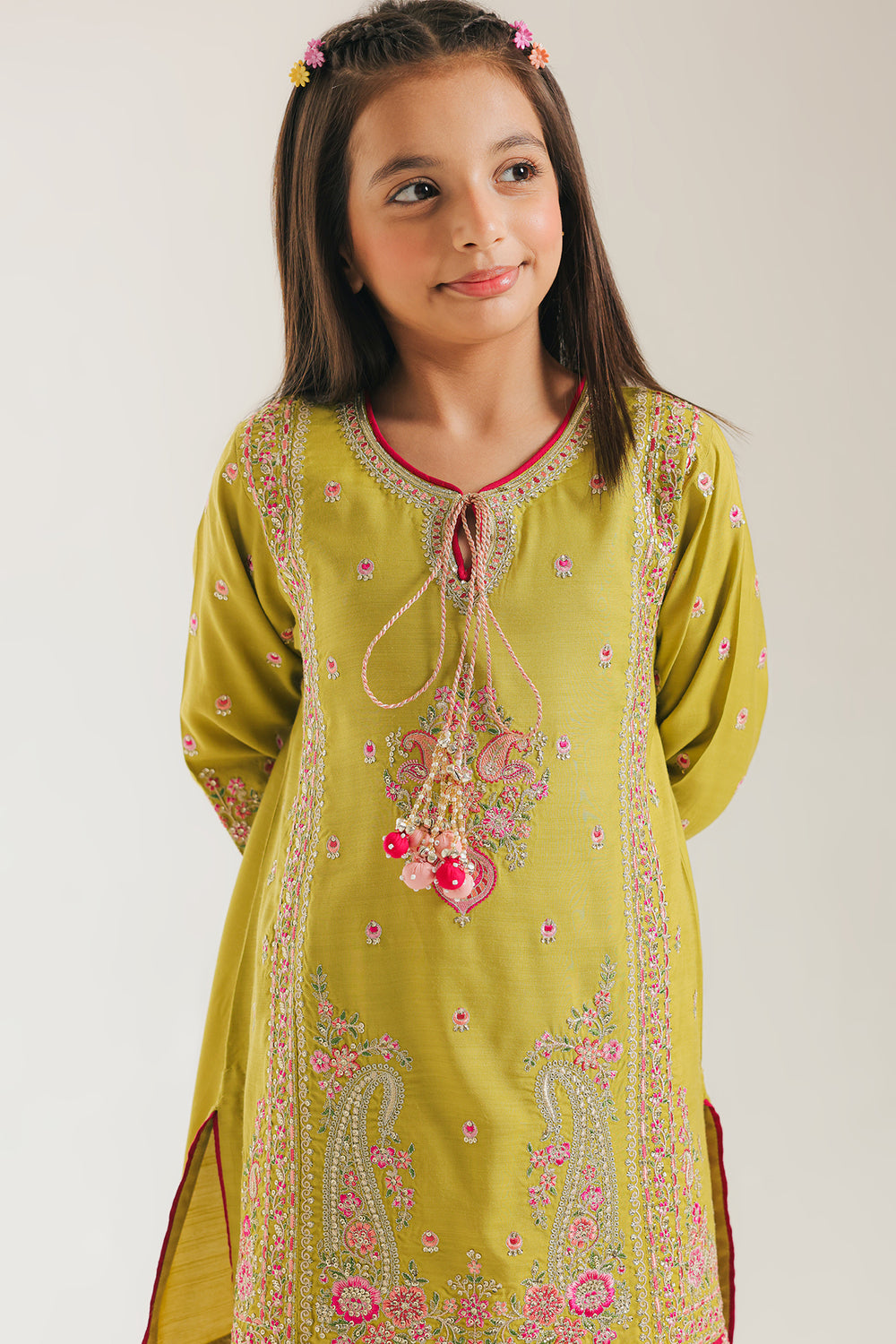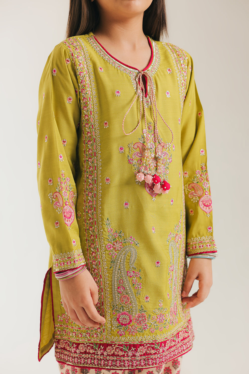 Illuminate the room with this gorgeous lime-green embroidered suit. The short, festive kurta is crafted from a bright, fresh lime-green fabric. It is richly embellished with elaborate thread and sequin embroidery in pink and gold tones, featuring a dense paisley and floral design across the yoke, sleeves, and hem. The V-slit neckline is accented with colorful tassels detail. The ensemble is perfectly complemented by shalwar. The shalwar feature an all-over, small-scale floral print in shades of cream and pink, creating a playful and festive contrast. This suit is an eye-catching choice for any special occasion.