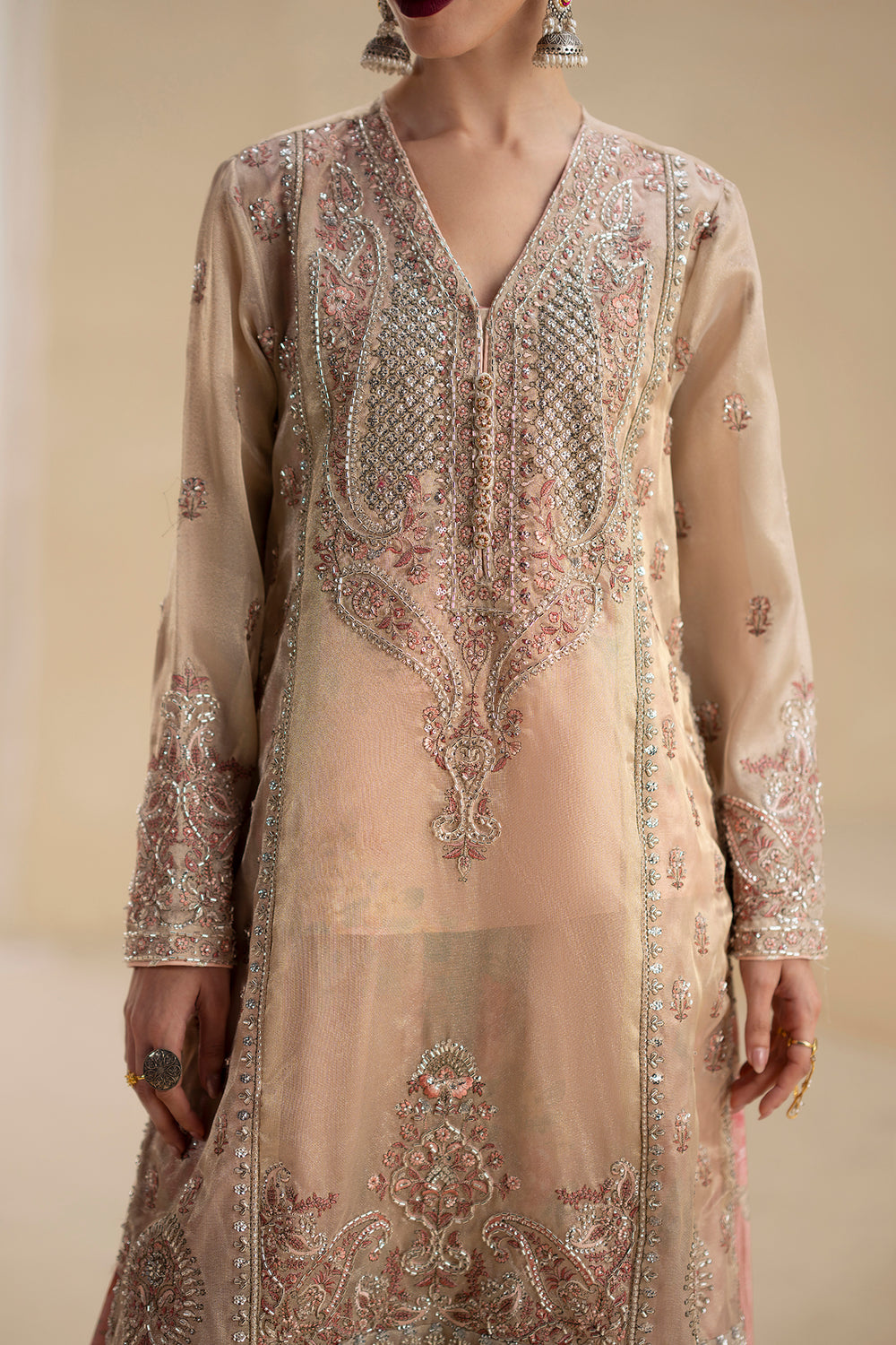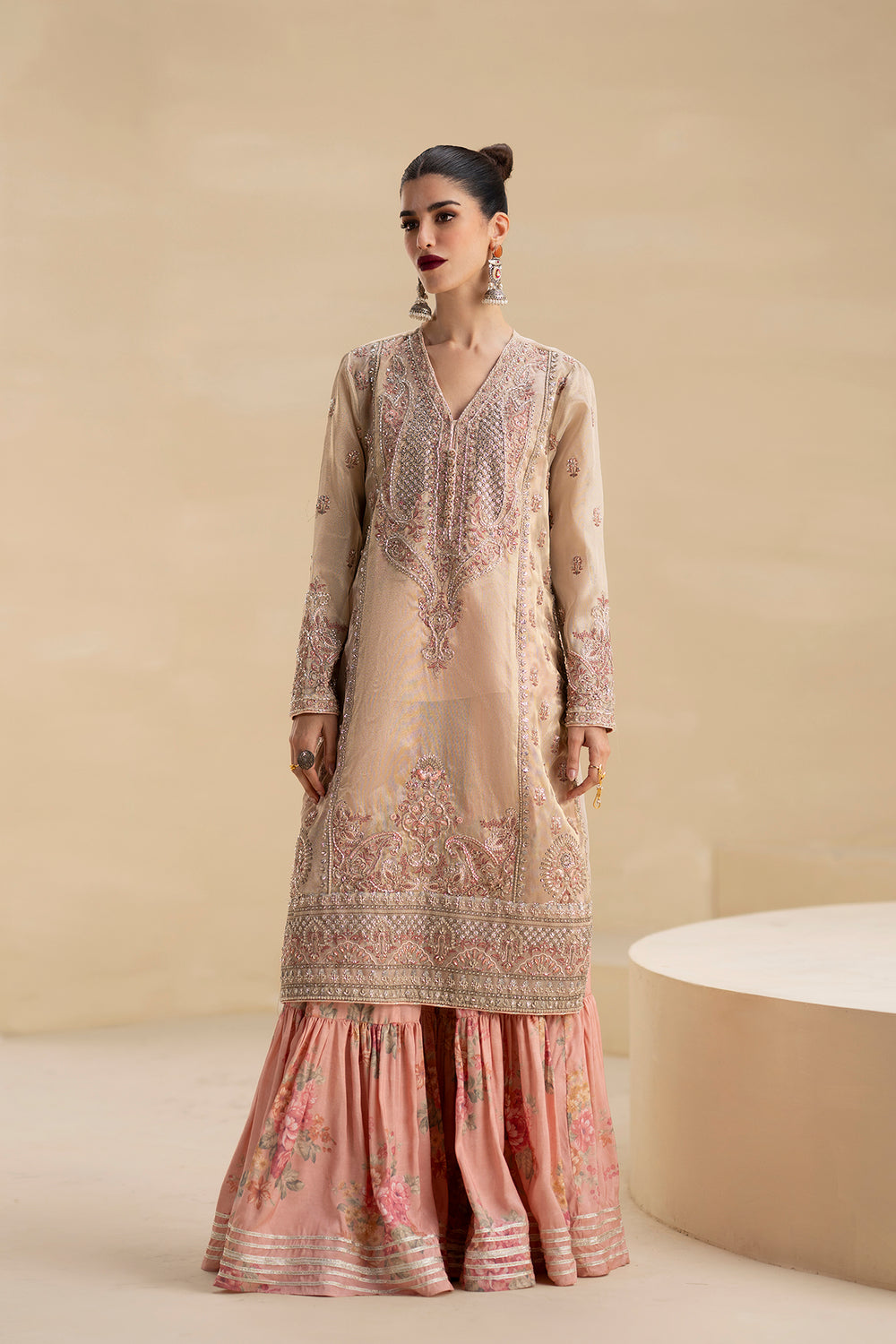 Capture a look of unforgettable, regal glamour with this exquisite embroidered suit, which includes a long shirt, gharara, and slip. The full-length shirt is crafted from a soft beige fabric and is meticulously embellished with heavy gold, pink, and silver thread embroidery. The intricate embroidery, featuring complex floral and traditional motifs, runs densely across the yoke, sleeves, and extended hem, adding luxurious weight and shimmer. Layered beneath is a breathtaking gharara, featuring a voluminous tier in a soft pink hue with a delicate floral print. The combination of the heavily worked shirt and the flowing printed gharara creates a truly majestic silhouette. This stunning ensemble is the epitome of festive luxury.