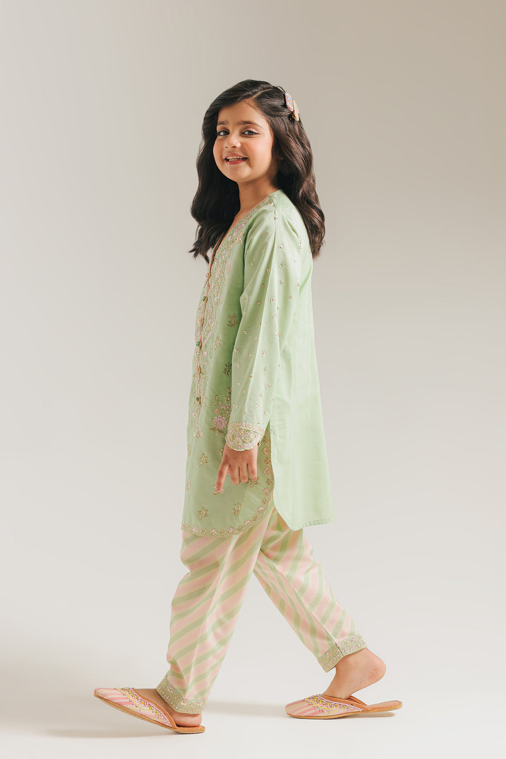 This mint-green embroidered suit for girls is a refreshing blend of serene color and intricate artisanal charm, making it a sophisticated choice for festive daytime celebrations. The long-sleeved tunic features a soft pastel canvas beautifully elevated by delicate floral embroidery and shimmering silver accents that frame the neckline and cascade down the front. Designed with a classic V-neckline and elegant scalloped lace borders on the sleeves and hem, this piece offers a refined and polished look. The ensemble is perfectly completed by coordinating shalwar featuring a playful diagonal striped pattern in matching mint and soft pink tones, finished with a decorative embroidered border at the ankles. Crafted with a relaxed and comfortable silhouette, this suit ensures a look that is both timelessly graceful and undeniably sweet for any young fashion enthusiast.