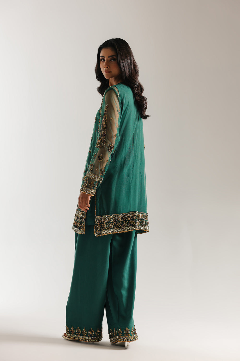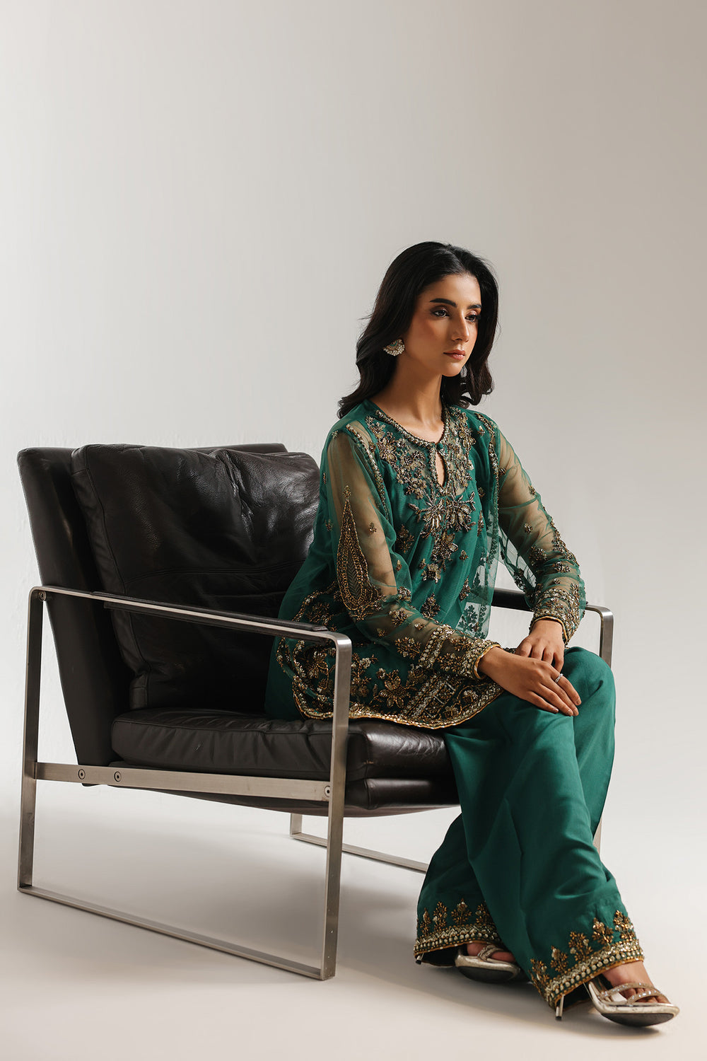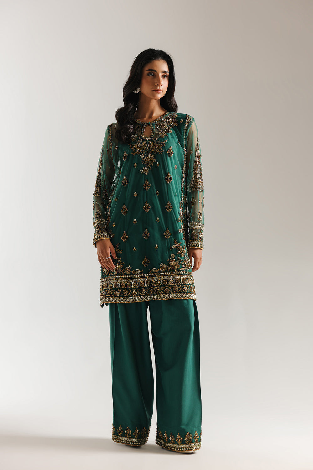 Make a truly grand entrance in this opulent three-piece ensemble, bathed in a rich, jewel-toned emerald green. Designed for the woman who cherishes timeless artistry, this suit is a masterpiece of detail and elegance. The sheer net shirt is a canvas of exquisite craftsmanship, heavily embellished with intricate gold and antique bronze embellishment. Elaborate paisley and floral motifs adorn the neckline, bodice, and long sleeves, culminating in a heavily worked hem that catches the light with every movement. A chic keyhole neckline adds a contemporary touch, while an included matching slip ensures perfect coverage and comfort. Complementing the stunning top is a graceful, wide-leg shalwar. This flowing bottom is finished with a broad, heavily embroidered border that perfectly mirrors the opulent design of the shirt, creating a cohesive and luxurious look from head to toe. This ensemble is an ideal choice for weddings, festive galas, or any formal occasion where you wish to embody grace and sophistication.