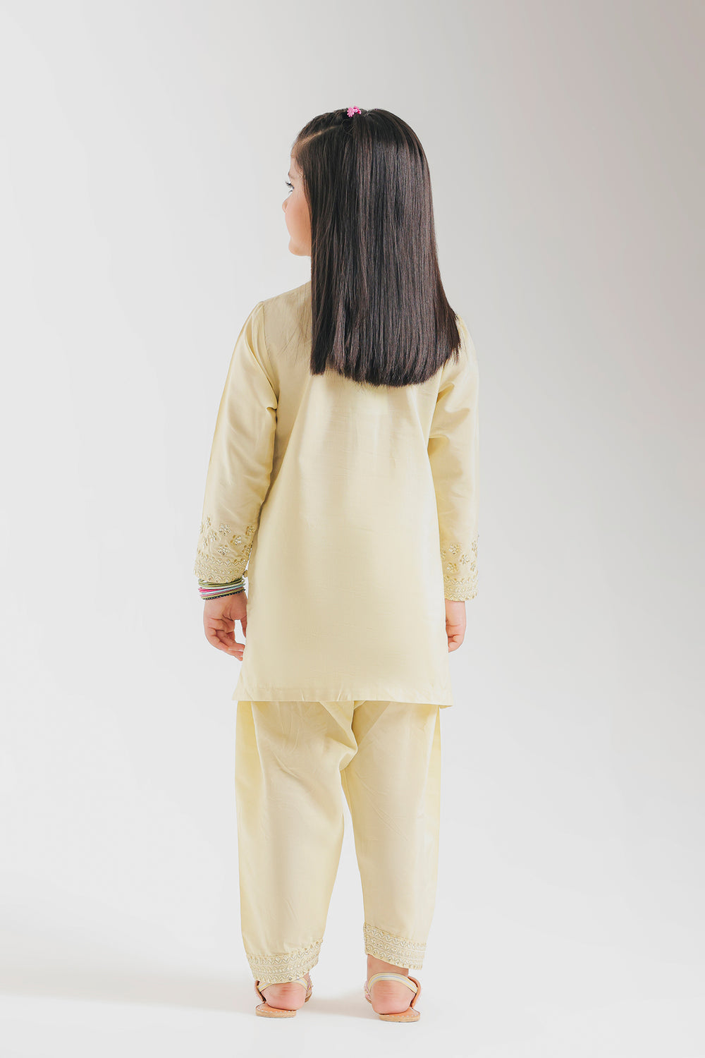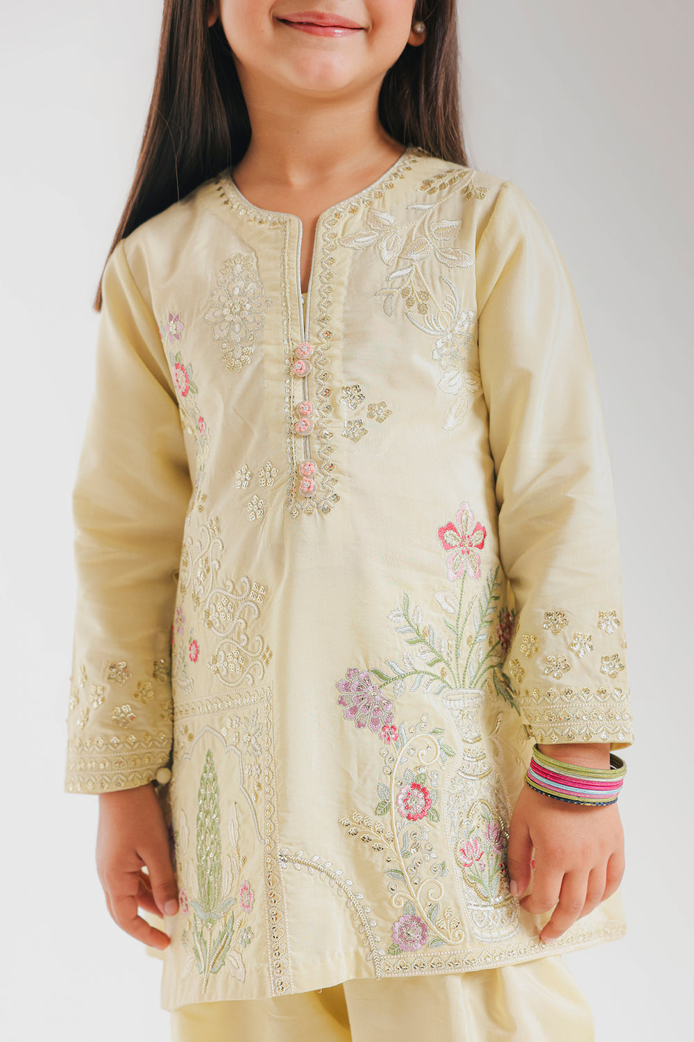 Discover timeless elegance with this exquisite embroidered suit that captures the essence of refined craftsmanship. The straight-cut kurta features delicate floral embroidery in soft pink and green hues, The spring-inspired design pairs beautifully with tapered cigarette pants adorned with ornate embroidery at the hem, creating a sophisticated silhouette from top to bottom. This cohesive ensemble strikes the perfect balance between understated grace and eye-catching detail, making it an ideal choice for special occasions or when you want to radiate quiet confidence with a playful twist.