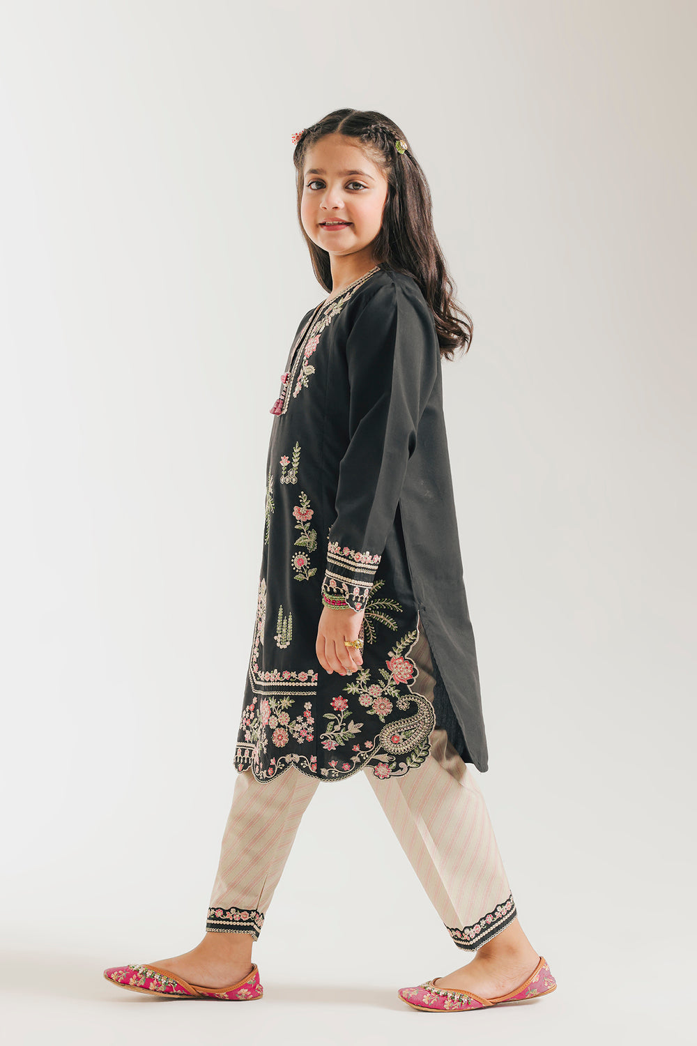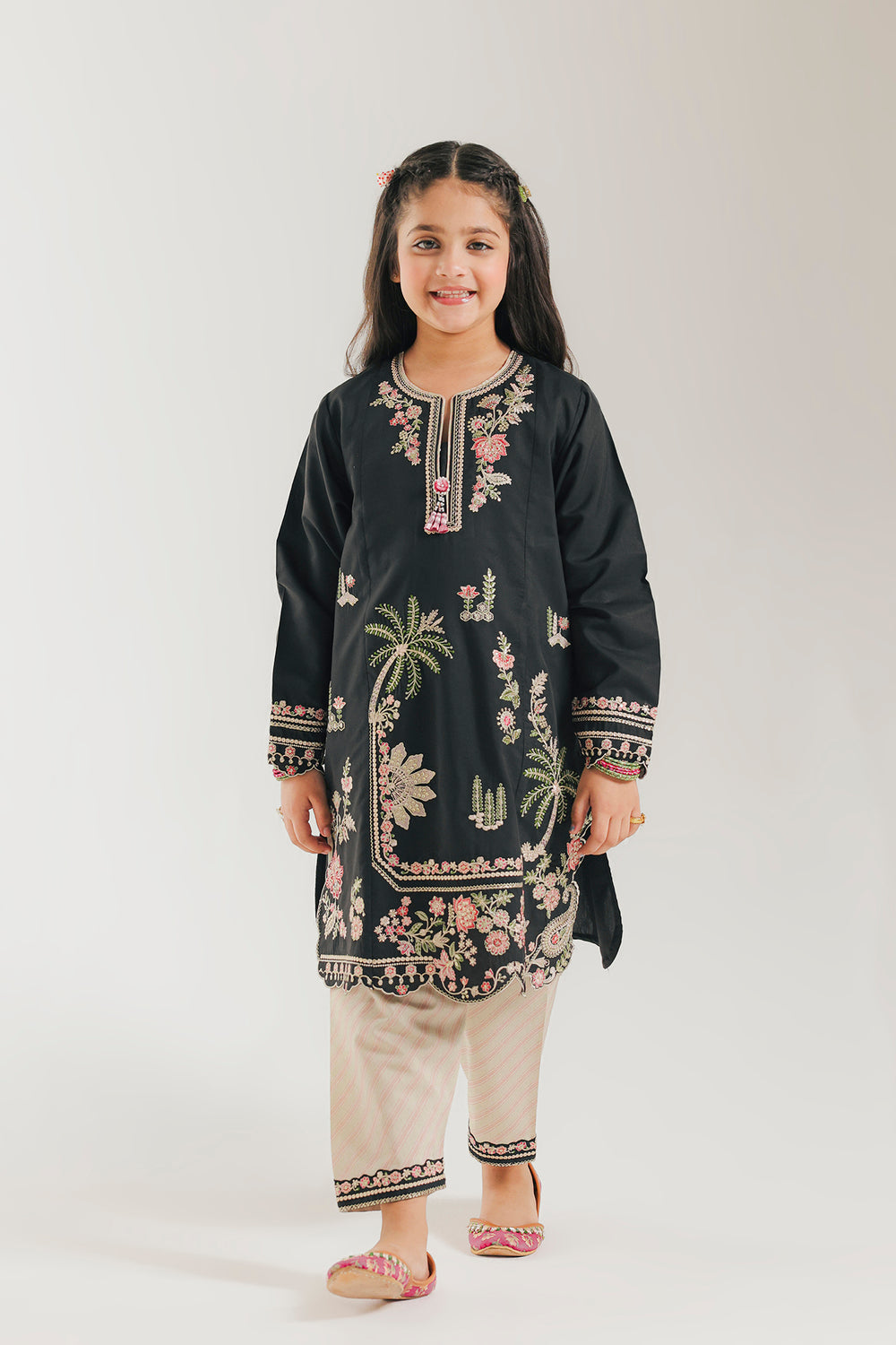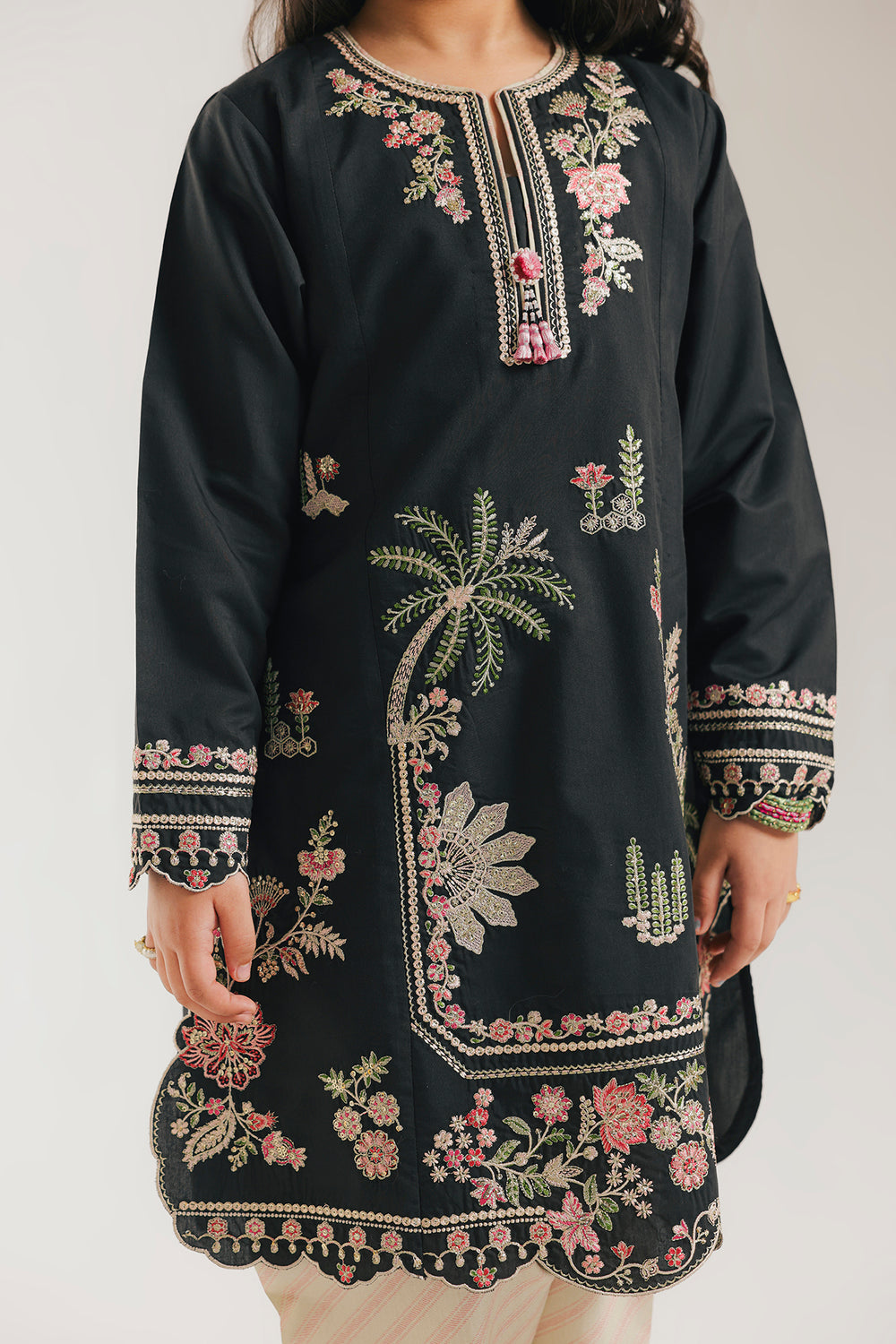 This charming two-piece suit for girls features a classic black shirt with a playful yet sophisticated design. The shirt is adorned with vibrant botanical and tropical embroidery, including detailed palm trees and floral motifs in shades of pink, sage, and ivory. It boasts a decorative split neckline with pink tassel accents and a unique scalloped high-low hemline that adds a modern touch to the traditional silhouette. Completing the outfit are light beige trousers with delicate diagonal stripes and a coordinating embroidered border at the ankles.