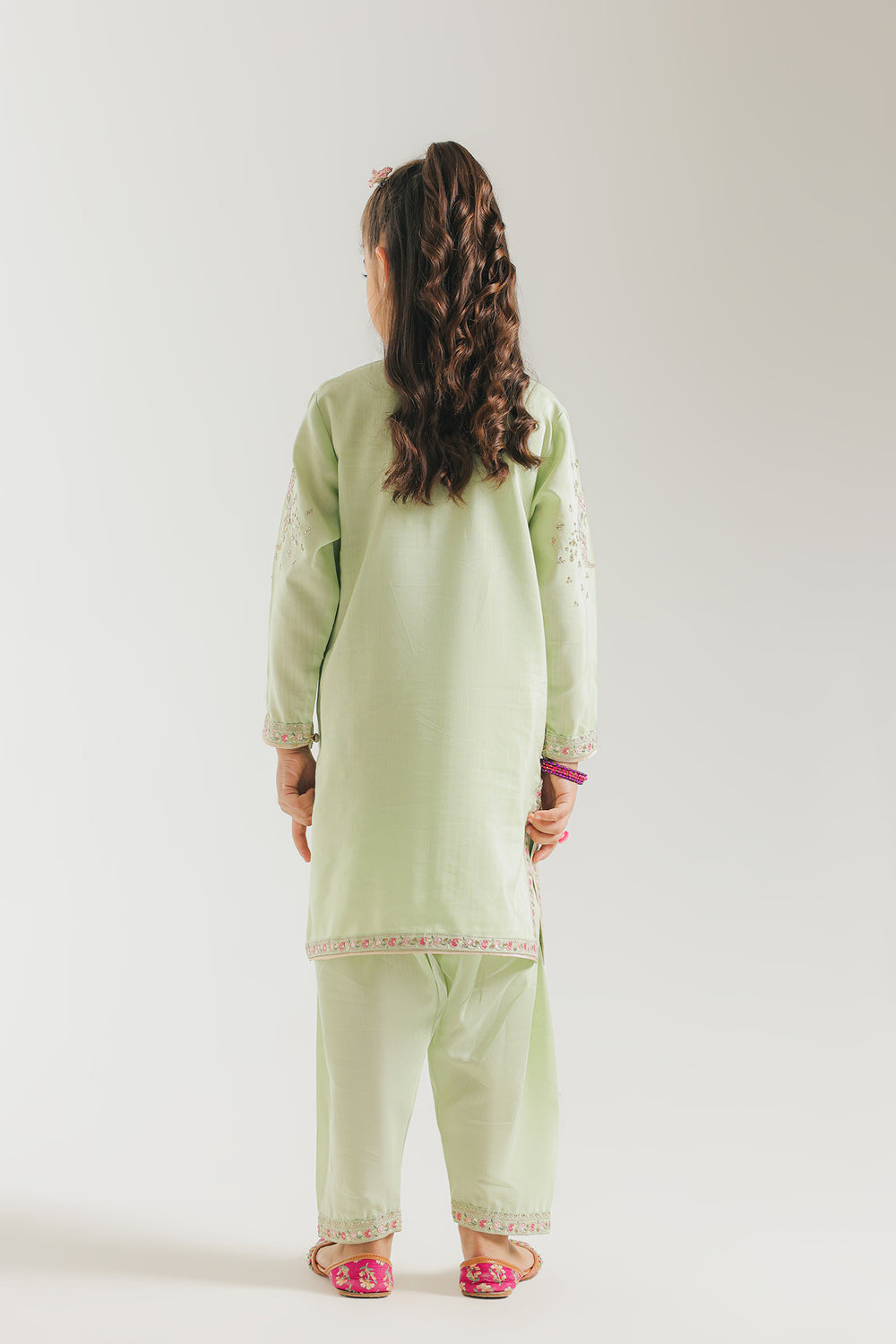 Bring a touch of fresh, festive charm to your child's wardrobe with this mint green embroidered suit, featuring a classic straight-cut tunic. The outfit is meticulously detailed with pastel floral embroidery in shades of pink, lavender, and soft yellow, which are artfully scattered across the front and sleeves. The neckline and hemline are finished with shimmering silver lace borders that add a refined sparkle to the ensemble. This look is paired with matching mint green shalwar, which feature delicate embroidered border at the ankles. To complete the festive aesthetic, the suit is styled with vibrant pink embellished khussas that provide a beautiful pop of color.