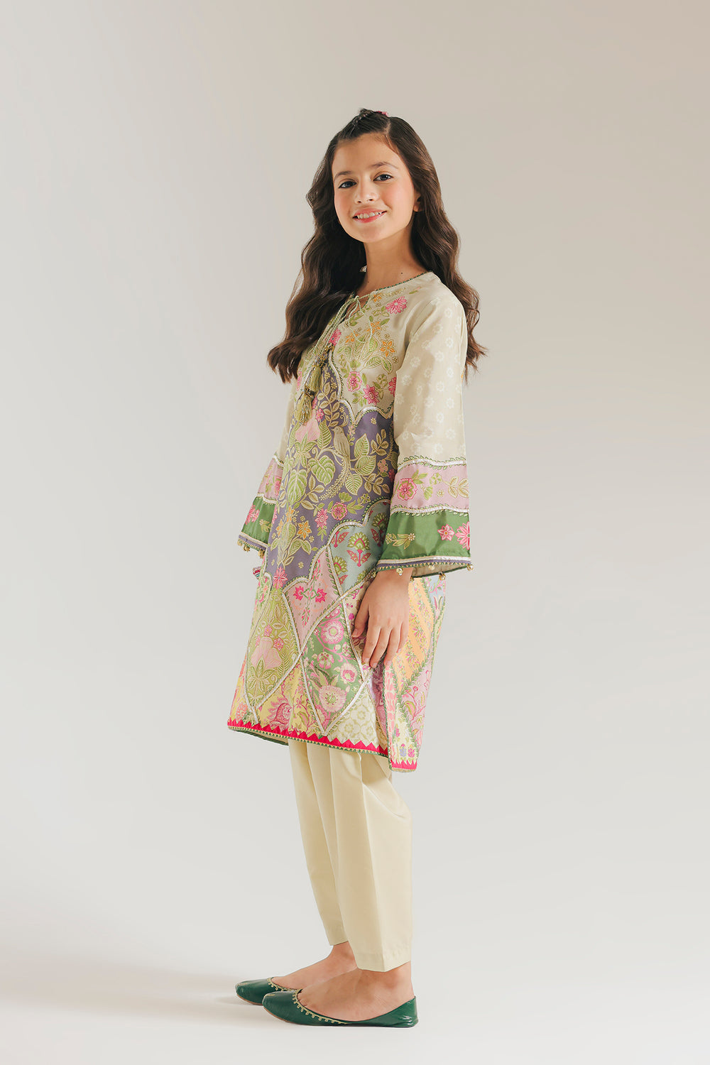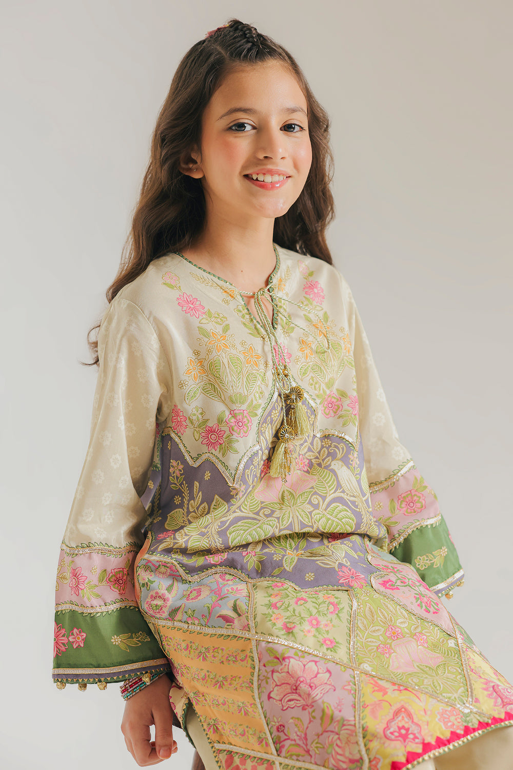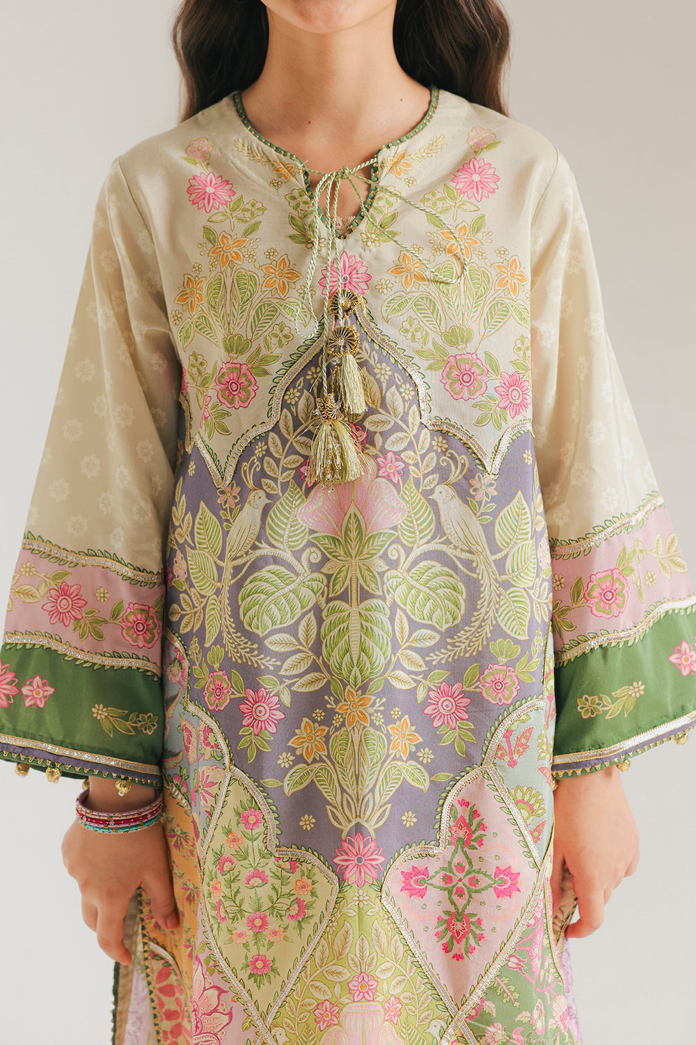 Radiate a joyful and vibrant energy in this multi-colored printed suit with gotta work. The tunic features an intricate patchwork-style print with a mix of floral patterns and geometric borders in soft shades of mint green, rose pink, lavender, and sunny yellow. The neckline is detailed with a delicate split and adorned with a matching corded tassel, while the sleeve cuffs and hemline are finished with a contrasting hot pink and green trim. Paired with simple beige straight-cut shalwar, this ensemble offers a playful yet polished look that is perfect for any festive or daytime occasion.