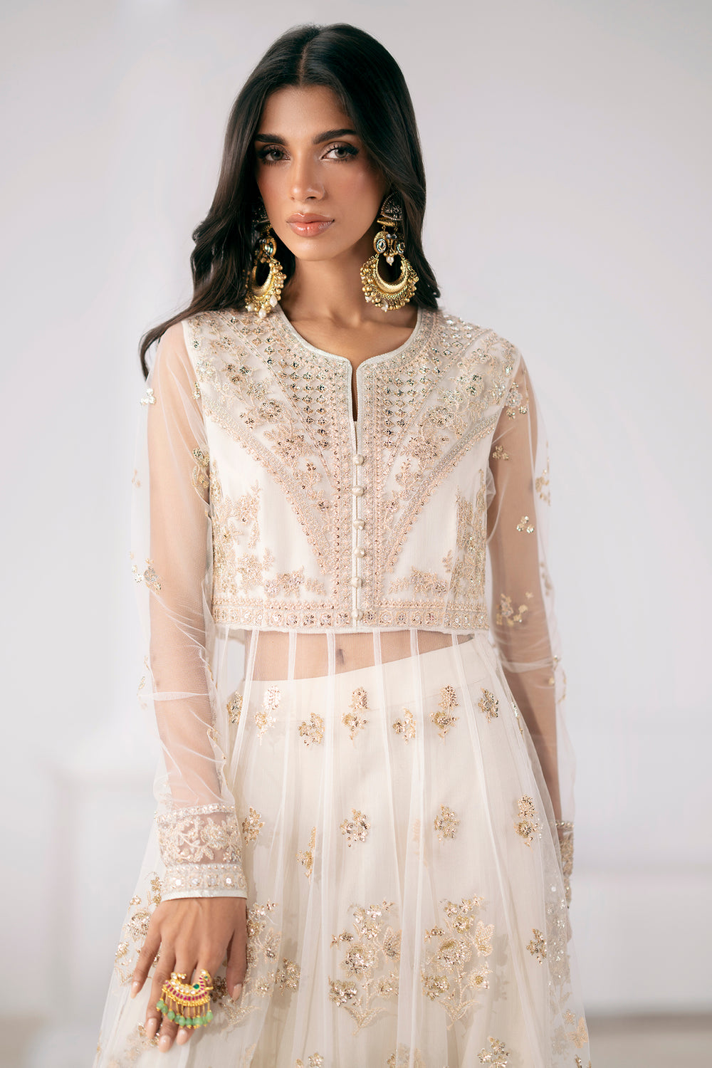 Wrap yourself in this breathtaking embroidered suit, a masterpiece of elegance and luxury. The sheer, long pishwas in a soft off-white is a canvas for stunning gold embroidery and shimmering sequin work, creating a dazzling display. The intricate patterns cascade down the shirt, with a heavily embellished bodice that adds to its regal charm. The ensemble is layered over a graceful lehenga, also in off-white, with delicate floral embroidery that peeks out from beneath the shirt. This magnificent suit is the perfect choice for a grand celebration, ensuring a look that is both timeless and unforgettable.