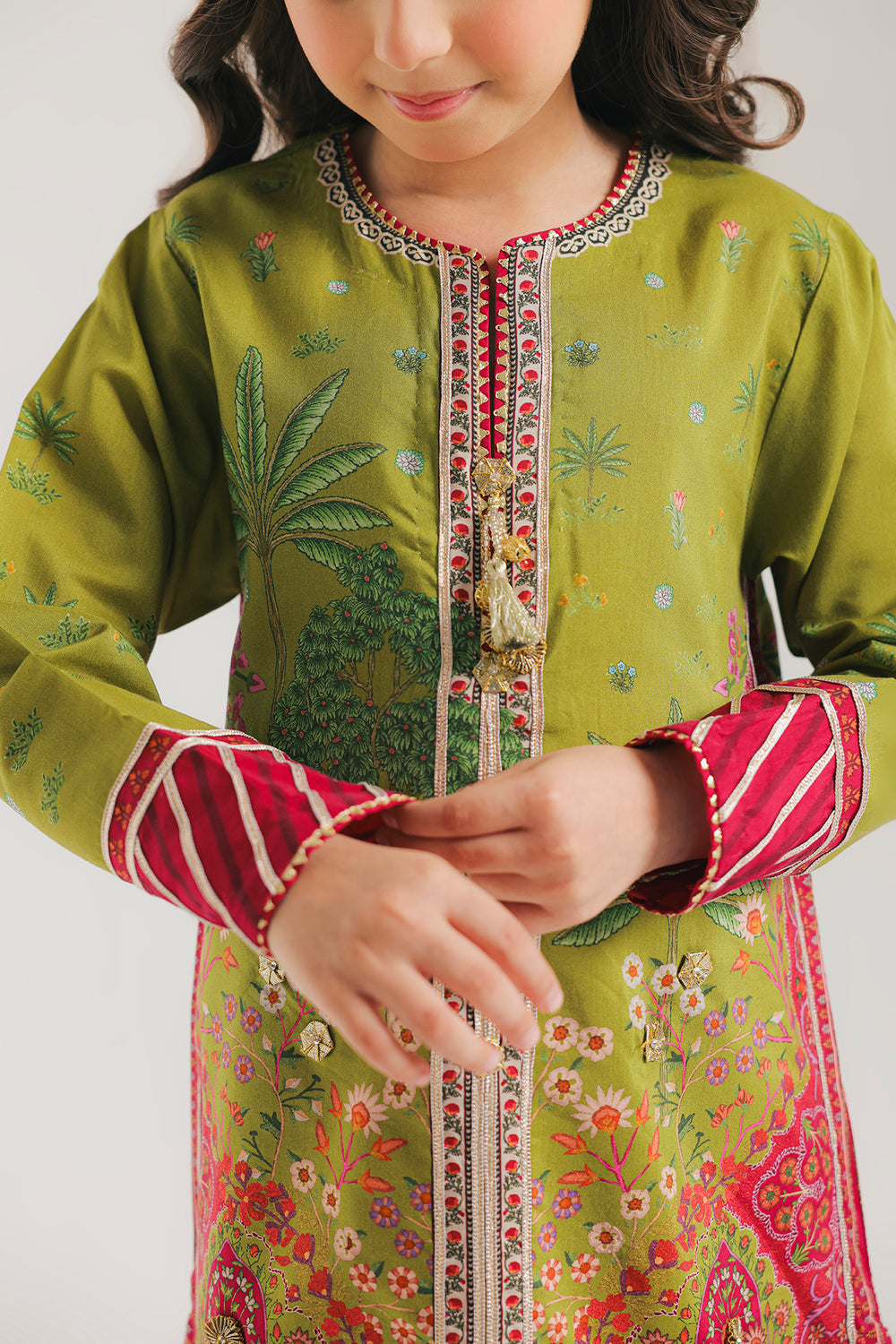 This charming yellow printed suit for girls is a vibrant fusion of traditional motifs and contemporary style. The bright yellow shirt is beautifully detailed with a multi-colored printed neckline featuring intricate floral and paisley designs in shades of pink, turquoise, and orange. The slight gotta work extends to the sleeve cuffs, neckline and hem, which are finished with a delicate scalloped edge. Paired with comfortable straight fit shalwar, this suit offers a cheerful and polished look perfect for any special occasion.