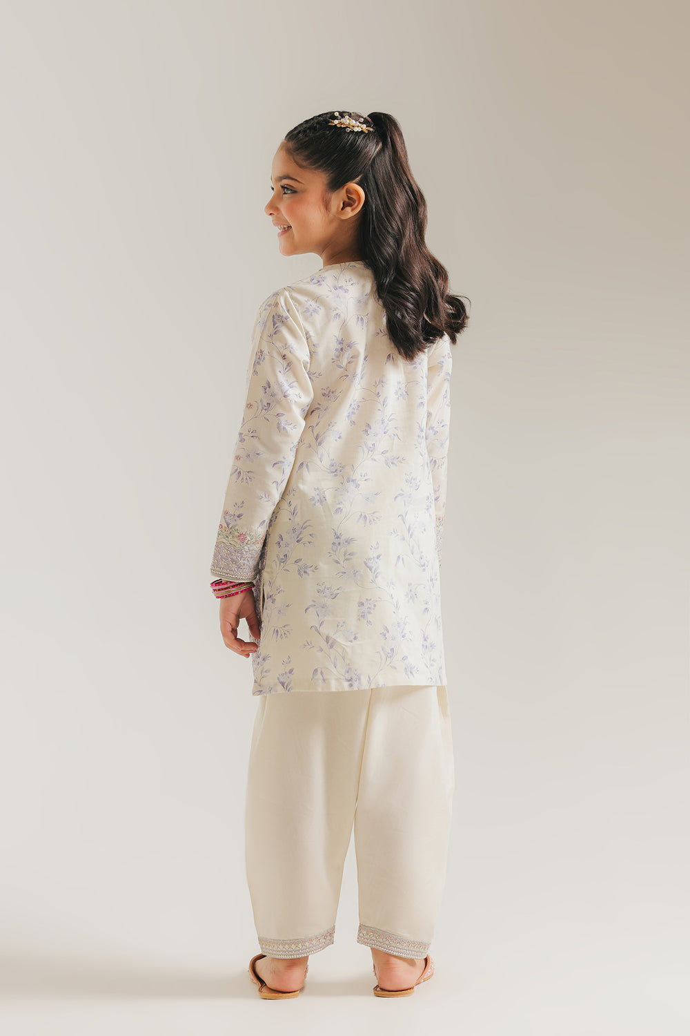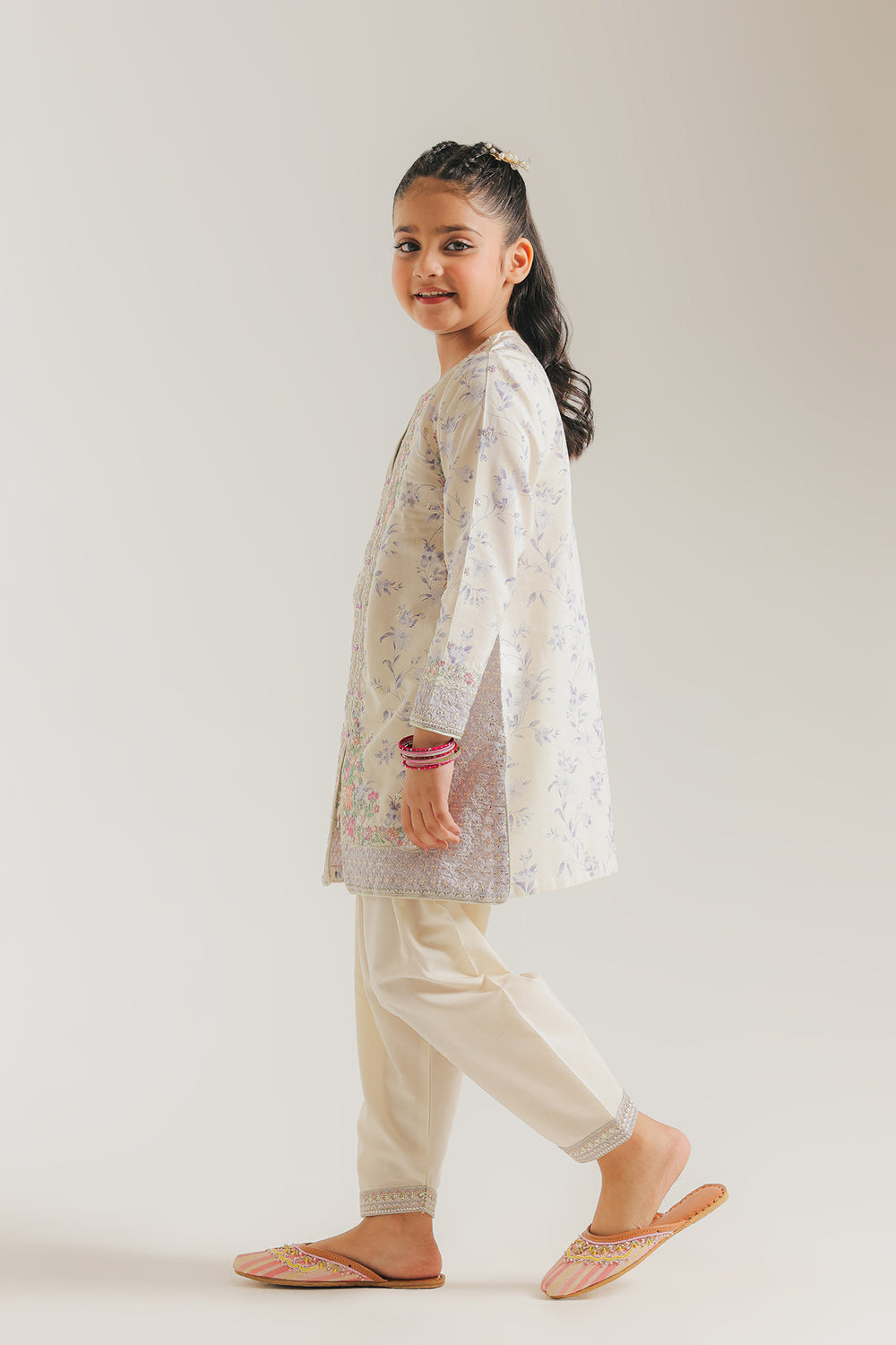 Radiate a sense of pure, ethereal charm in this ivory embroidered suit for girls, where delicate pastel artistry meets traditional grace. The tunic features a sophisticated round neckline with a fine front slit, beautifully adorned with a lush tapestry of blooming floral bouquets in soft peach, mint, and lavender. With its long sleeves and intricate border detailing at the hem and cuffs, the ensemble is perfectly paired with matching tapered shalwar featuring subtle botanical accents. It is an enchanting fusion of artisanal craftsmanship and modern luxury, ideal for any special celebration.