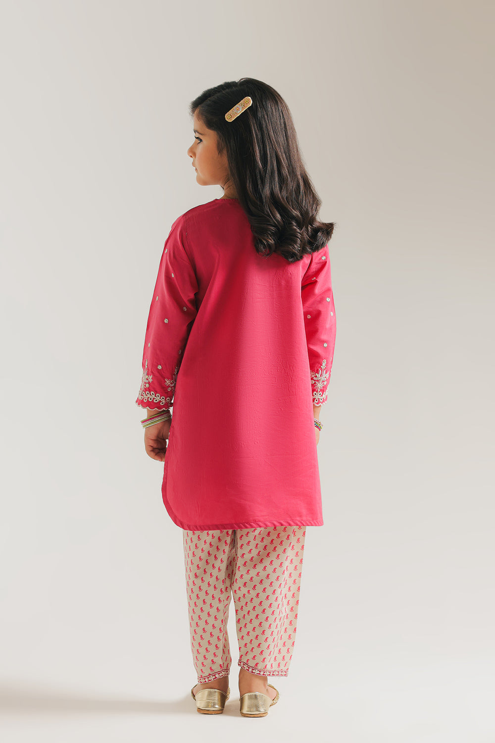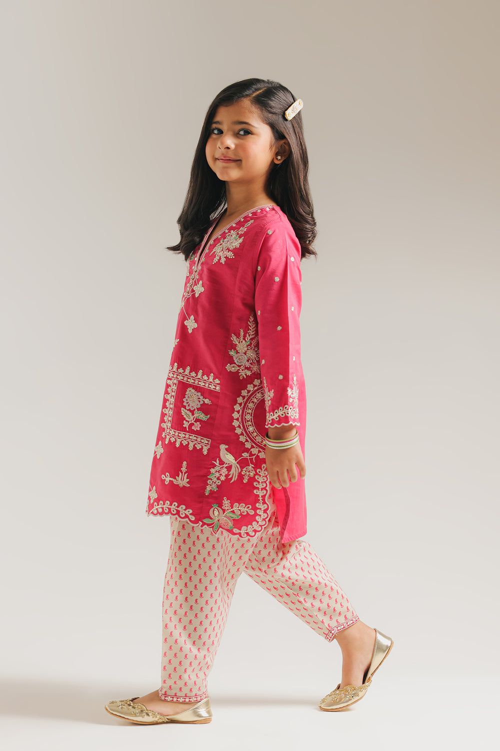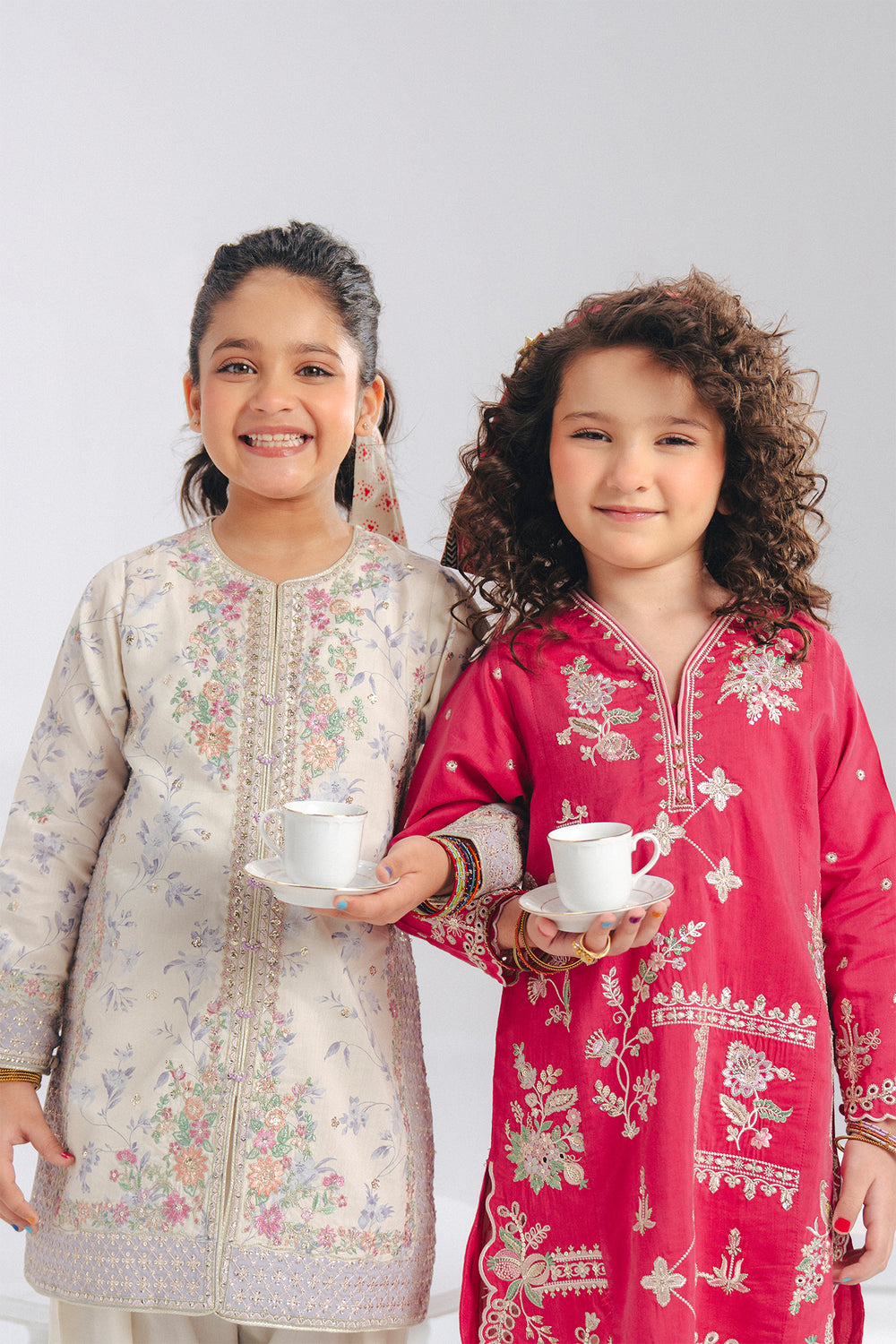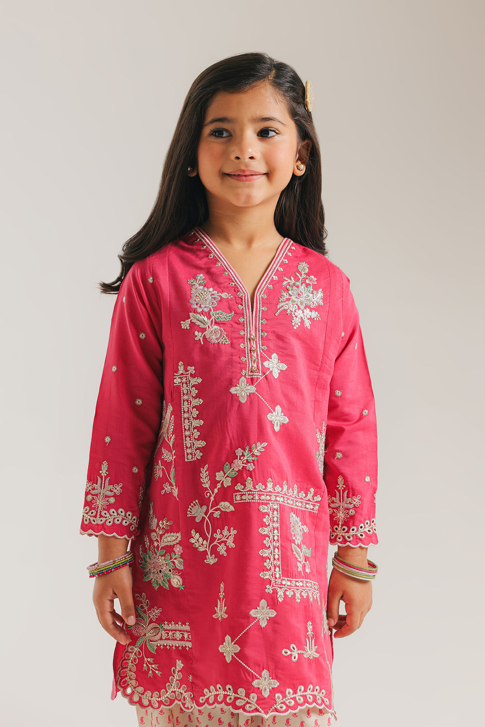 This striking magenta embroidered suit for girls is a vibrant celebration of playful elegance and artisanal detail, making it an enchanting choice for festive occasions. The long-sleeved tunic features a rich pink canvas meticulously adorned with intricate floral embroidery that dances across the bodice and hemline. Designed with a sophisticated V-neckline and delicate scalloped edges, the shirt is perfectly paired with cream-colored trousers featuring a charming all-over pink polka-dot pattern. Crafted with a comfortable, relaxed silhouette, this ensemble offers a joyful burst of color and a refined finish that ensures she feels both stylish and spirited at every celebration.