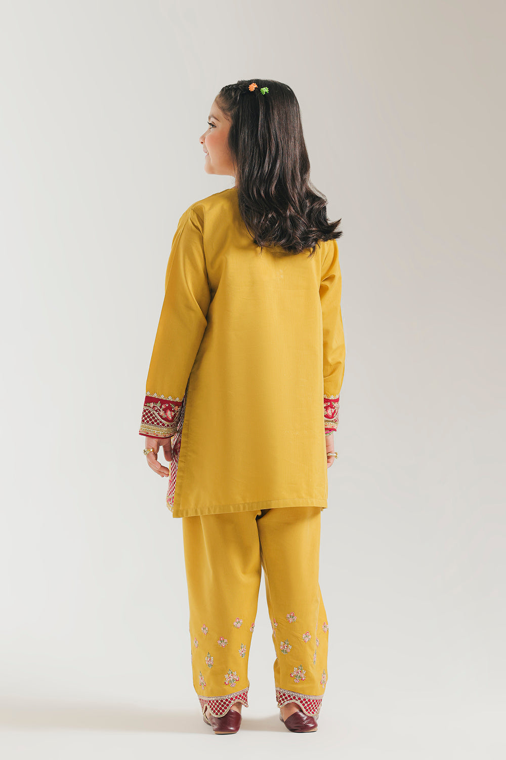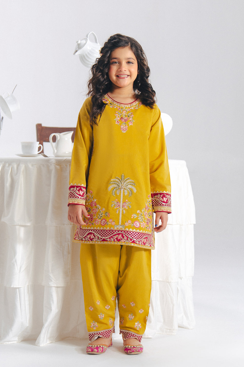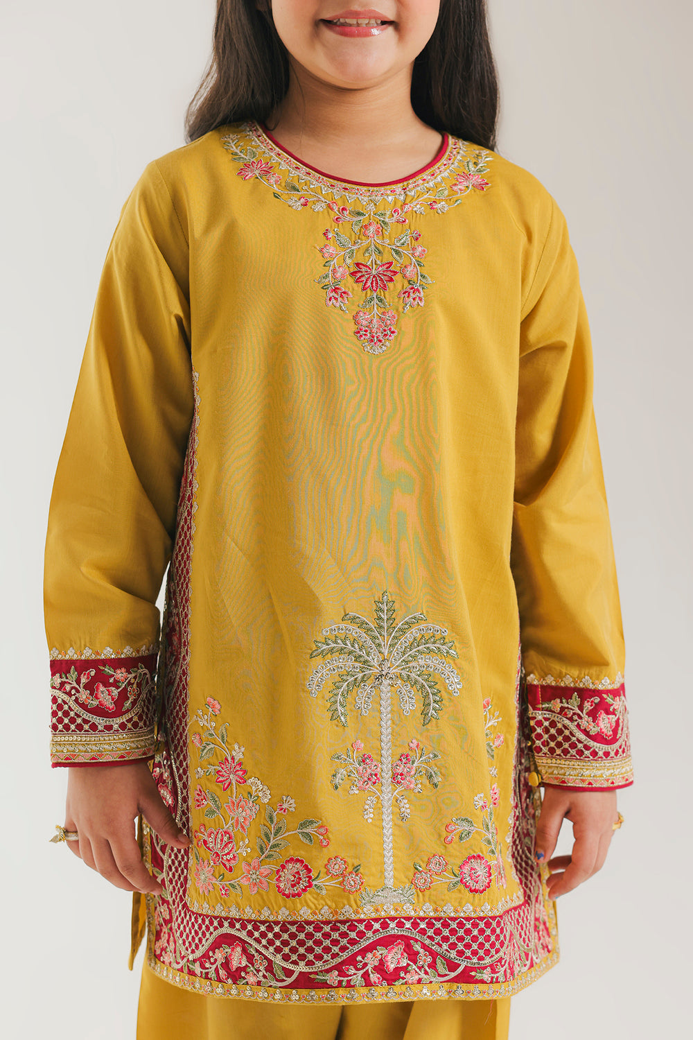 Radiate vibrant joy in this mustard-yellow embroidered suit for girls, featuring a graceful shirt adorned with a whimsical palm tree motif and lush floral borders in shades of fuchsia and emerald. The design is elevated by intricate embroidery along the neckline and cuffs, perfectly paired with matching tapered shalwar that feature delicate botanical accents at the hem. It is an enchanting fusion of playful artistry and traditional elegance, ideal for any festive occasion.