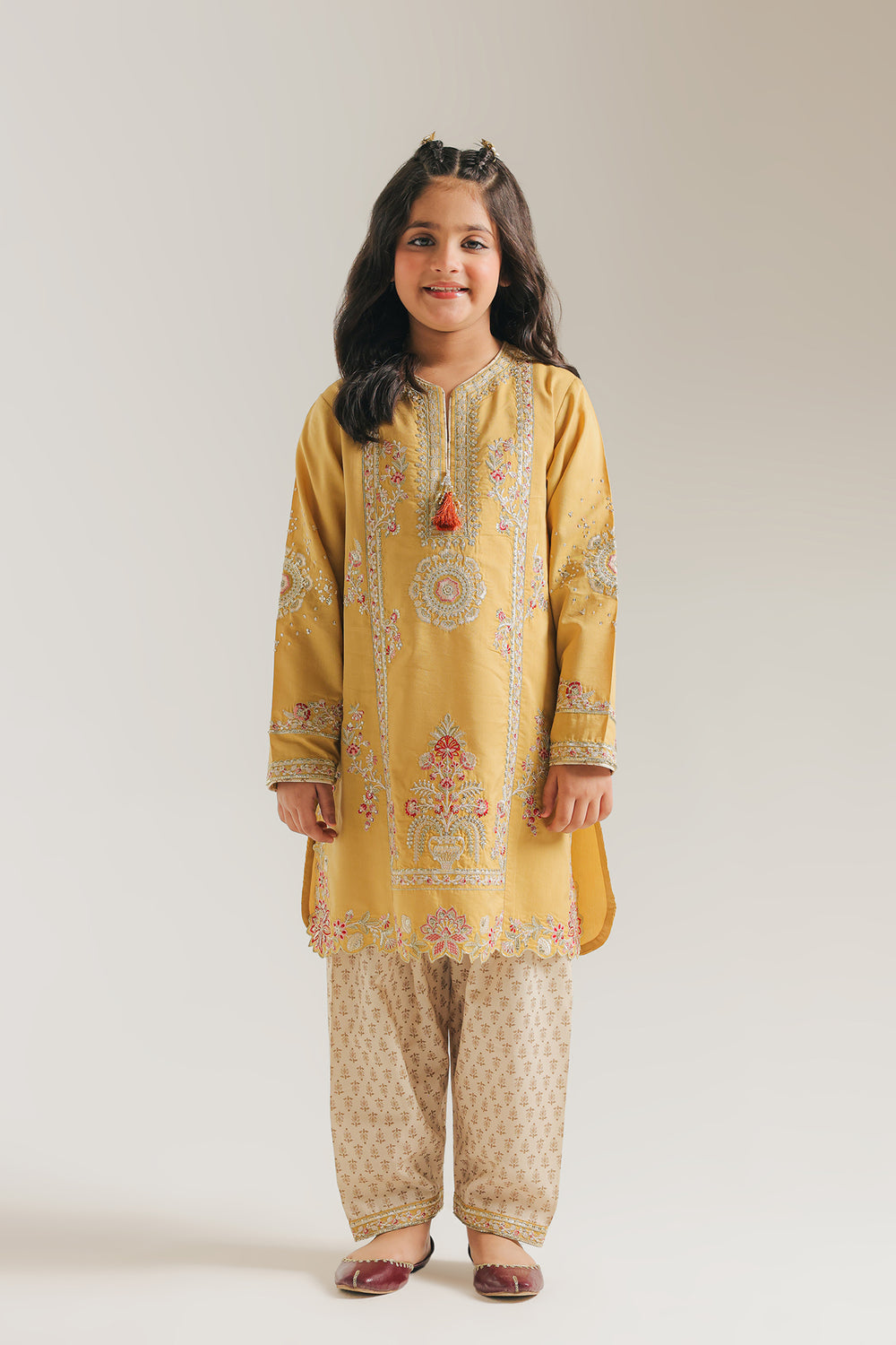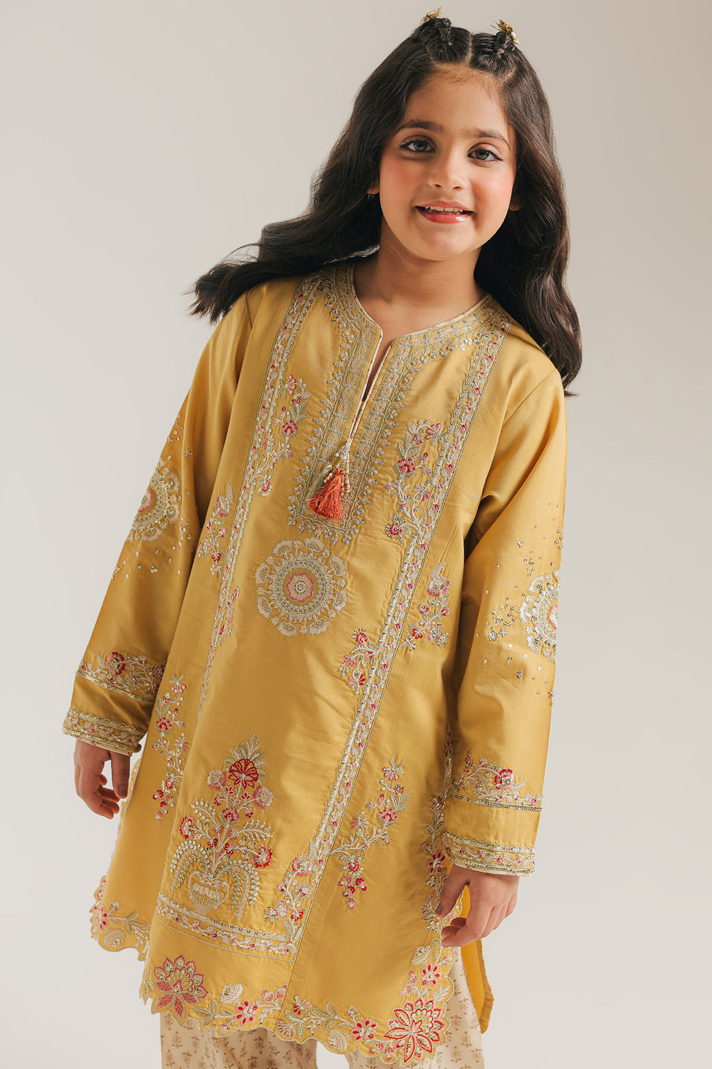 Elevate your Kids ethnic wardrobe with this exquisitely crafted embroidered suit. The kurta showcases intricate Resham silk thread work and delicate floral embroidery in harmonious shades of pink, white, and sage green, anchored by a vibrant orange tassel at the neckline. The sophisticated scalloped hem adds refined detailing that speaks to superior craftsmanship. Paired with cream-colored shalwar bottoms featuring a subtle repeating floral print, this ensemble achieves perfect balance.