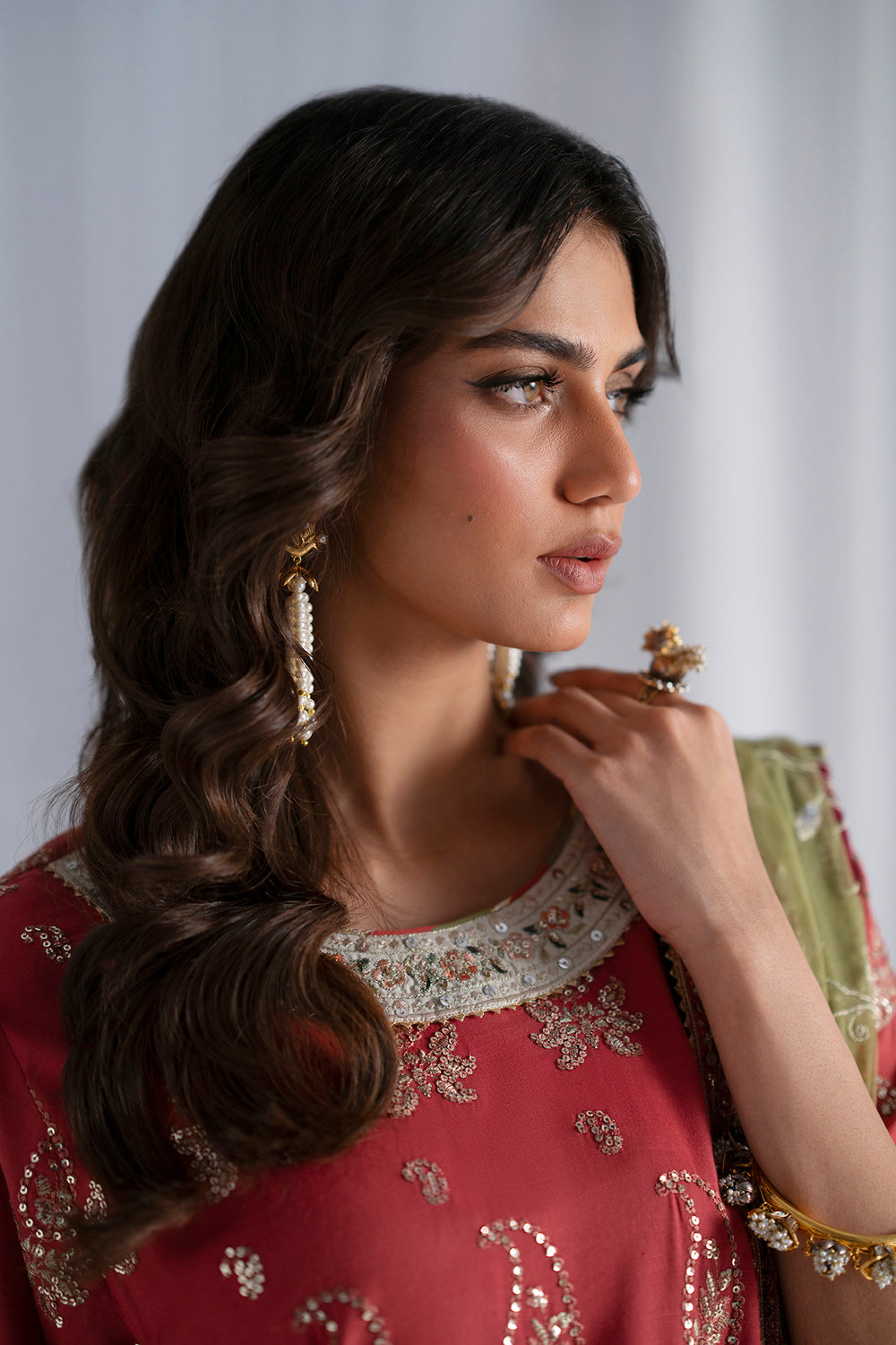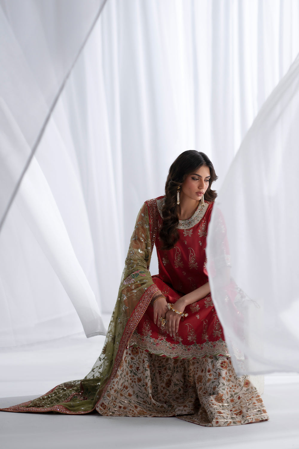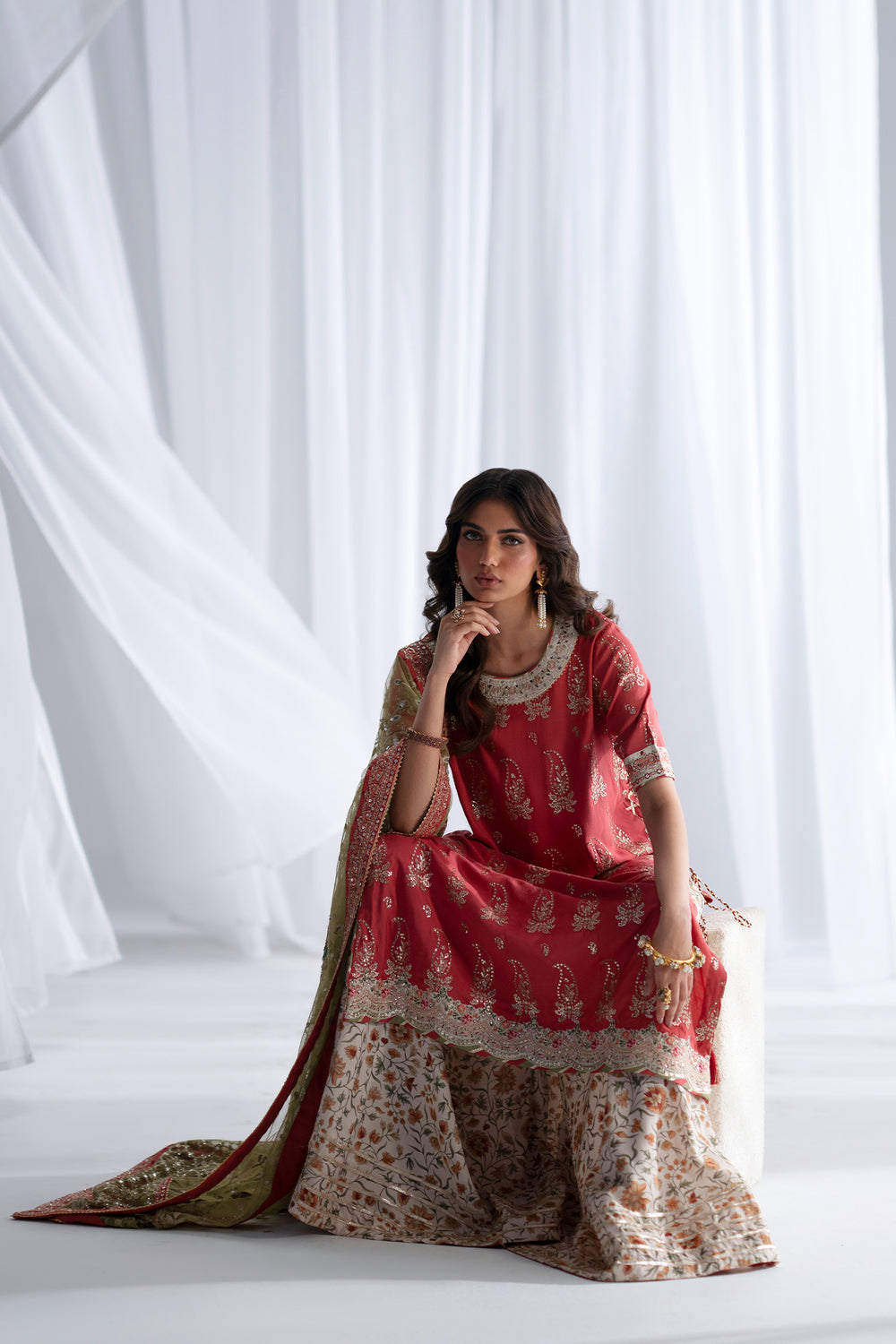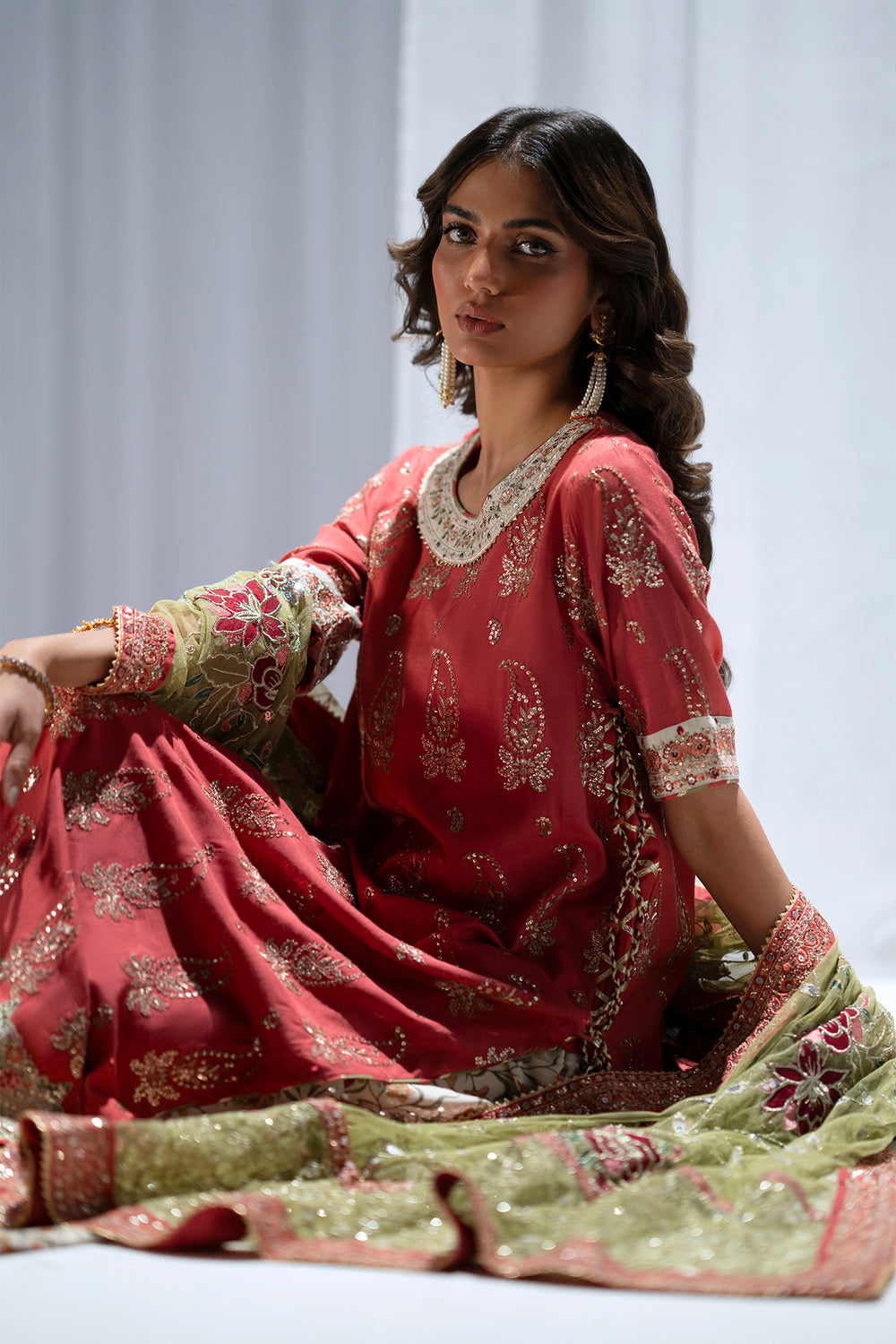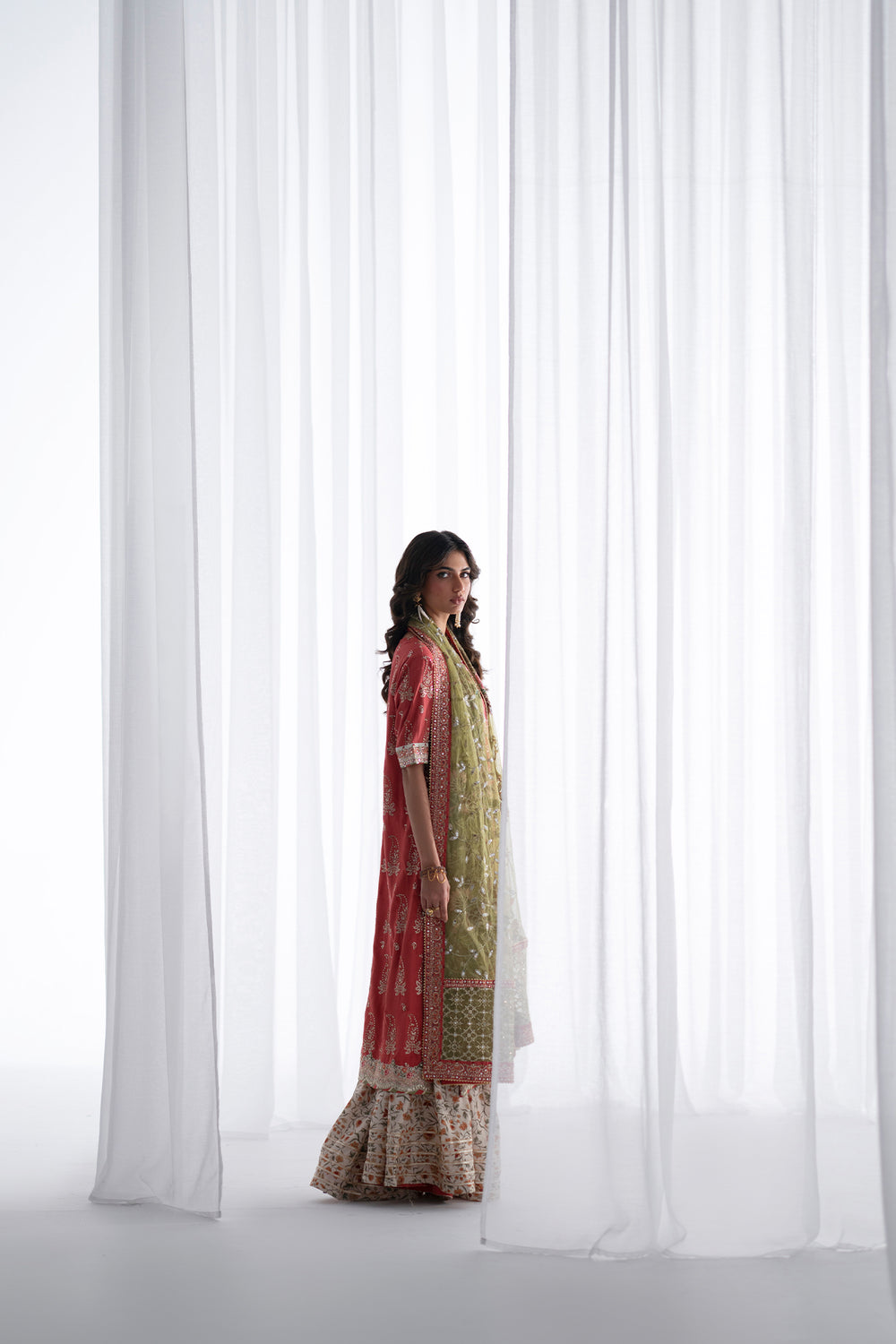 Immerse yourself in sheer opulence with this breathtaking embroidered ensemble. The A-line shirt, crafted in a soft coral hue, is lavishly adorned with intricate silver and gold sequin work in floral and paisley motifs that cover the entire bodice and sleeves. The neckline, hem, and half-length sleeves are accentuated with a contrasting multicolored embroidered border, adding depth and vibrant detail to the design. The look is elevated with a contrasting printed sharara, finished with delicate gotta at the hem for a regal, well-balanced silhouette. Completing this luxurious outfit is a mild green dupatta, richly embellished with vine and floral embroidery and framed with coral borders featuring heavy thread and sequin work. Perfect for weddings or formal celebrations, this ensemble promises a truly captivating and unforgettable appearance.