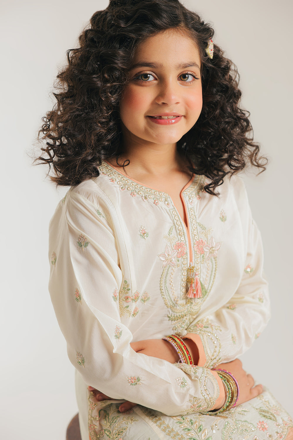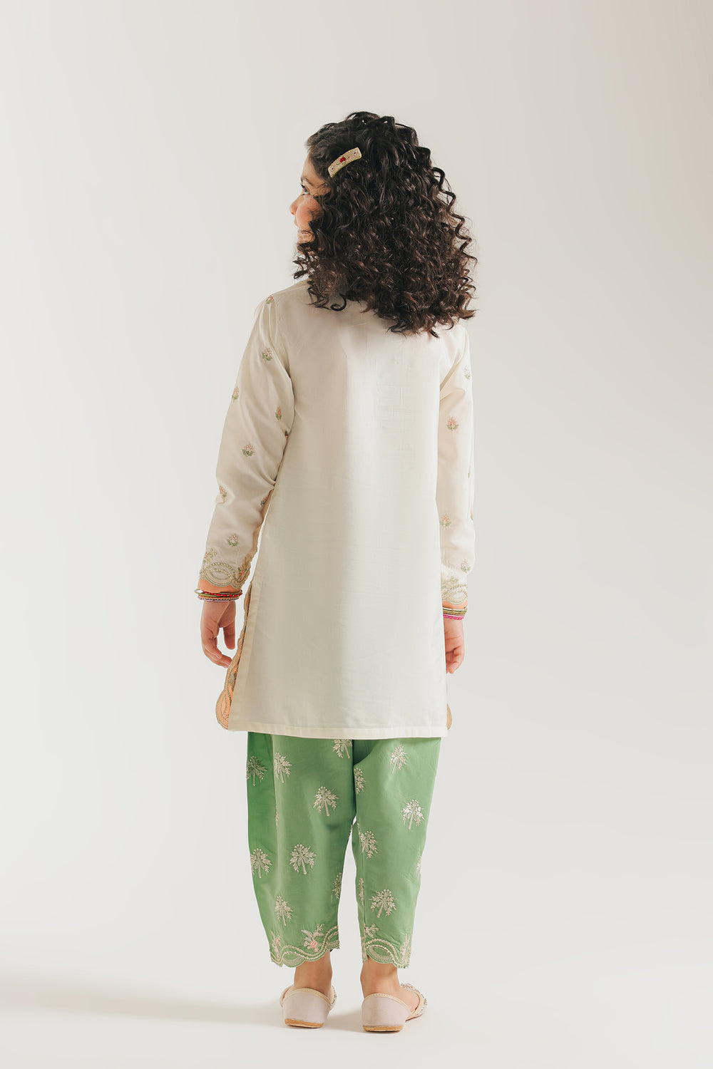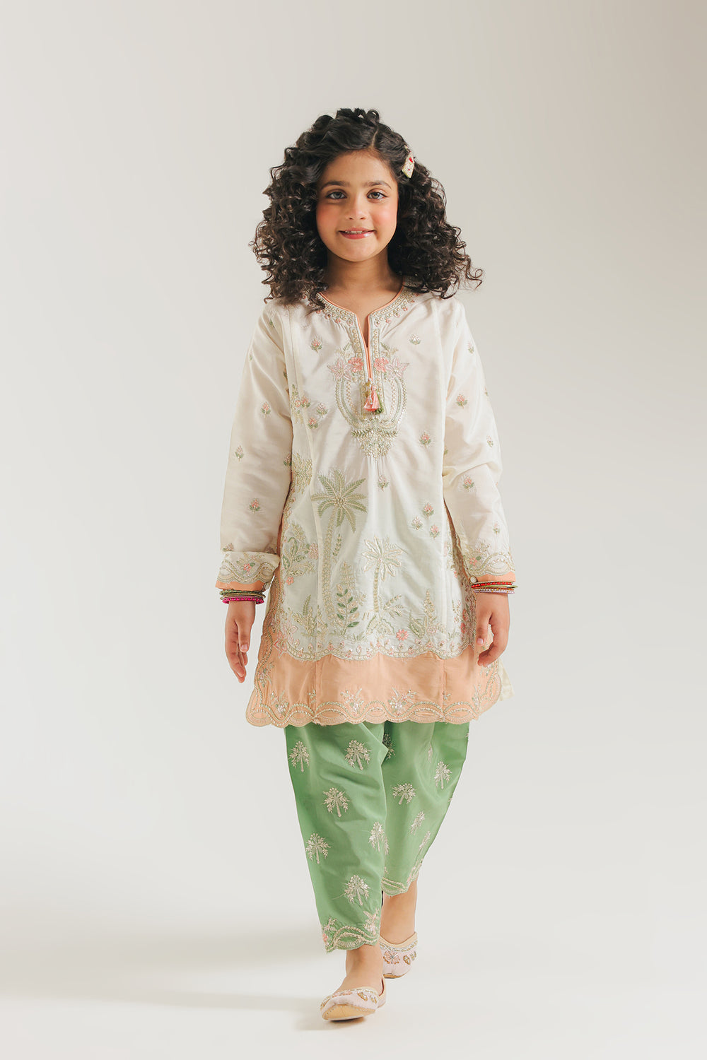 This sophisticated two-piece suit combines timeless elegance with intricate craftsmanship. The ivory kurta features a structured silhouette with a graceful Y-neckline embellished with delicate floral work and a centered tassel accent. A stunning garden scene—complete with palm trees and flowering vines in mint, blush, and coral—adorns the front panel. The peach organza hemline showcases scalloped detailing and ornate white threadwork, while matching embroidered cuffs with pink piping complete the sleeves. The vibrant mint green tapered shalwar is adorned with subtle, repeating floral motifs, creating a harmonious, textured contrast with the smooth ivory top.