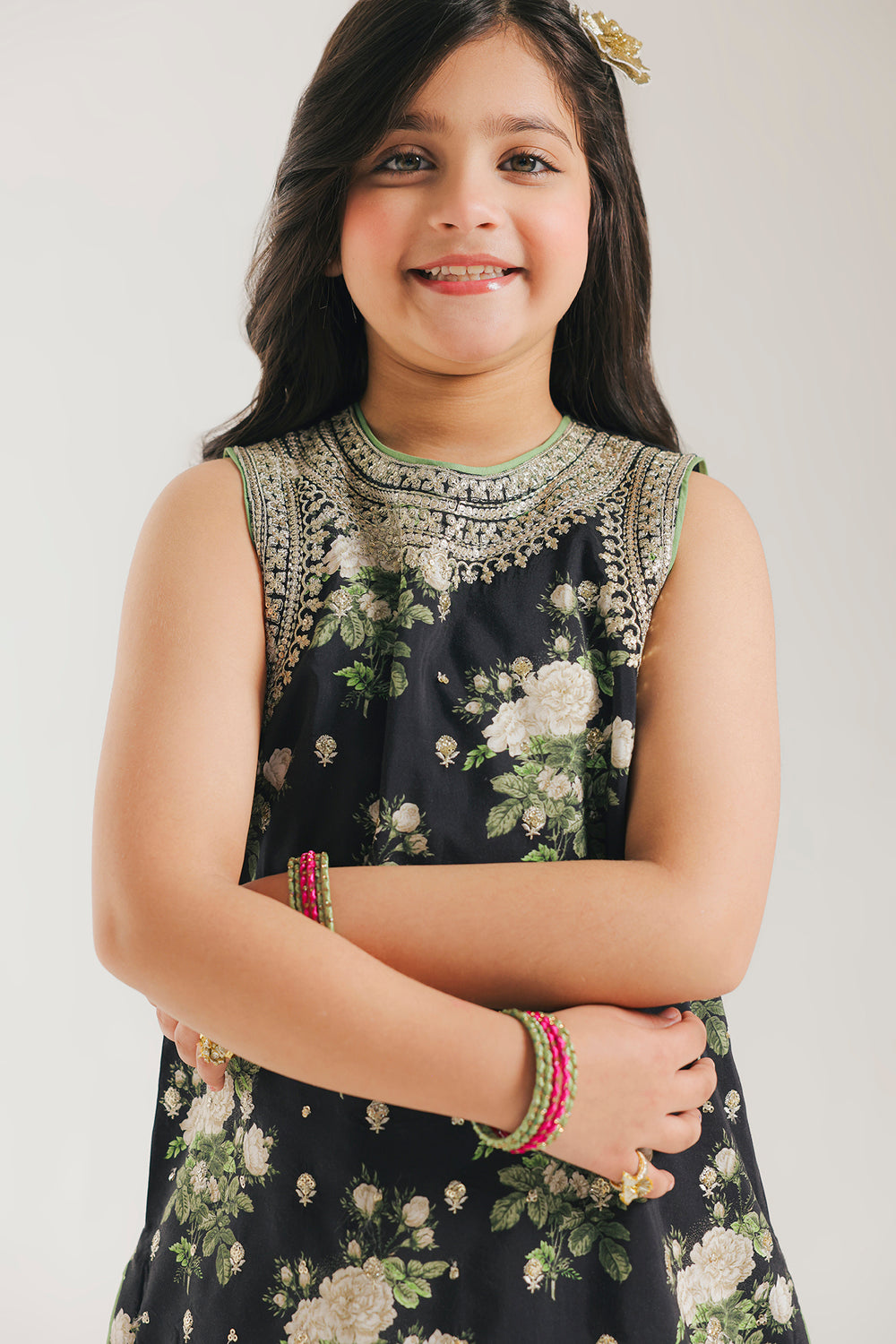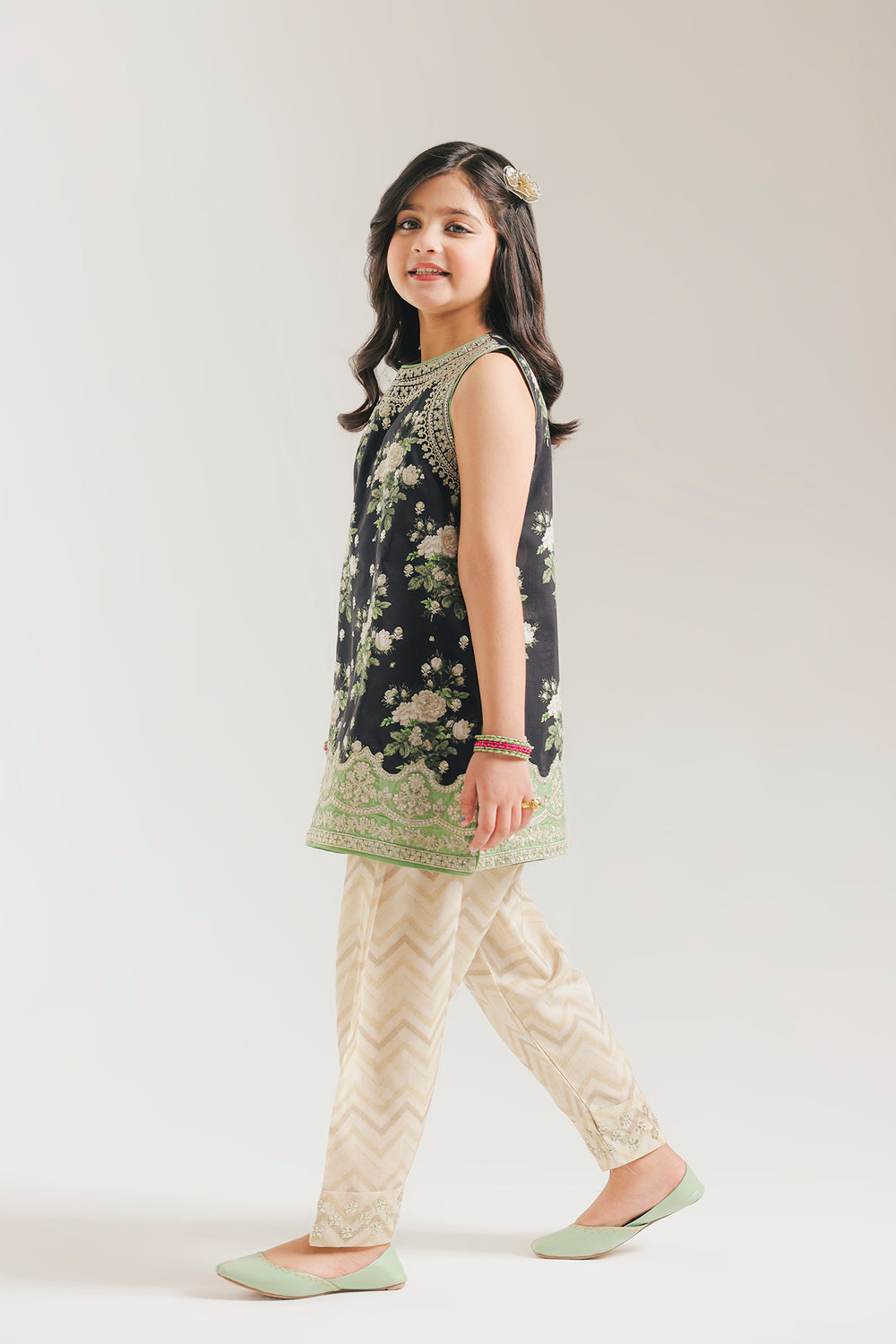 Make a sophisticated and festive statement with this black embroidered suit, featuring a sleeveless tunic that exudes a modern yet traditional charm. The shirt is anchored by a high, rounded neckline intricately detailed with shimmering silver and white embroidery. The tunic is adorned with a lush all-over print of ivory roses and green foliage, perfectly complemented by a dense, decorative mint-green embroidered border along the hemline. This ensemble is paired with cream-colored shalwar featuring a subtle gold chevron pattern and delicate embroidered borders at the ankles. This look offers a polished and graceful aesthetic for any special occasion.