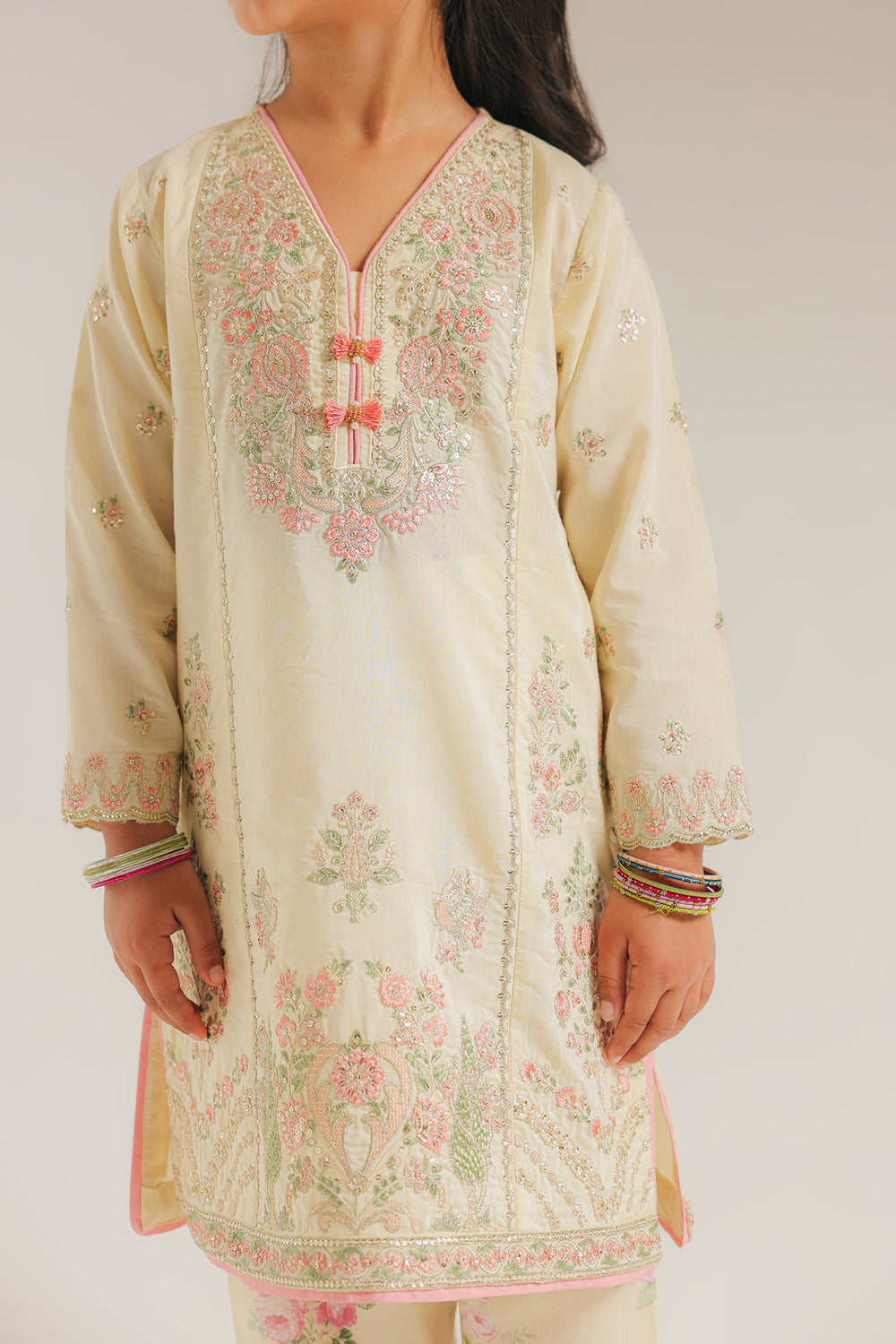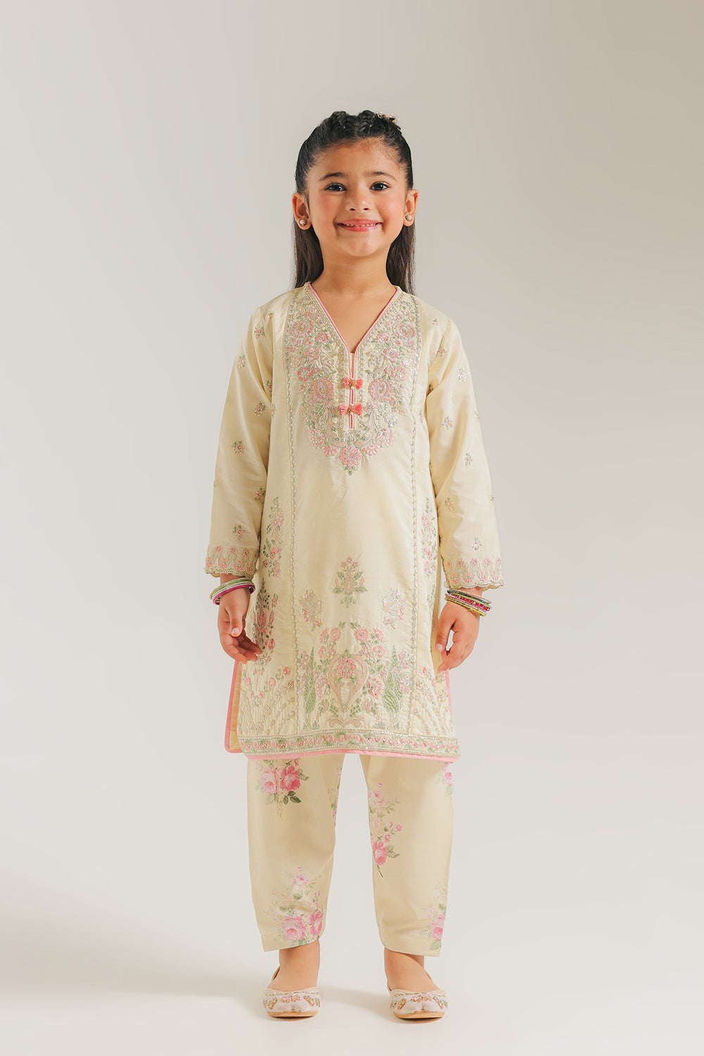This vibrant yellow embroidered suit for girls is a radiant fusion of traditional charm and playful energy, making it an exquisite choice for festive celebrations. The long-sleeved tunic features a sunny pale-yellow canvas beautifully elevated by intricate floral embroidery in shades of coral, white, and teal that frame the neckline and adorn the front. Designed with a sophisticated split neckline and delicate embroidered detailing on the sleeves and hem, the shirt is perfectly paired with coordinating shalwar that feature a whimsical diagonal striped pattern in matching yellow and white tones. Finished with a decorative embroidered border at the ankles, this ensemble offers a comfortable, breezy silhouette and a joyful burst of color that ensures she shines at every special occasion.