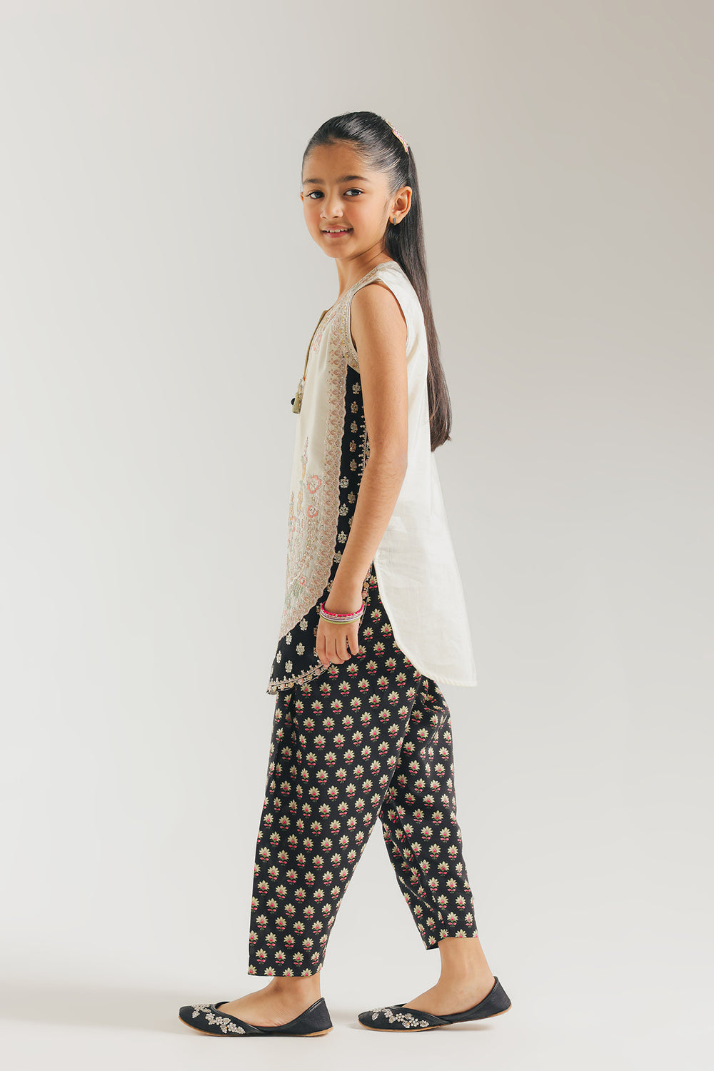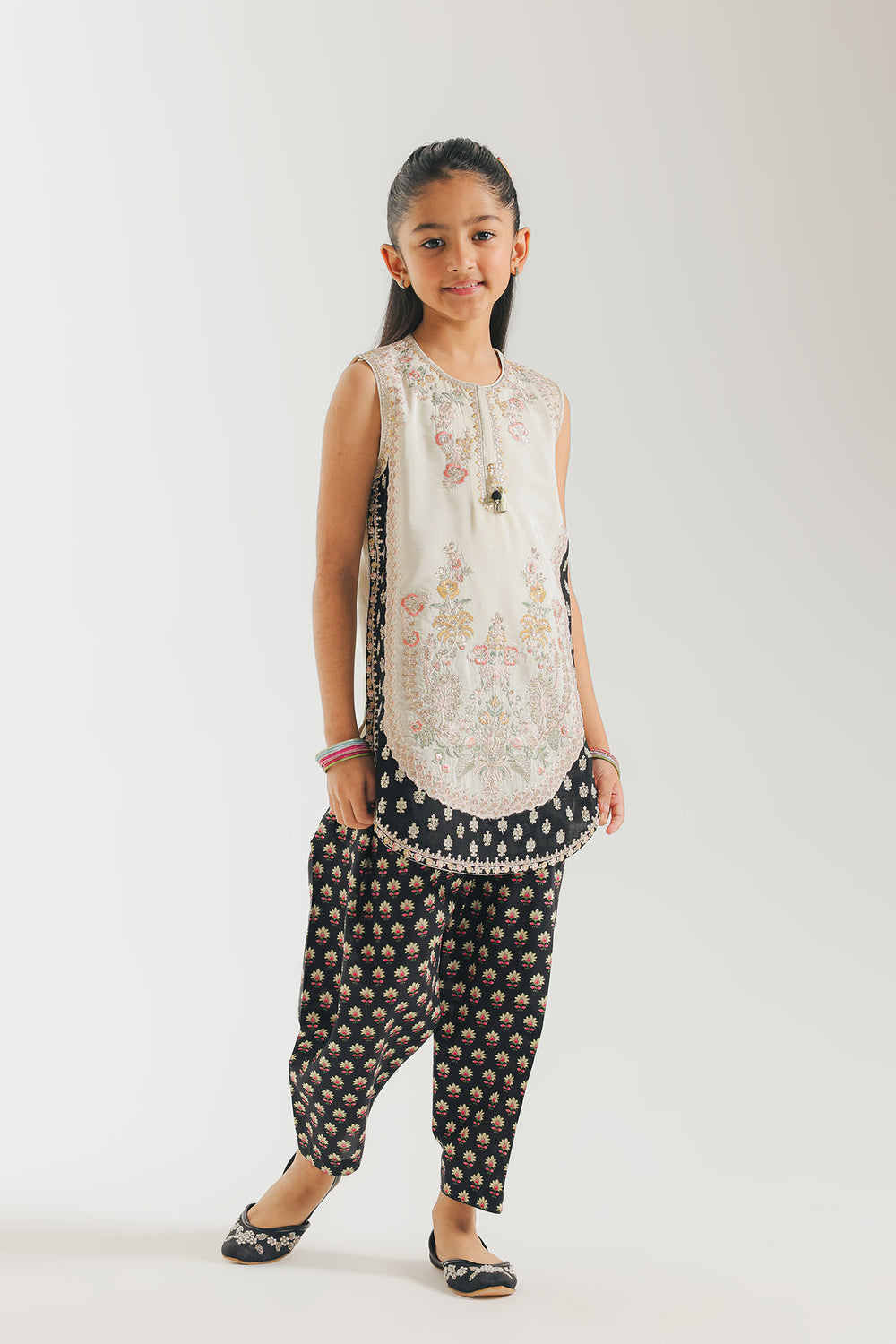 Radiate angelic charm in this ivory embroidered suit for girls, featuring a sleeveless tunic adorned with a whimsical tapestry of pastel floral motifs and delicate shimmering accents. The curved hemline is beautifully detailed, perfectly paired with contrasting black shalwar featuring a dainty golden print. It is an enchanting fusion of playful grace and festive sophistication.