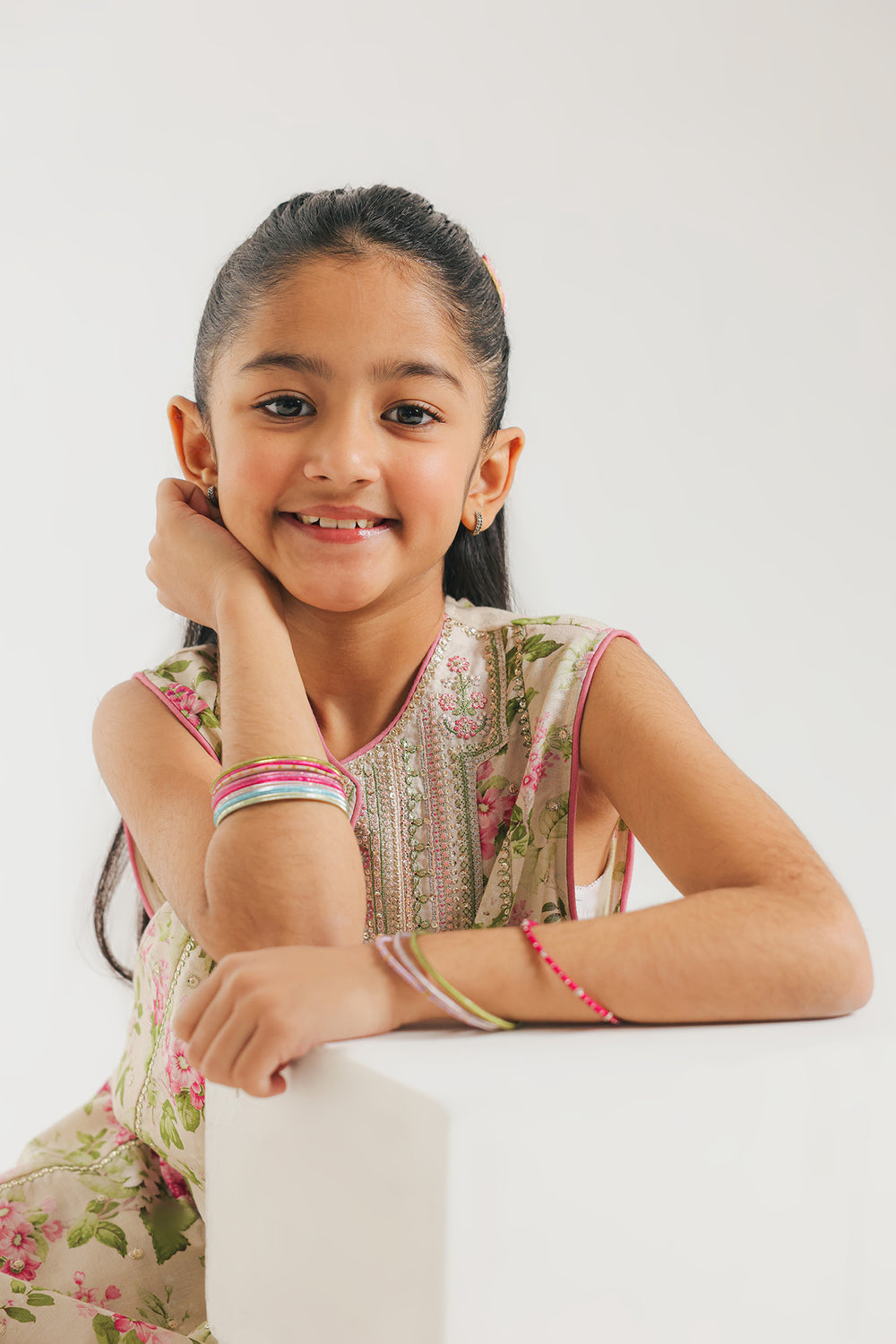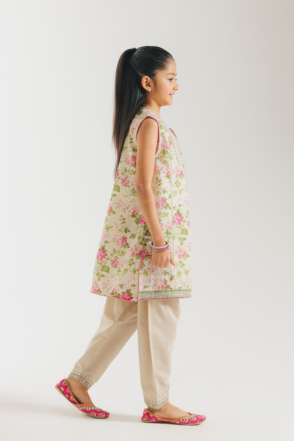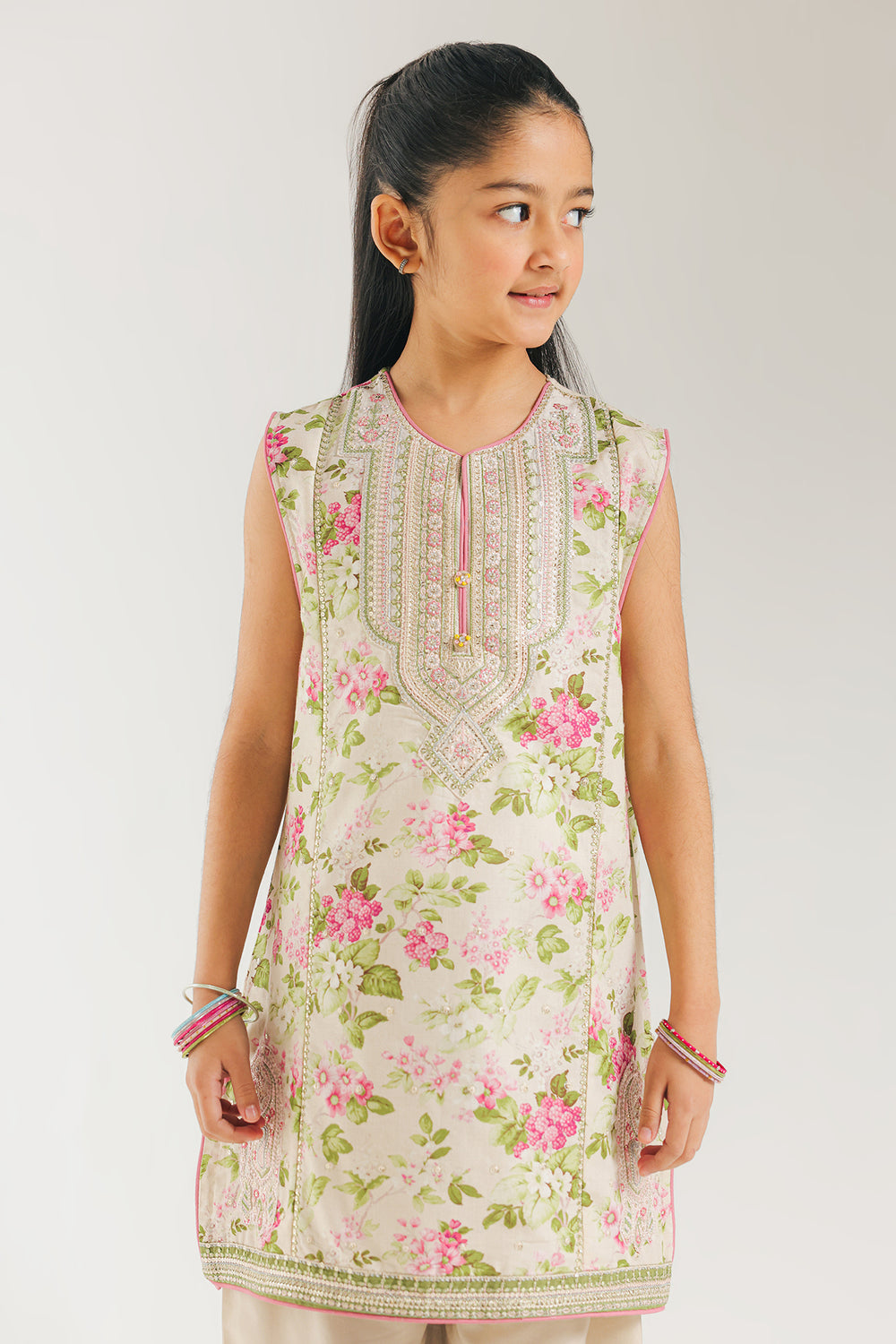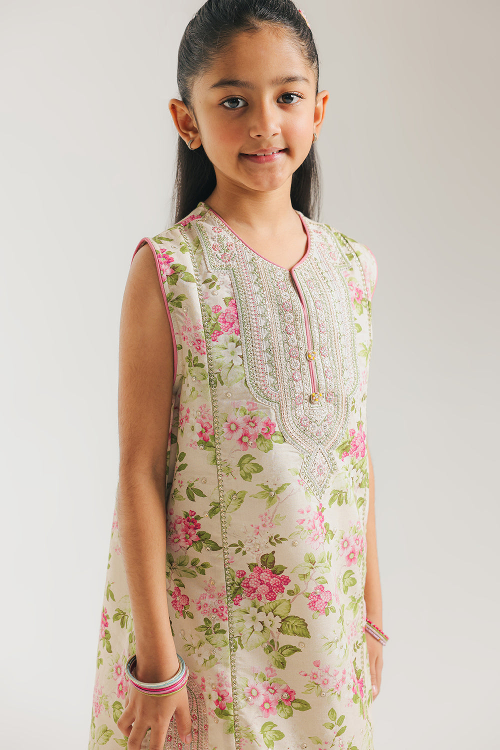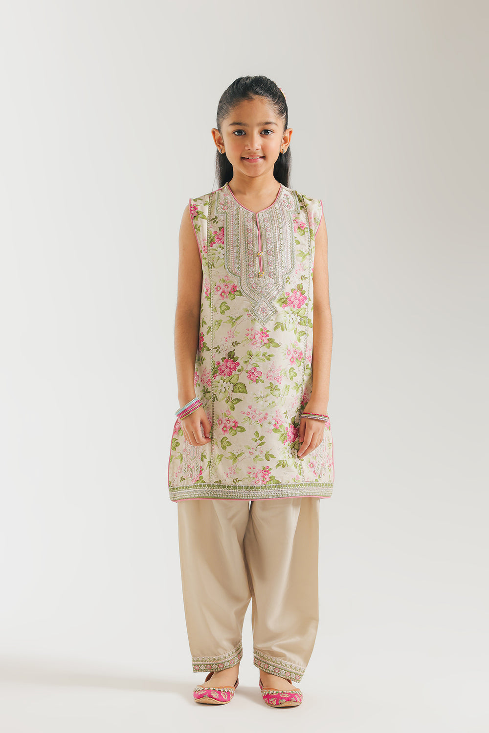 This elegant sleeveless kurta showcases a delicate all-over floral print in rosy pink and sage green tones on a light cream base. The standout feature is the intricately embellished neckline adorned with silver Gota Patti and sequin work, creating a striking bib effect that catches the light beautifully. Complementary silver lace and pink piping detail the hem and side slits, adding refined sophistication. Paired with coordinating cream shalwar pants, this ensemble balances ornate detailing with understated elegance, making it ideal for festive occasions or formal gatherings.