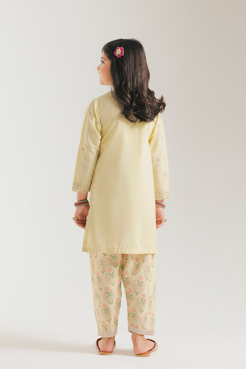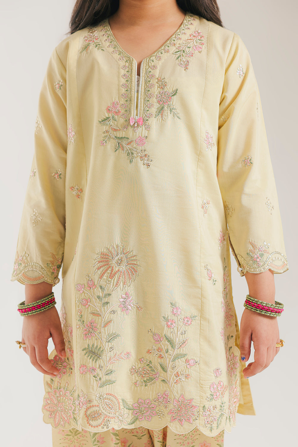 A delightful blend of sunshine hues and soft botanicals, this pale yellow girls' two-piece suit is a charming choice for the young fashionista. The shirt is tailored from premium fabric in a soft, buttery yellow, featuring an all-over delicate floral spray in shades of petal pink and spring green. The design is elevated by an elegant V-split neckline adorned with intricate floral embroidery and a playful pink tassel, while the sleeve cuffs and hemline are finished with matching embroidered borders and a graceful scalloped edge. Complementing the radiant top is a pair of coordinating tulip-style shalwar, featuring a matching all-over floral print and a delicate embroidered border at the ankles for a polished finish. This ensemble offers a perfect balance of traditional grace and youthful energy, making it an ideal choice for daytime celebrations or festive gatherings.