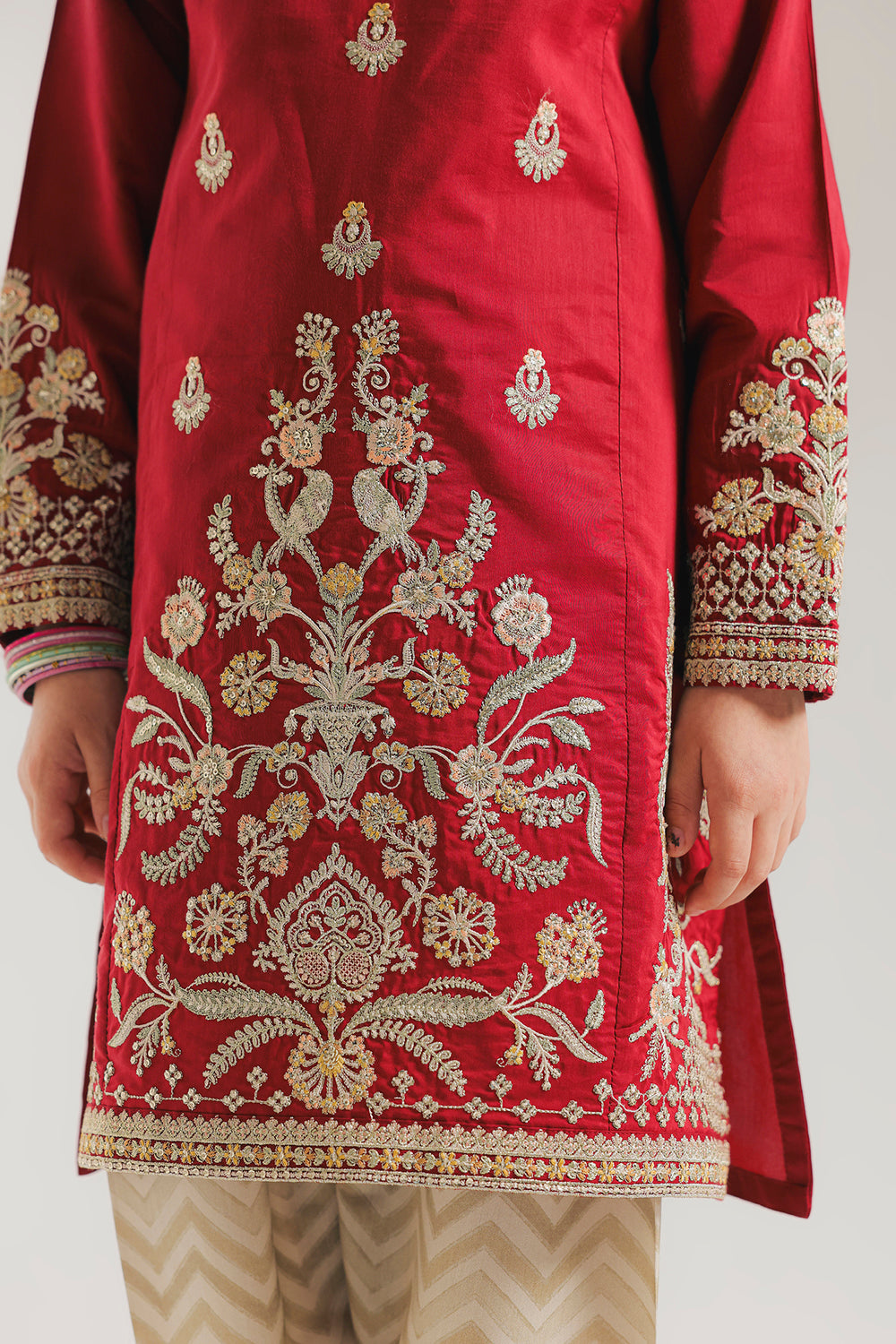 A stunning embroidered ensemble featuring a deep crimson kurta in cotton-silk blend with intricate Resham and Tilla threadwork. The neckline showcases an ornate galapatti design, while heavy floral and vine motifs adorn the lower front. Scattered butis embellish the chest and upper sleeves, with matching embroidered cuff borders on full-length sleeves. Paired with contemporary chevron-patterned shalwar in beige and cream tones, cut in a relaxed tapered fit that balances the richly decorated top. Perfect for festive occasions and celebrations.
