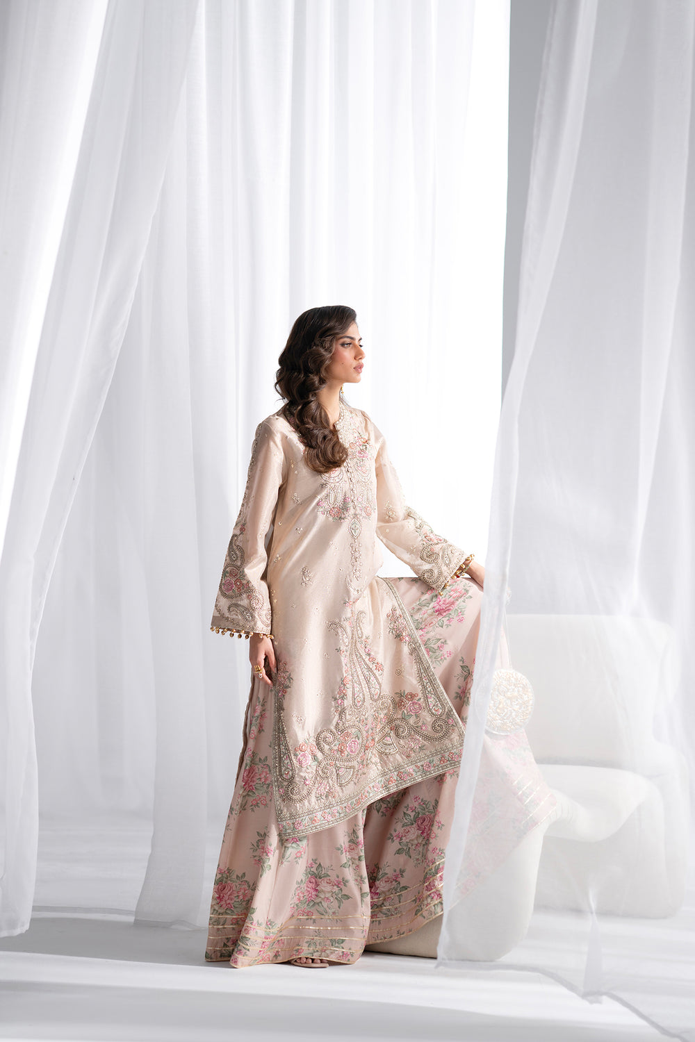 This ethereal ensemble radiates understated luxury in shimmering light beige and champagne silk. The tunic showcases elaborate embroidery concentrated down the center front and neckline, featuring grand paisley patterns executed in subtle metallic silver and gold threads, delicate beads, and soft rose pink and muted green accents. Full-length sleeves with gentle flare at the cuffs are adorned with matching embroidery and finished with delicate gold tassel-like embellishments. The straight, elongated cut extends well past the knees, creating an elegant drape. Paired with flowing wide-legged sharara, this refined composition balances ornate detailing with minimalist silhouettes. Perfect for formal celebrations, weddings.
