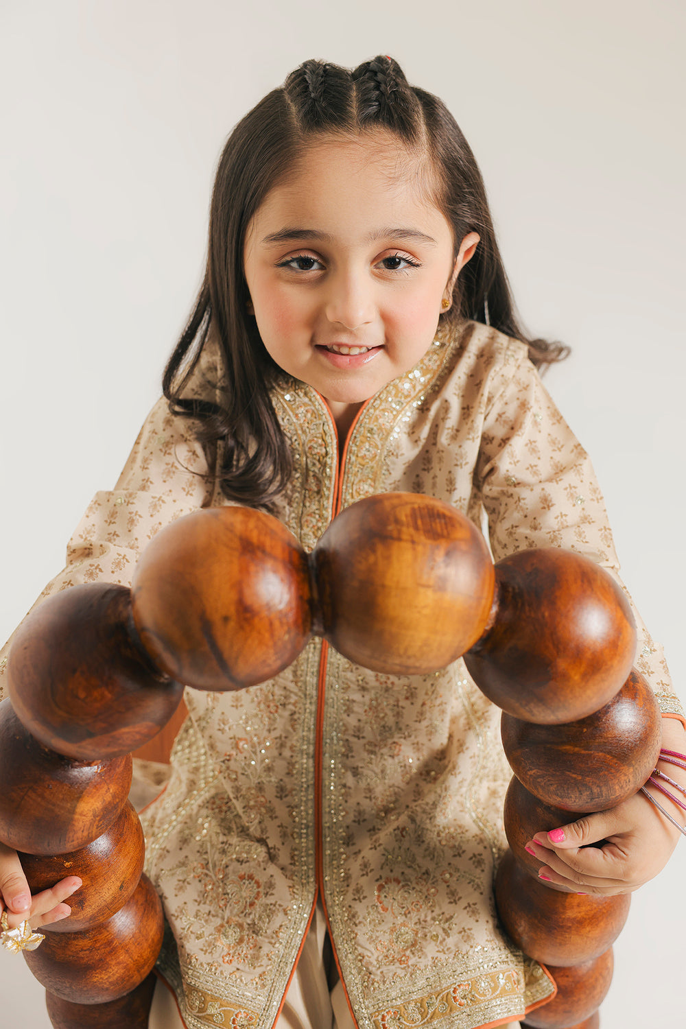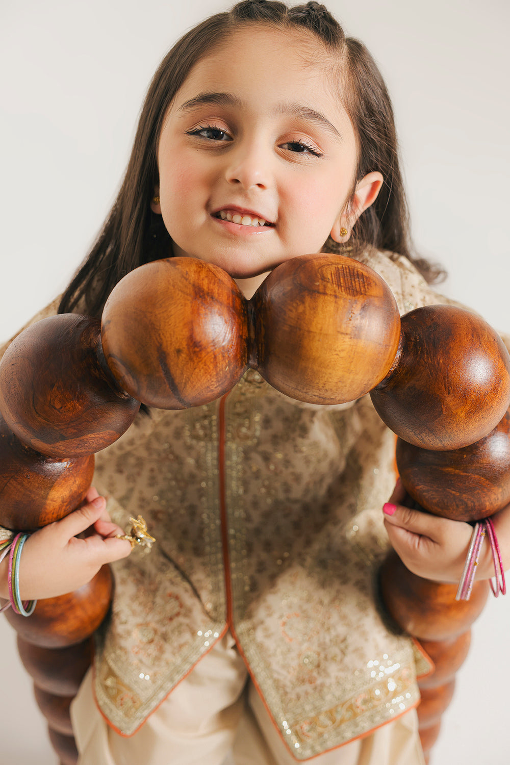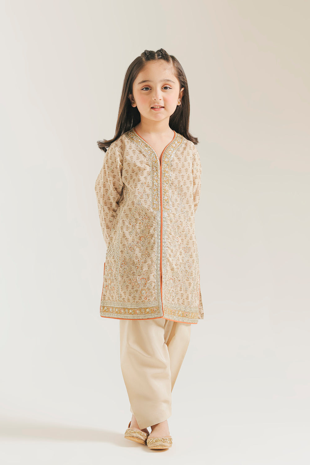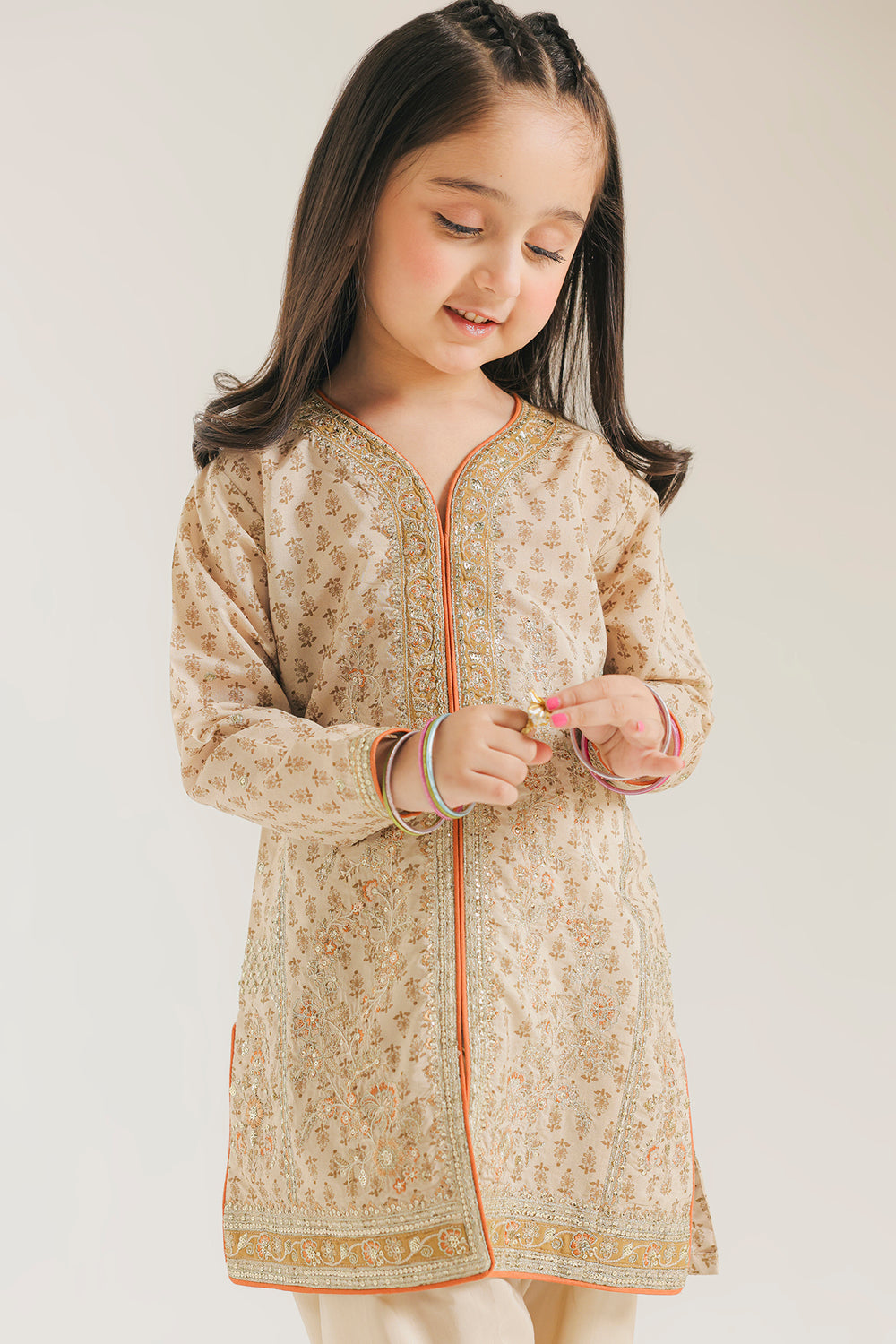 Antique White kurta adorned with intricate gold embroidery featuring all-over floral motifs and embellished front detailing. The rounded neckline is finished with a detailed border, while the straight-cut silhouette includes graceful side slits. This refined two-piece ensemble embodies understated luxury and effortless elegance, ideal for festive and semi-formal occasions. Stitched to perfection in antique white, it's a timeless addition to any celebration wardrobe.