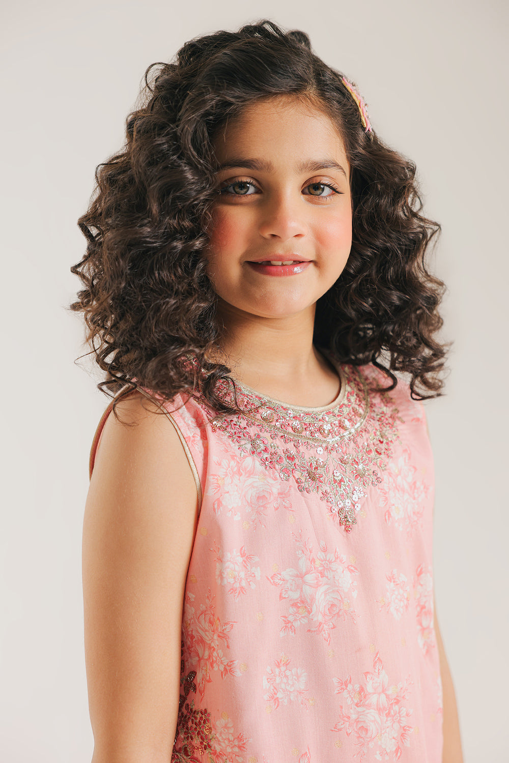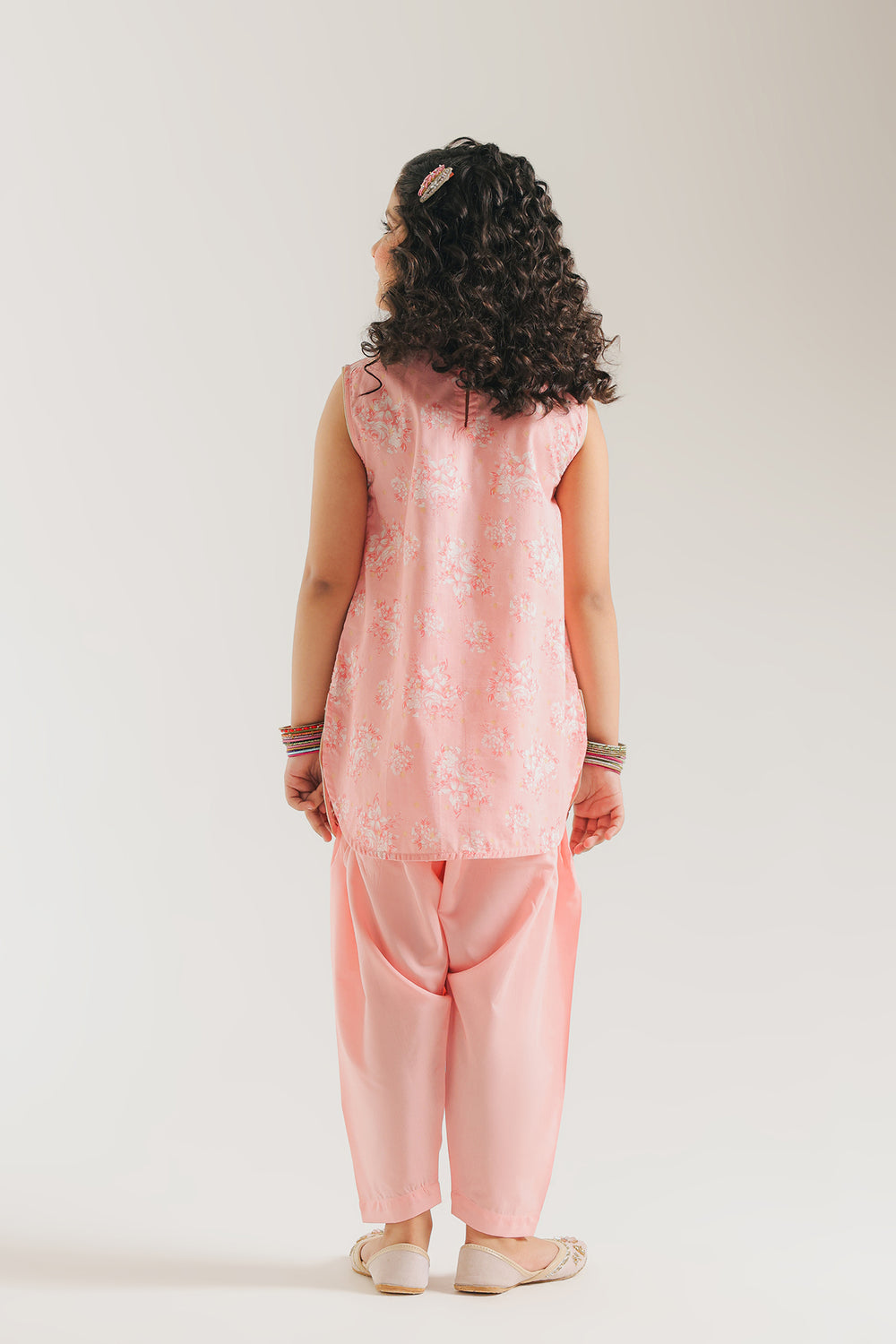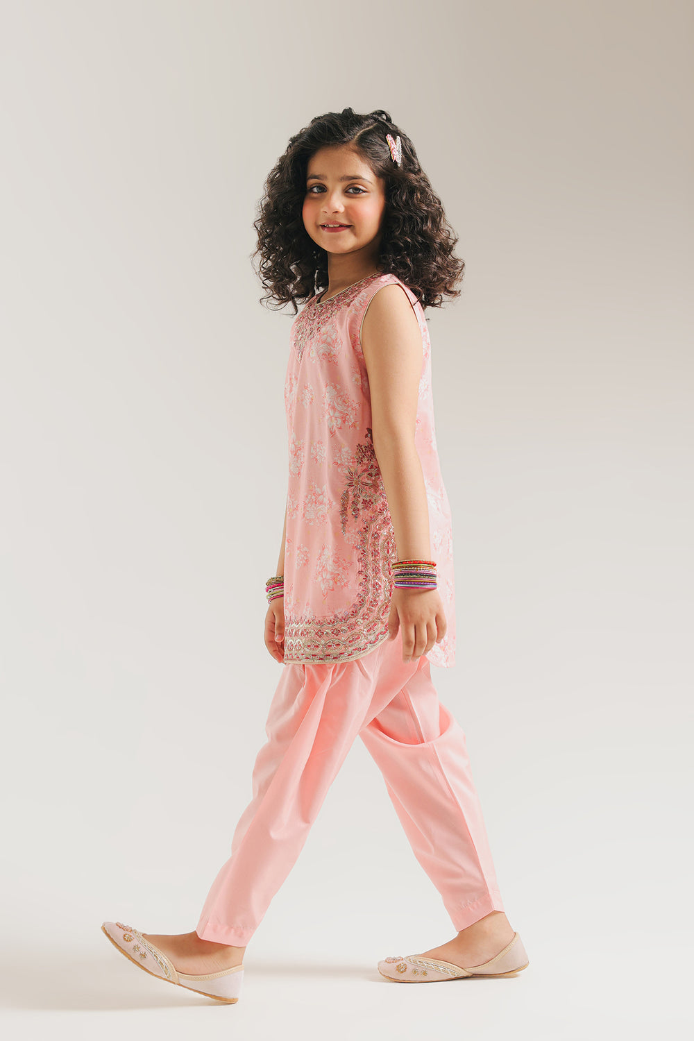 Gift her a vision of springtime grace with this coral pink embroidered suit, a perfect ensemble for festive daytime celebrations. The sleeveless tunic is rendered in a soft, luminous pink hue, featuring a delicate all-over white botanical print that adds a layer of ethereal charm. The design is elevated by a rounded neckline adorned with intricate silver and pink floral embroidery, while the hemline is finished with a meticulously detailed border. Paired with matching shalwar, this suit offers a breezy and comfortable silhouette that ensures she stays stylish and at ease during every special family gathering.