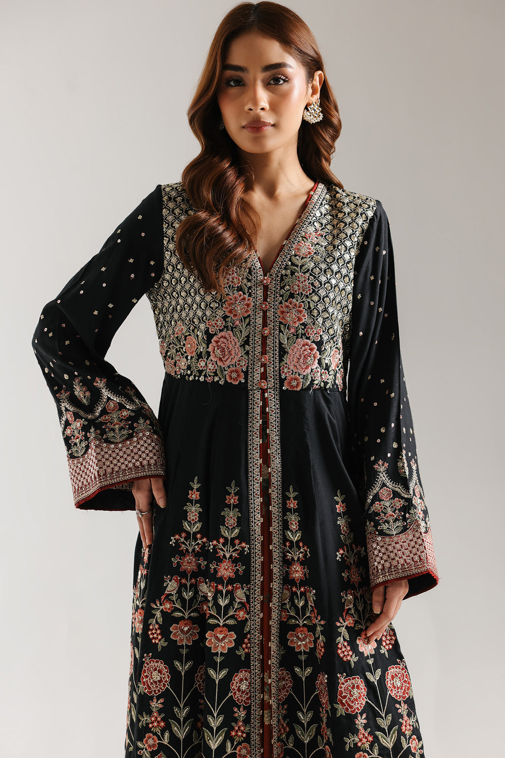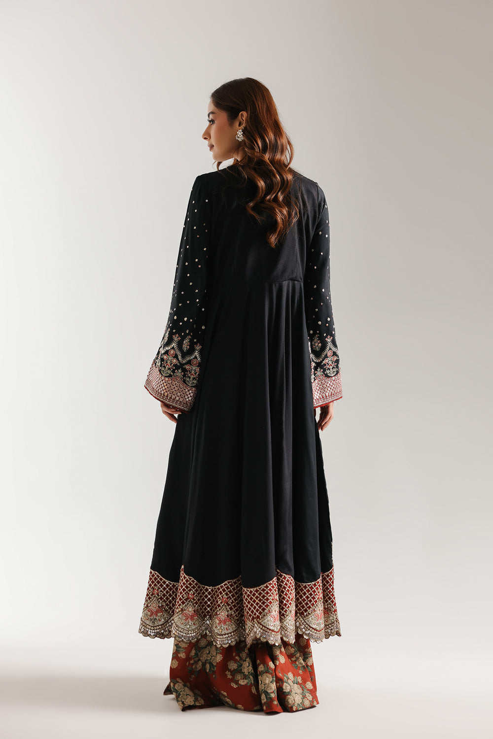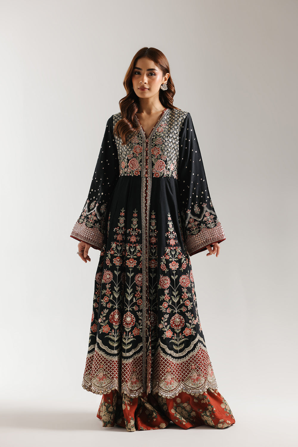 Introducing an exquisite embroidered suit that epitomizes timeless elegance. This stunning ensemble features a dramatic black open-front jacket with an expertly cinched waist that flows into a graceful Anarkali silhouette, complemented by long, subtly flared sleeves. The outer layer showcases intricate embroidery with dense floral motifs in rich reds, pinks, and corals. Layered over a coordinating red/maroon inner garment adorned with its own delicate patterns, this piece combines sophisticated draping with meticulous handwork. Gold and silver embellishments accentuate the cuffs and neckline, creating a refined, luxurious aesthetic. Perfect for weddings, formal celebrations, and special occasions.