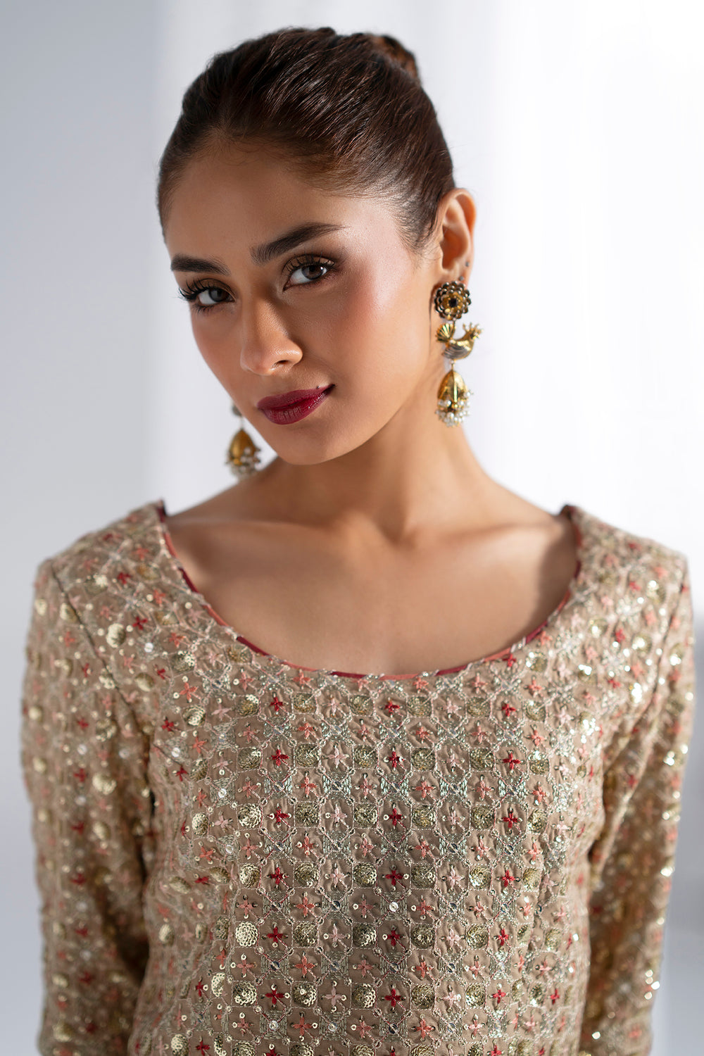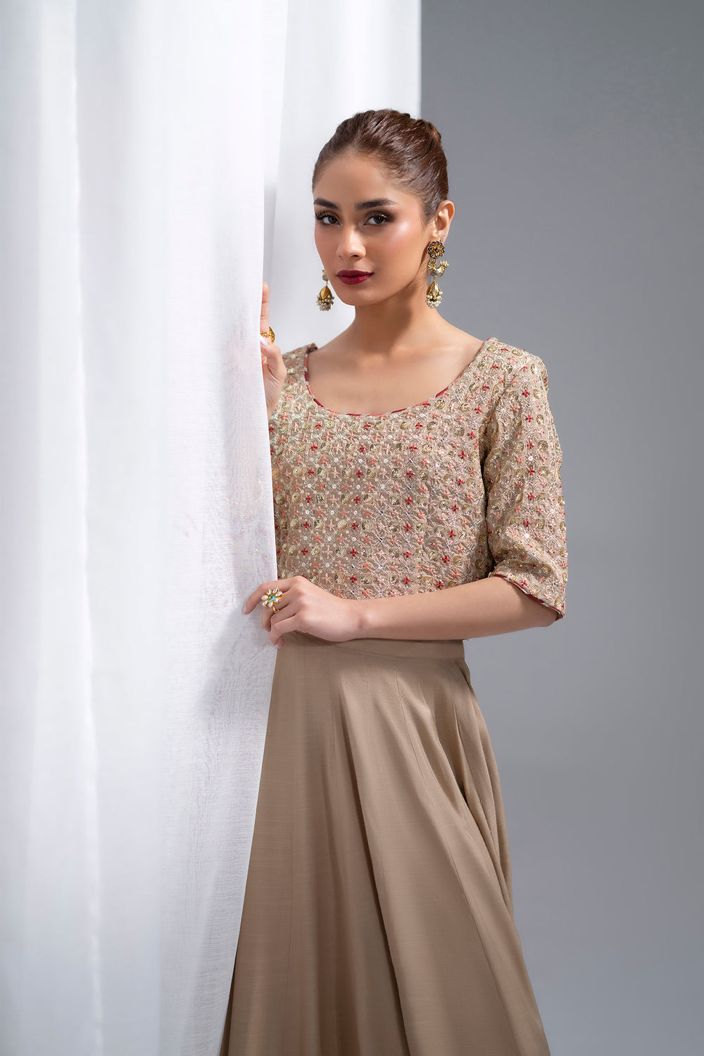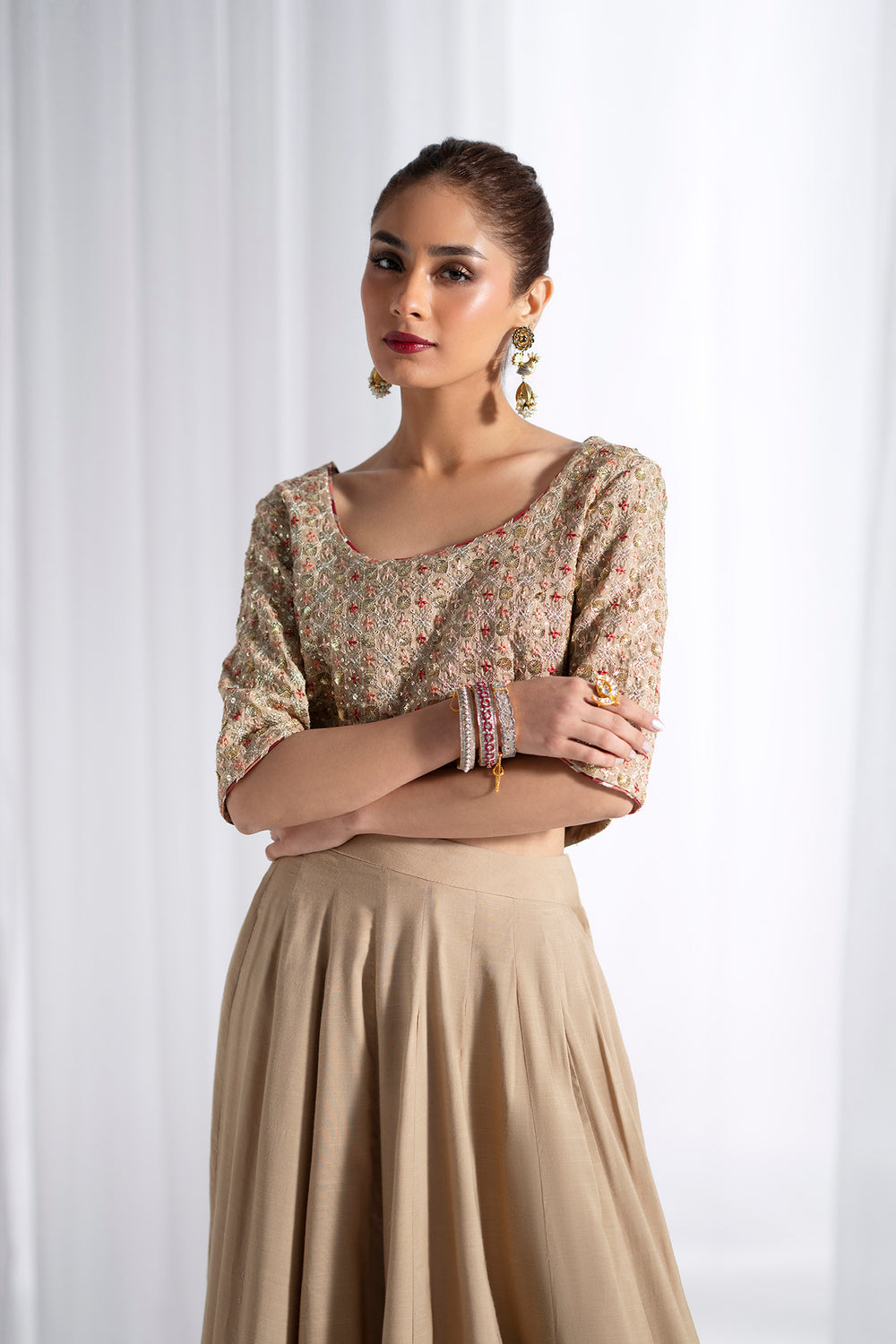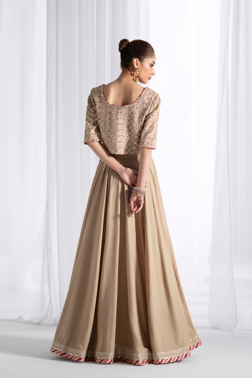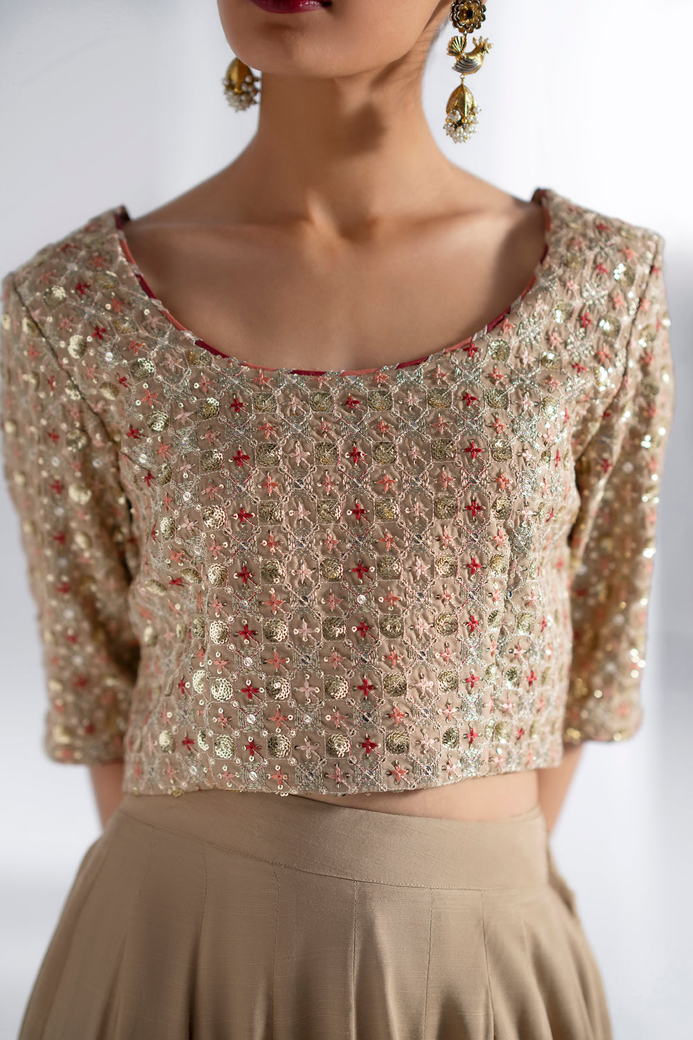 Elevate your festive wardrobe with this exquisite embroidered suit, a masterpiece of traditional craftsmanship. The cropped choli features a gracefully rounded neckline and quarter sleeves, adorned with intricate gold-toned embroidery, sequins, and beadwork that shimmer with every movement. Set against a light gold and beige base, the embellishments create a luminous, celebratory aesthetic. The accompanying floor-length lehenga in soft matte beige provides an elegant foundation, while its hemline showcases striking decorative panels combining bold red accents with gold embroidery and detailed beadwork, making it an ideal choice for weddings, festivals, and special occasions.
