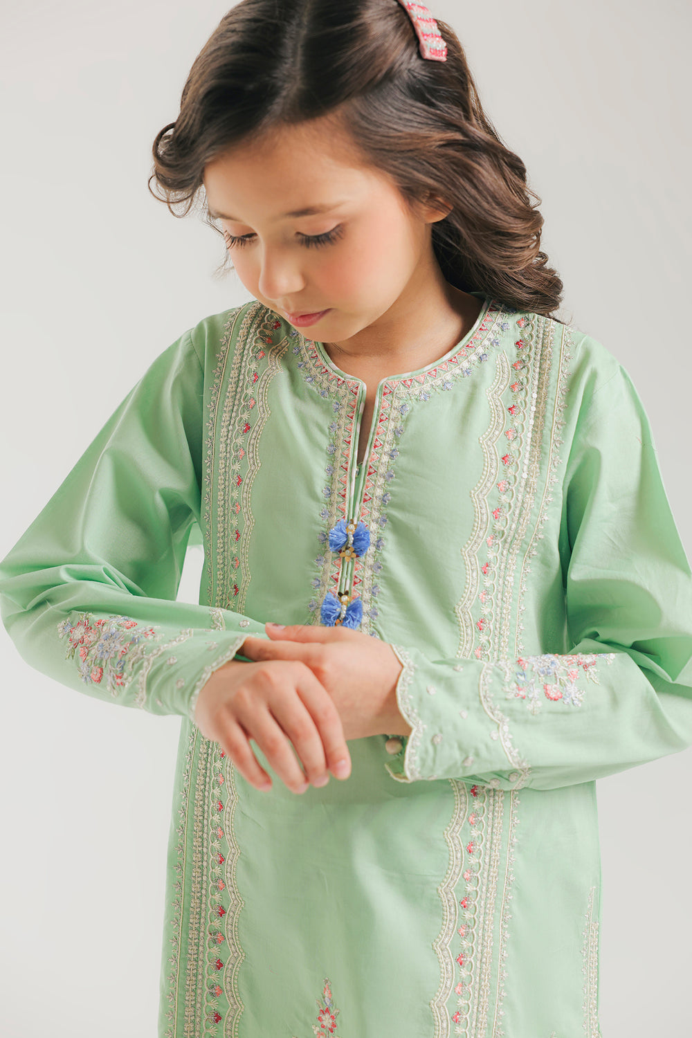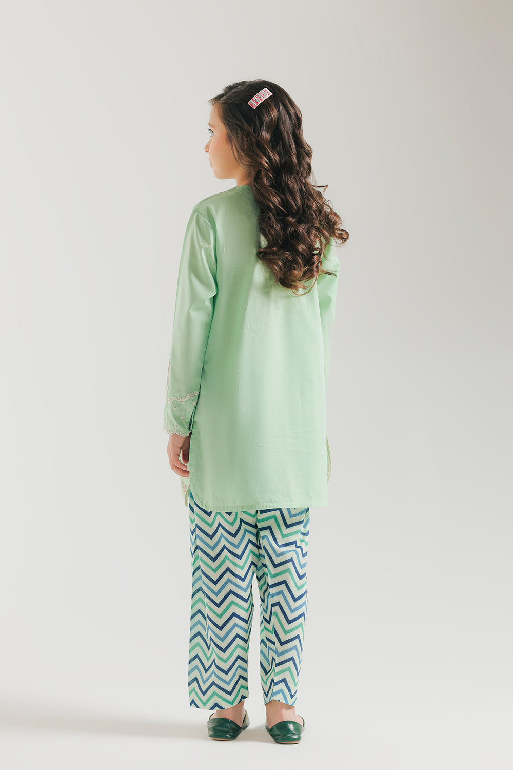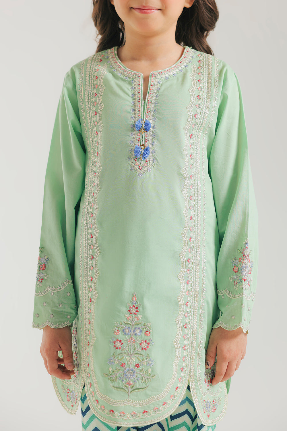 Refresh her ethnic wardrobe with this vibrant mint green ensemble. The shirt features intricate pastel floral embroidery along the neckline and hem, accented by a charming tassel detail and a modern curved hemline. Paired with bold zigzag printed shalwar, this coordinated set perfectly balances traditional craftsmanship with a playful, contemporary flair.