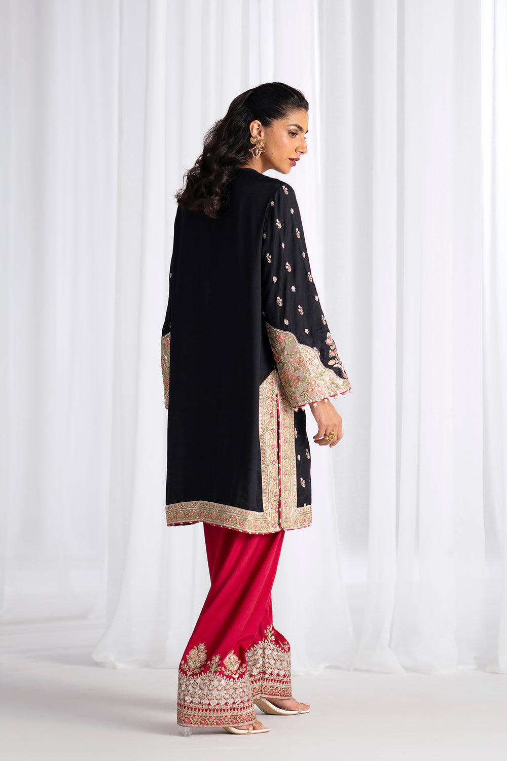 Immerse yourself in festive elegance with this stunning embroidered suit. The black shirt is a masterpiece of design, with intricate embroidery in shades of pink and gold, enhanced with shimmering sequins. A delicately embellished neckline and hem add to its luxurious feel. The ensemble is completed with farshi shalwar in a cherry red, adorned with a bold, embroidered paisley and floral border in complementary tones. This suit is the perfect choice for making a glamorous and memorable statement at any celebration.