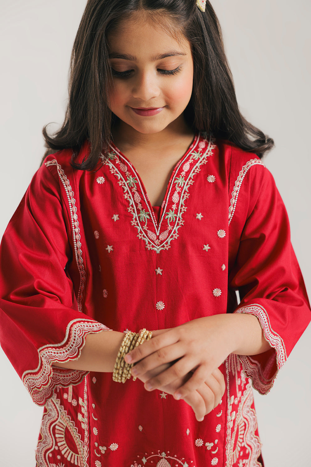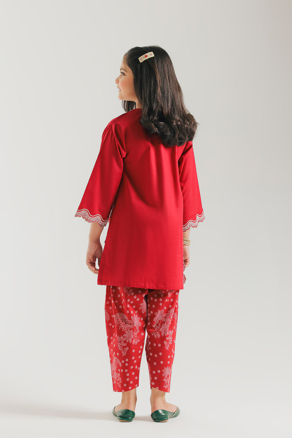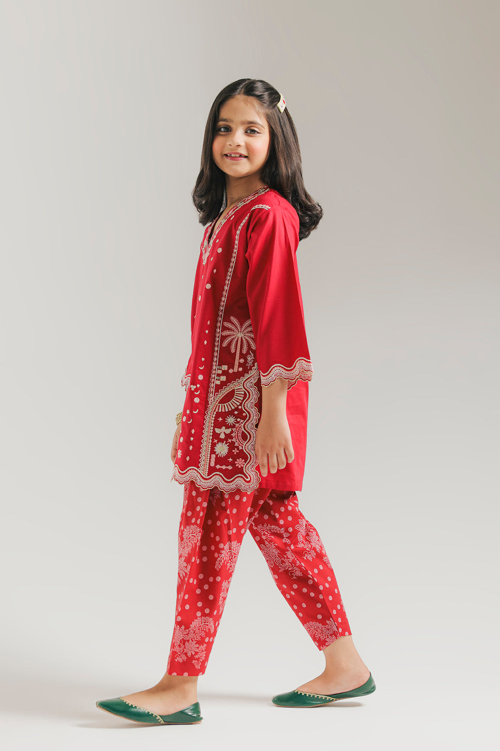 Make a bold festive statement in this vibrant red ensemble. The shirt features intricate white threadwork on the V-neckline and sleeves, highlighted by a prominent floral motif and a delicate scalloped hemline. Paired with floral-printed tulip shalwar, this coordinated set offers a striking blend of traditional elegance and modern style.