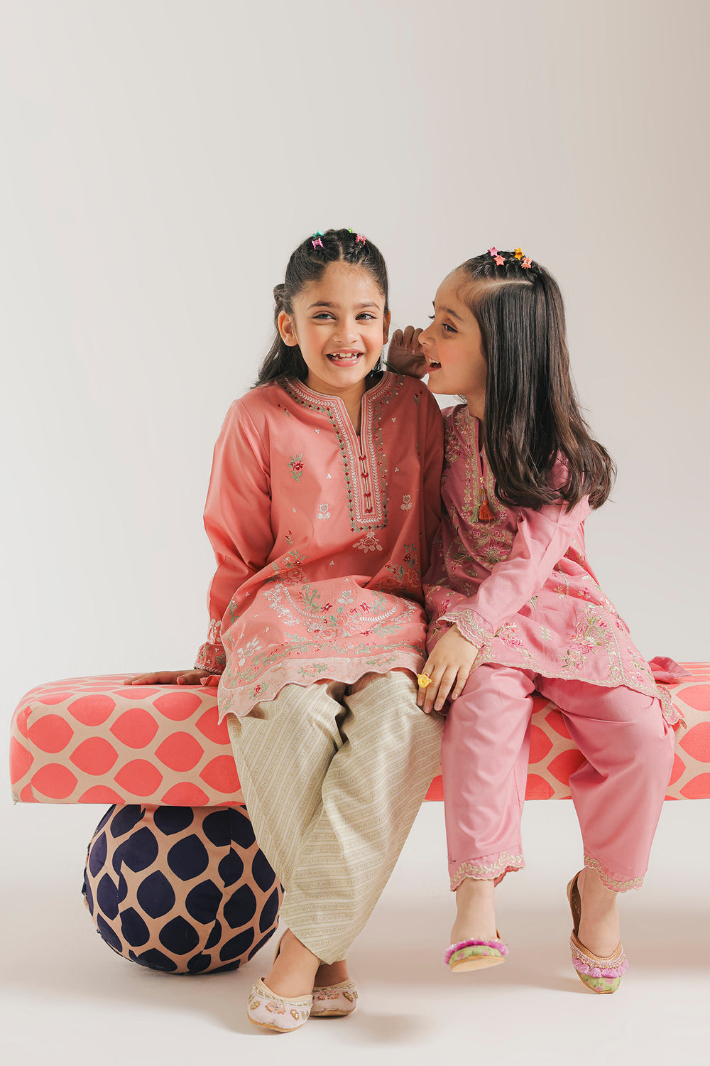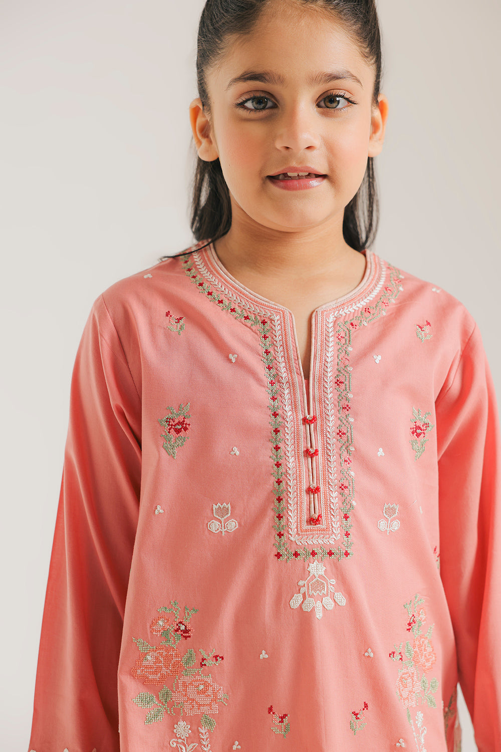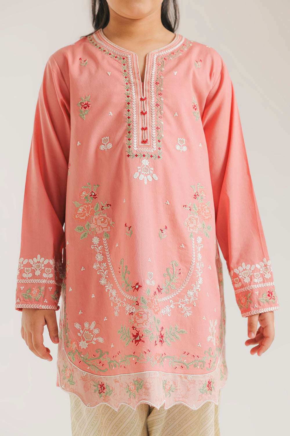 Grace her festive moments with this charming peach ensemble. The shirt is detailed with delicate floral embroidery in soft greens and pinks, featuring an elegant neckline and a beautiful laser-cut scalloped hem. Paired with comfortable diagonal-striped shalwar, this coordinated set offers a refined and stylish look for any special occasion.