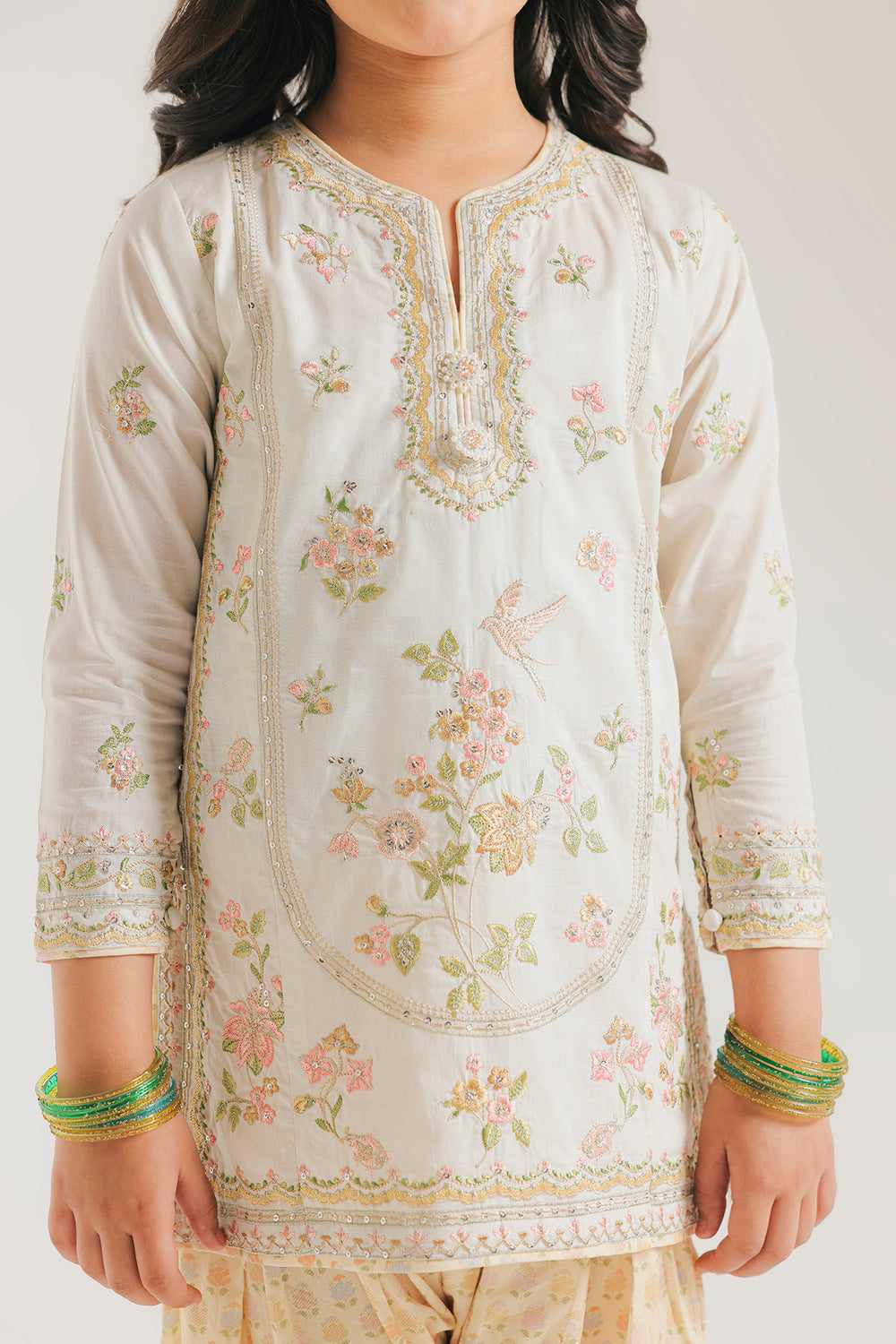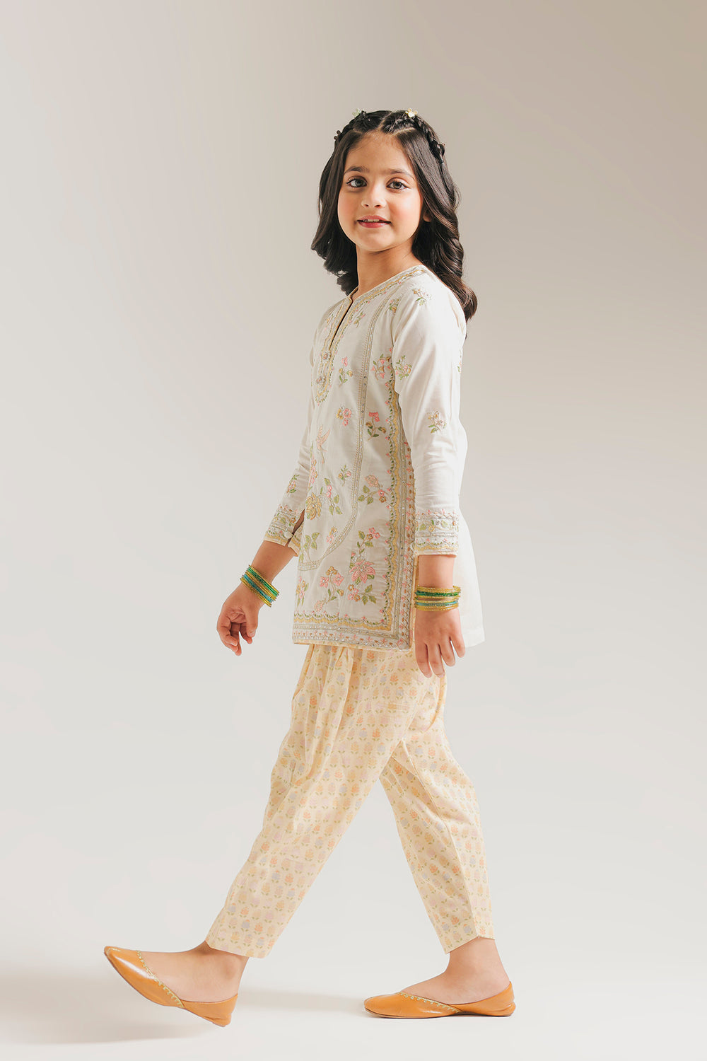 Exude timeless grace with this ivory ensemble, featuring a meticulously embroidered shirt with soft pastel floral motifs and elegant threadwork borders. The look is beautifully completed with printed shalwar in a delicate pattern, offering a sophisticated and comfortable silhouette perfect for festive celebrations.