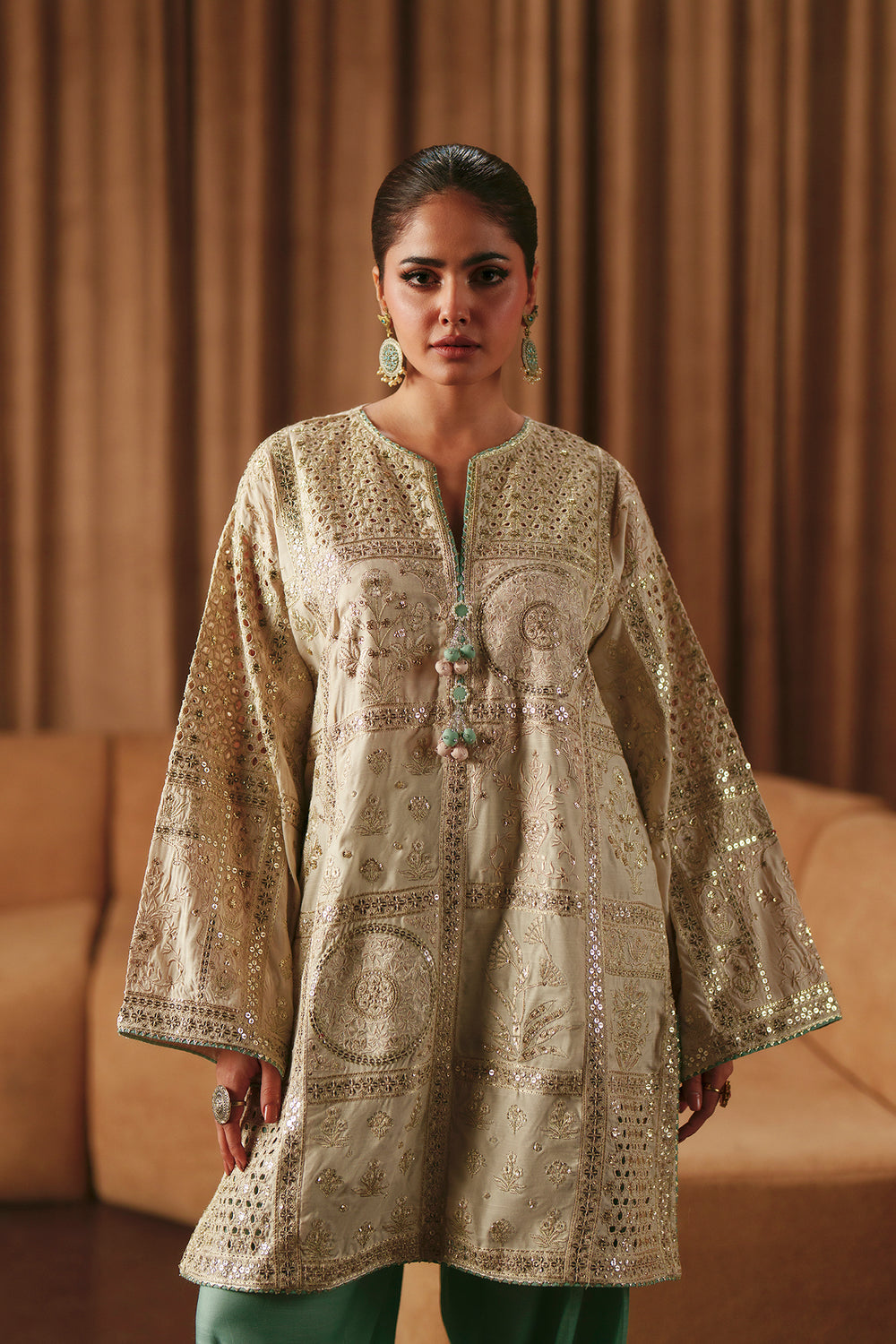 Drenched in timeless elegance, this stunning embroidered suit exudes regal sophistication. The off-white shirt provides a graceful canvas for intricate gold embroidery and subtle sequin work that embellish the entire front and the flared sleeves, further enhanced with delicate laser-cut detailing. Designed in an A-line silhouette, the shirt is paired with a contrasting straight-fit green shalwar, finished with a coordinated gold-embroidered border that ties the look together beautifully. A refined blend of classic hues and artisanal craftsmanship, this ensemble is perfect for making a graceful yet grand statement at festive and formal occasions.