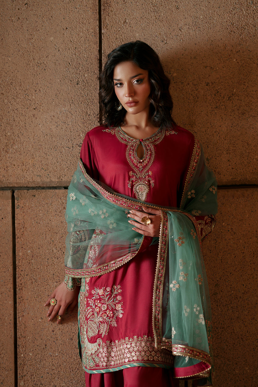 This sophisticated three-piece embroidered suit is presented in a deep, vibrant magenta, offering a rich and regal aesthetic for formal wear. The mid-length shirt features a refined keyhole neckline and intricate silver and gold-toned embroidery that spans the neckline, lower bodice, and hemline. These ornate details are echoed on the wide-leg farshi shalwar, which are finished with a heavily embroidered border at the base. The ensemble is elevated by a contrasting sage green dupatta, which features delicate floral motifs and a coordinating magenta and gold border to tie the look together. With its blend of traditional craftsmanship and bold color blocking, this suit is an ideal choice for high-glamour evening events or festive celebrations.