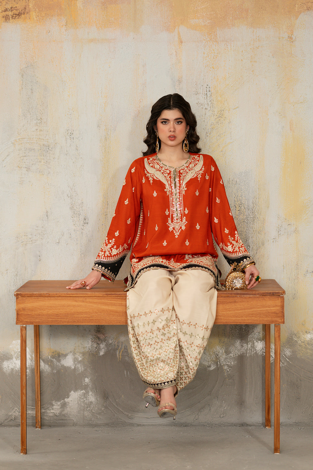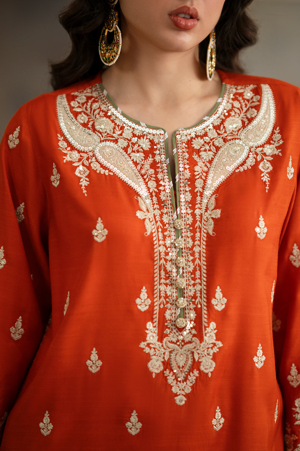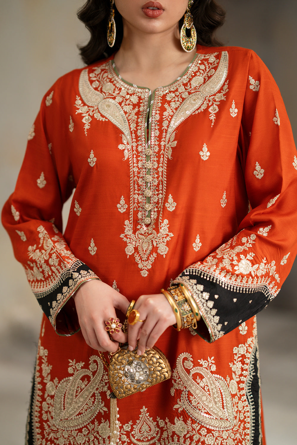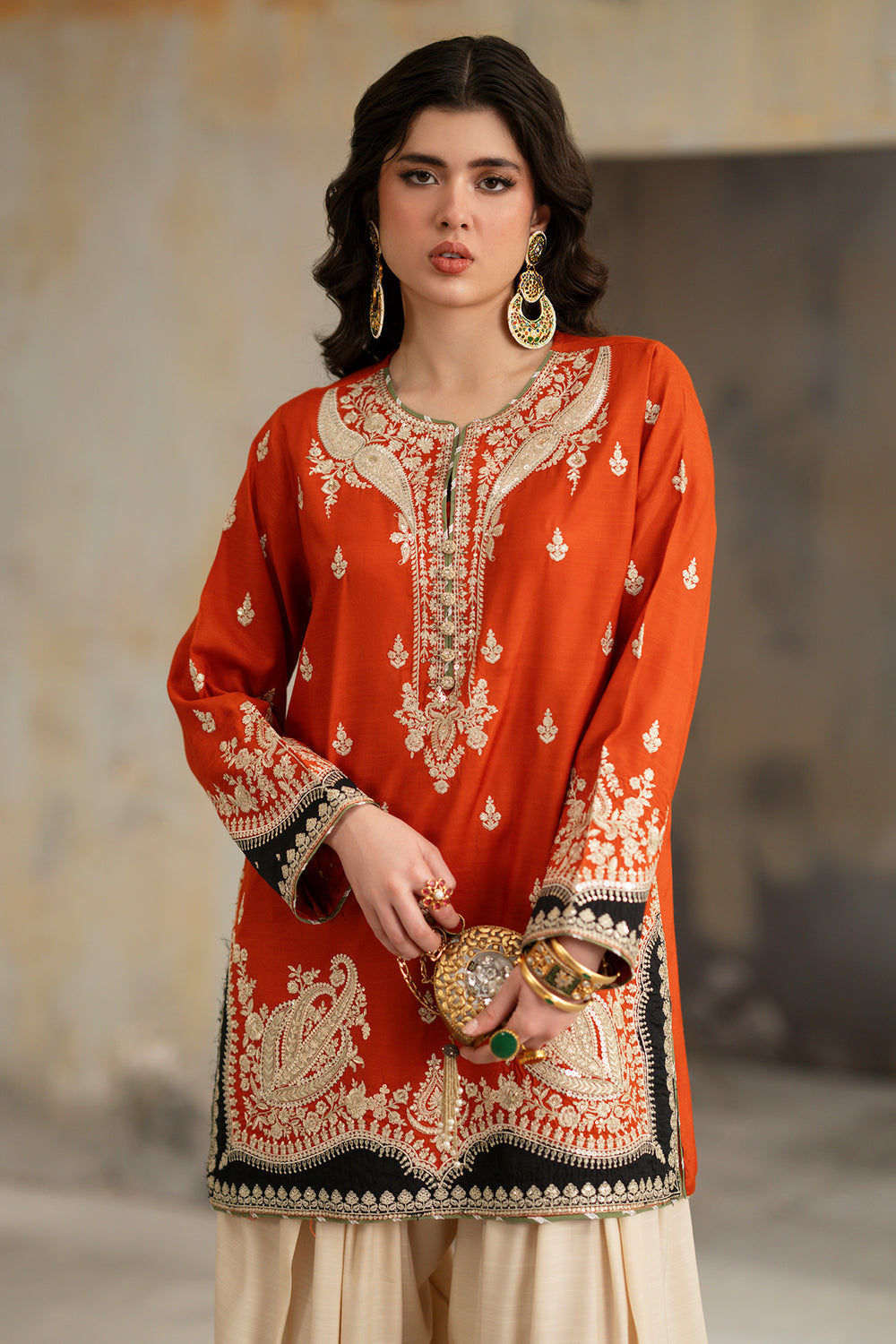 Make a vibrant statement in this captivating three-piece embroidered suit, featuring a brilliant orange tunic that radiates festive energy. The shirt is masterfully adorned with ivory tilla work, showcasing a grand architectural motif on the front and delicate floral sprays across the sleeves. A bold black border at the hem provides a striking contrast, while the ensemble is elevated by a sheer black dupatta dusted with gold sequins. Paired with ivory wide-leg farshi shalwar featuring a tonal embroidered border, this high-fashion look is the definitive choice for those who command attention with poise.