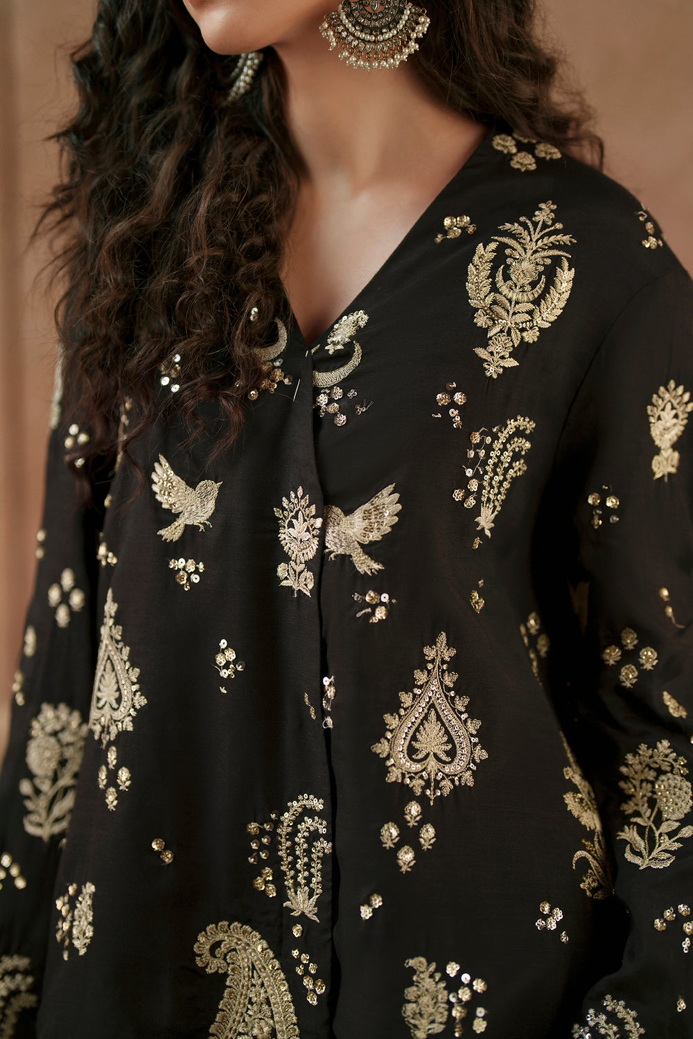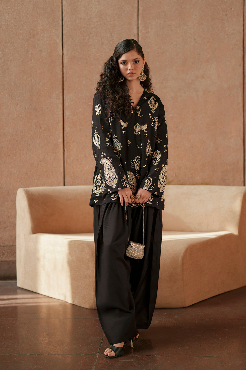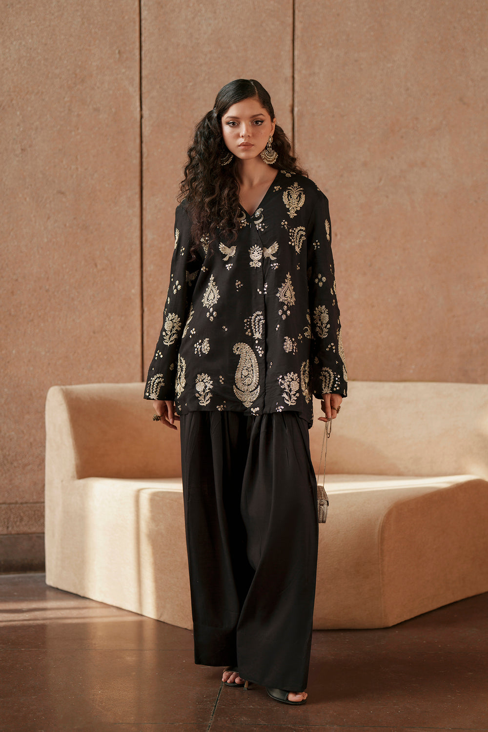 Make a stunning impression with this jet-black two-piece suit, featuring a luxurious display of gold-toned embroidery. The shirt is artfully adorned with a variety of traditional motifs, including large paisley patterns, delicate floral sprigs, and whimsical bird illustrations scattered across the front and long sleeves. A clean V-neckline and a simple button-down placket provide a structured finish to the relaxed, straight-cut silhouette. This elegant ensemble is perfectly coordinated with voluminous black trousers that offer a graceful, airy drape, creating a sophisticated and timeless look.