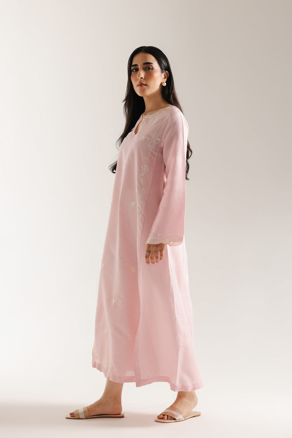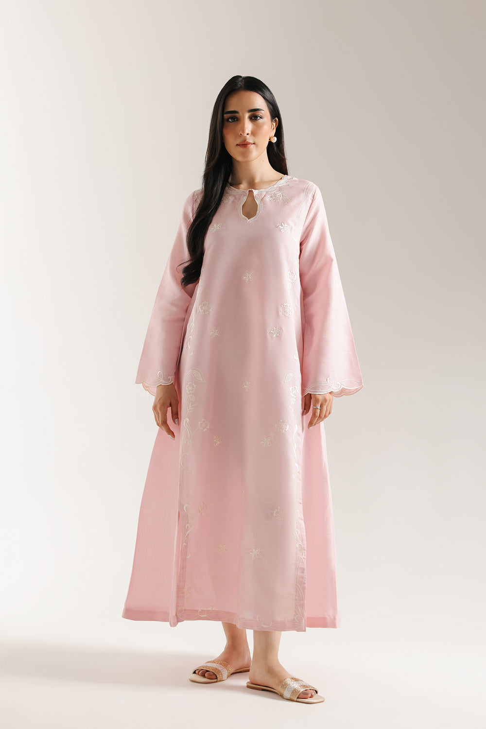 Capture pure, feminine grace in this stunning baby pink embroidered dress. This long, sweeping dress offers an elegant, flared A-line silhouette. The beautiful pink fabric is subtly detailed with delicate white floral thread embroidery scattered across the front panel. The simple, sophisticated neckline features a keyhole cut-out, and the wide, full sleeves are finished with a charming scalloped white embroidery. This piece provides a light, fresh, and effortlessly elegant look, perfect for warm-weather gatherings.