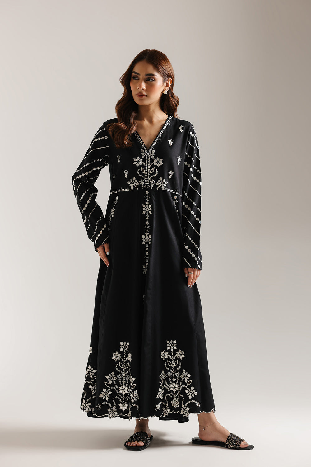 This long black dress features intricate white embroidery. The embroidery decorates the bodice, sleeves, and hemline, creating an elegant and refined contrast against the dark base. The dress has a V-neckline and full-length sleeves with horizontal embroidered stripes, adding texture and balance. The silhouette is flowy and slightly flared, offering a graceful, traditional-yet-modern appearance. The model pairs it with black embellished flat sandals, completing a chic and understated look.