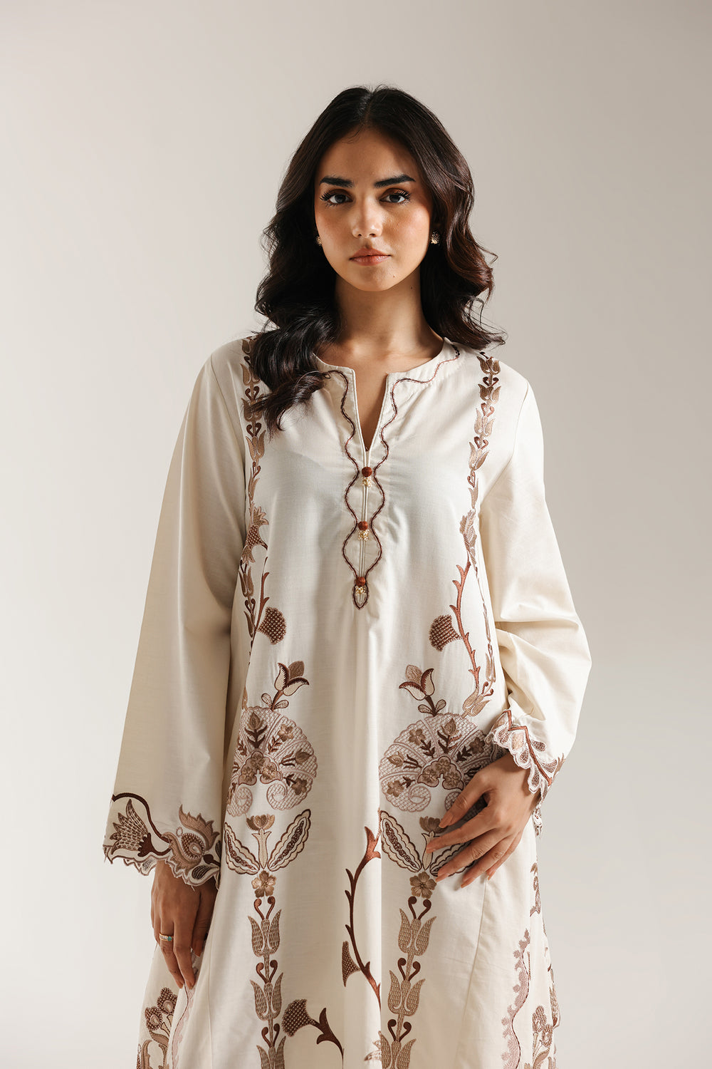 Immerse yourself in subtle elegance with this beautiful off-white embroidered dress. This long, A line-cut dress is crafted from a soft, pristine off-white fabric. It features exquisite tonal thread embroidery in shades of brown and beige, forming elegant floral and scrolling patterns across the front, long sleeves, and hem. The V-slit neckline is accented by delicate button details, and the hemline is finished with a charming scalloped cutwork border. This dress offers a sophisticated, understated, and comfortable statement piece.