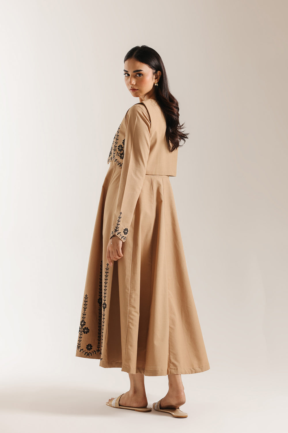 This elegant embroidered dress combines timeless sophistication with contemporary ethnic design. Crafted in a soft neutral tan and beige palette, the A-line silhouette flows gracefully from chest to hem, creating a flattering drape perfect for various occasions. The dress features distinctive black embroidery detailing—a striking yoke overlay with delicate scalloped shoulders and coordinating embellishments along the hemline. Long sleeves provide modest coverage while maintaining an airy, refined aesthetic. Ideal for casual gatherings, semi-formal daytime events, or cultural celebrations, this piece seamlessly bridges traditional craftsmanship with modern style sensibilities.
