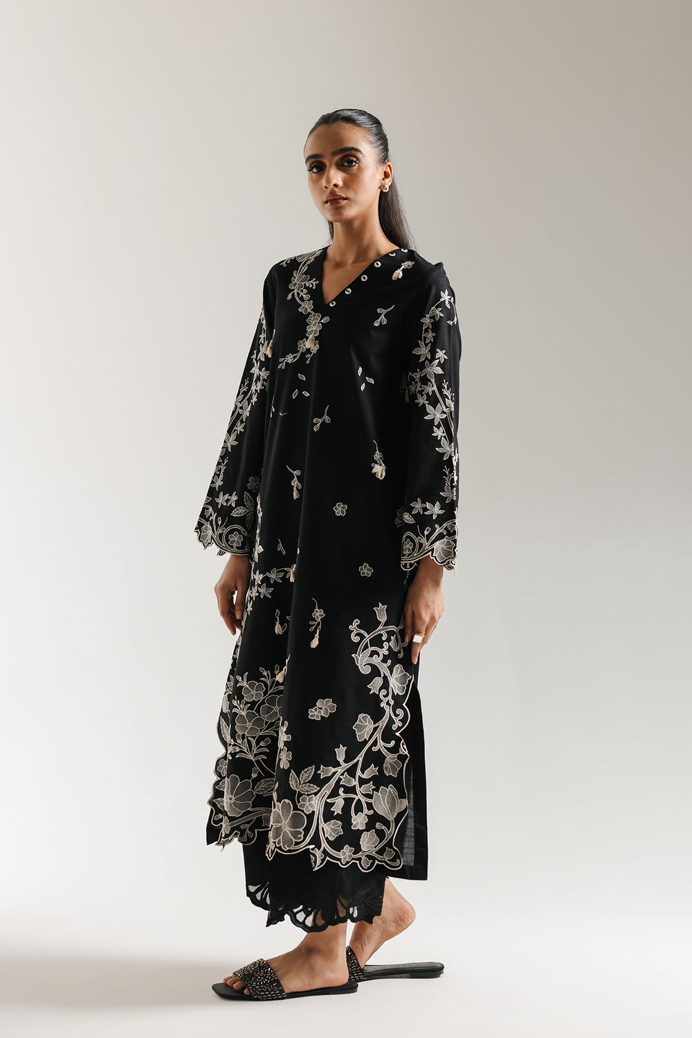 Step into captivating elegance with this long, black embroidered shirt. This flowy, long-sleeved shirt is crafted from a black fabric and features exquisite white thread embroidery in a detailed floral vine motif that trails gracefully from the yoke down to the scalloped hem. The V-slit neckline is accented with small white accents, and the wide sleeves are finished with coordinating embroidered detail, making this a stunning statement piece for any sophisticated occasion.
