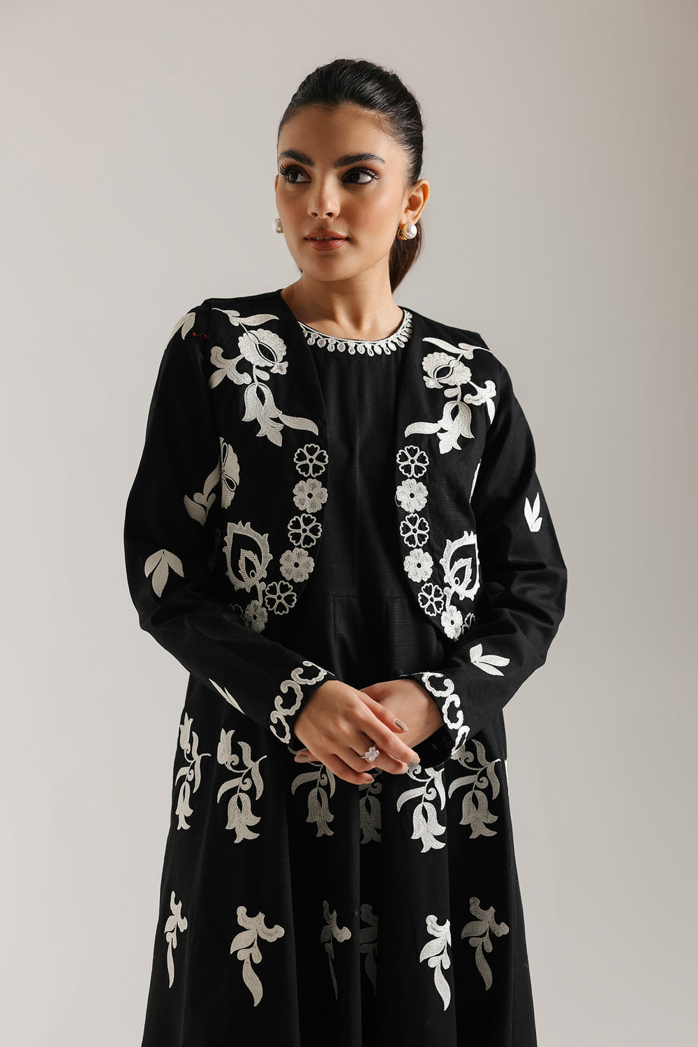 Twirl with dramatic flair in this striking black and white embroidered dress. This stunning maxi-length dress features a long, flowing skirt made from a solid black fabric. The drama comes from the fitted waistcoat adorned with bold white embroidery. The monochrome design is finished with a delicate floral border along the hem, creating a mesmerizingly chic and high-contrast look.