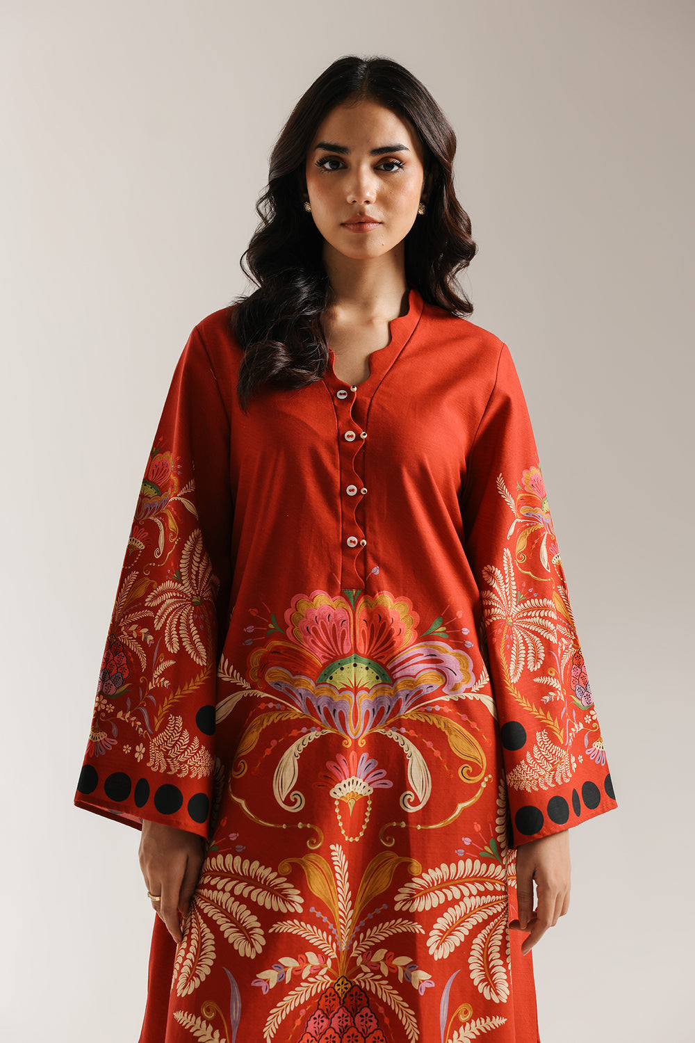 Step into the spotlight with this dazzling red printed dress. This long, straight-cut dress is rendered in a vibrant, fiery red fabric that features a spectacular, all-over traditional print. The rich, highly-detailed motifs—including stylized floral bursts and paisleys in yellow, green, pink, and blue—create a striking contrast against the red base. The dress features a clean V-slit neckline with delicate buttons, and the wide, voluminous sleeves are finished with a contrasting border. This piece is a truly vibrant and comfortable statement outfit.