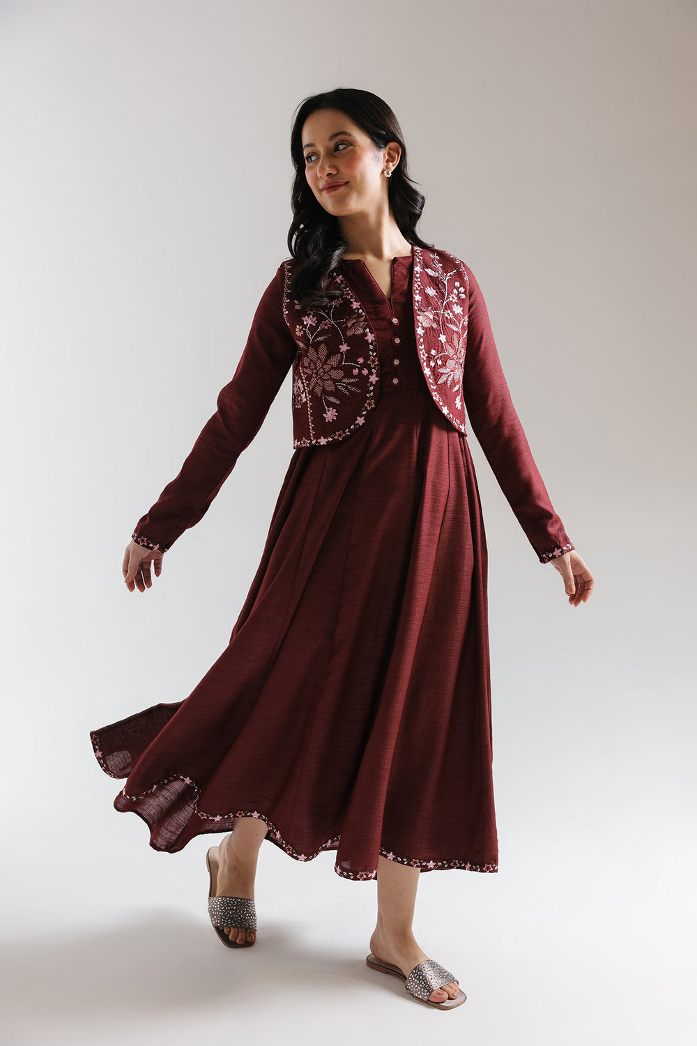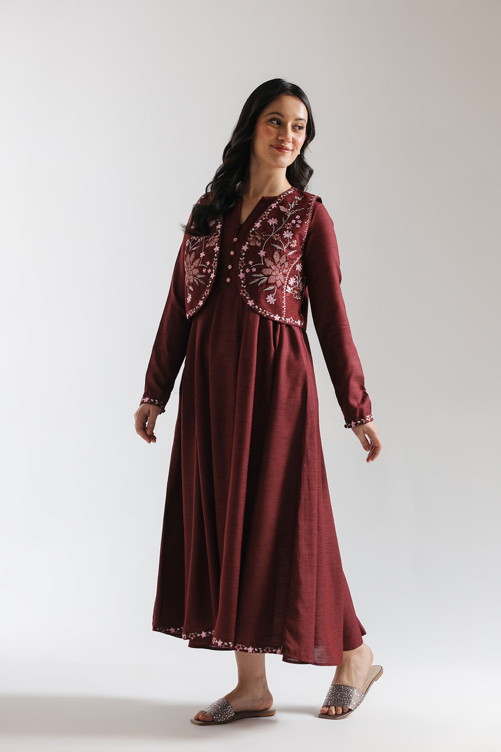Sophisticated plum-hued ensemble featuring a gracefully flared frock with round neckline and an elegant front slit. Three strategically placed front buttons provide refined closure, while the embroidered waistcoat adds intricate textural depth and artisanal craftsmanship. A versatile piece that balances contemporary silhouette with traditional embellishment techniques.