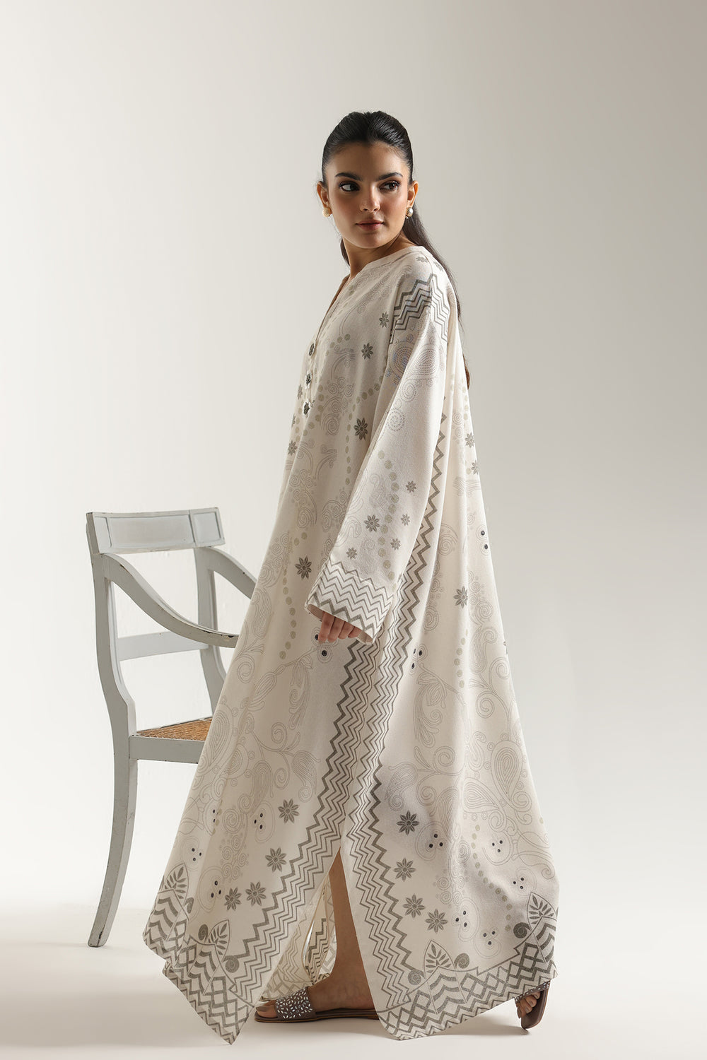Grace the room in the soft, flowing elegance of this printed dress. This maxi-length dress is designed with a comfortable, relaxed silhouette and crafted in a beautiful off-white fabric. It features an all-over faded ornamental print in soft tones of light beige and taupe, incorporating elements like paisleys, mandalas, and florals. The design includes a band collar with a subtle V-neck opening and large, flowing sleeves. This piece is a wonderfully serene choice, offering a gentle, monochromatic aesthetic that feels both contemporary and timeless.