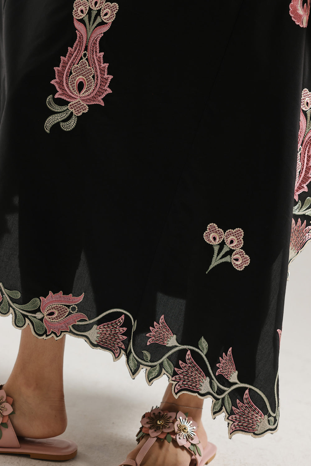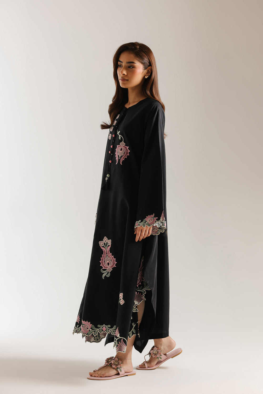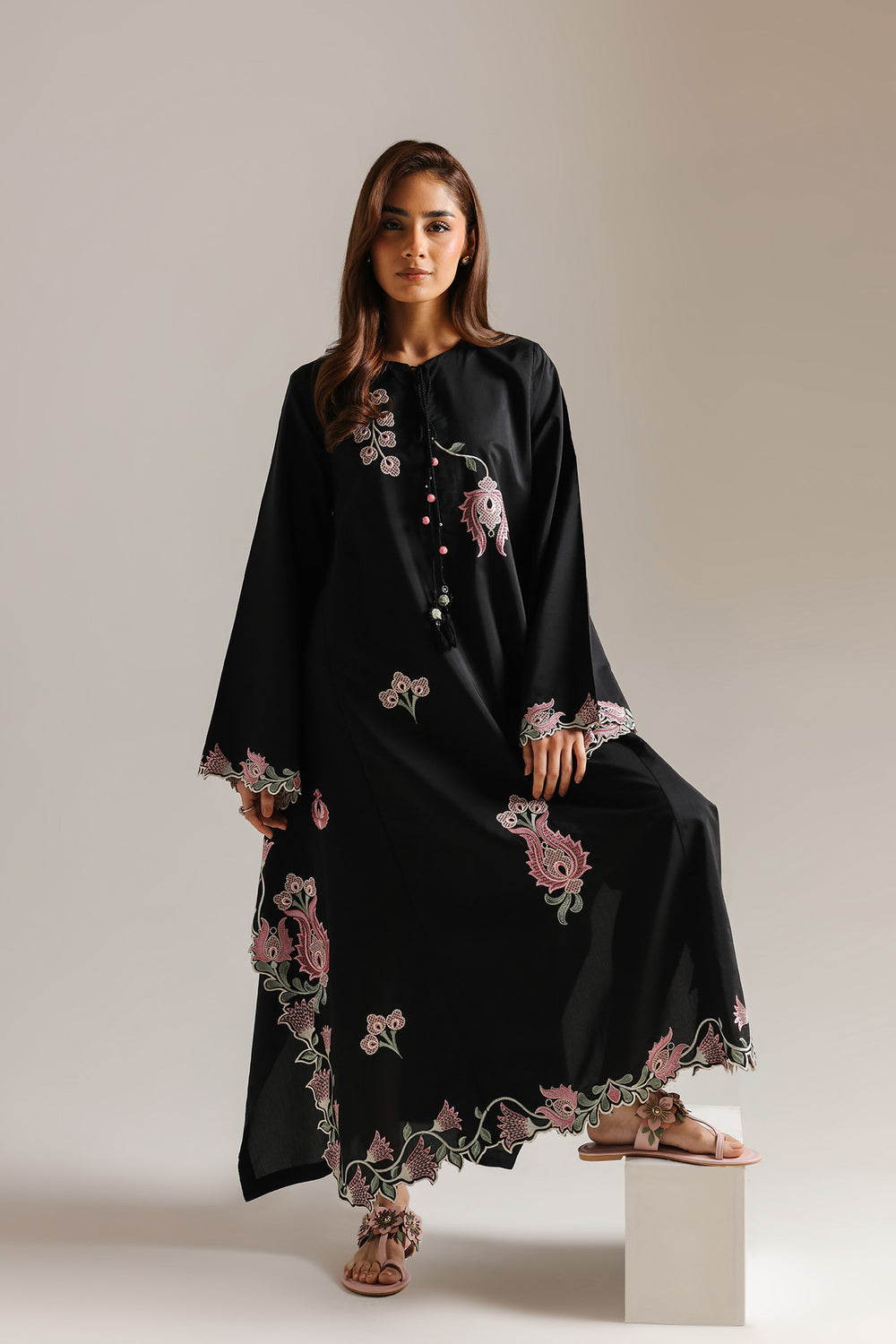 Embrace a whimsical and romantic aesthetic with this black dress, designed to stand out through its intricate, tonal details. The flowing silhouette features a soft, rounded neckline with a delicate button-and-tassel placket, leading into a canvas of beautiful pink and green floral embroidery that punctuates the deep black base. These feminine motifs are echoed on the wide, graceful sleeves and along the hemline, which is finished with an exquisite scalloped edge and ornate needlework. Perfectly blending a relaxed fit with artistic flair, this dress is an effortless choice for making a sophisticated yet playful statement.