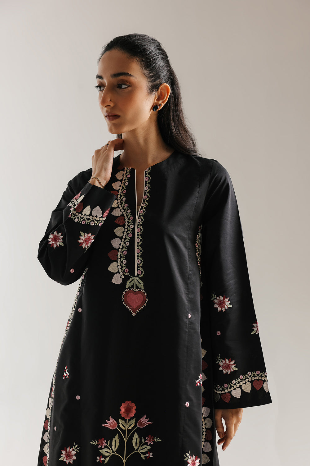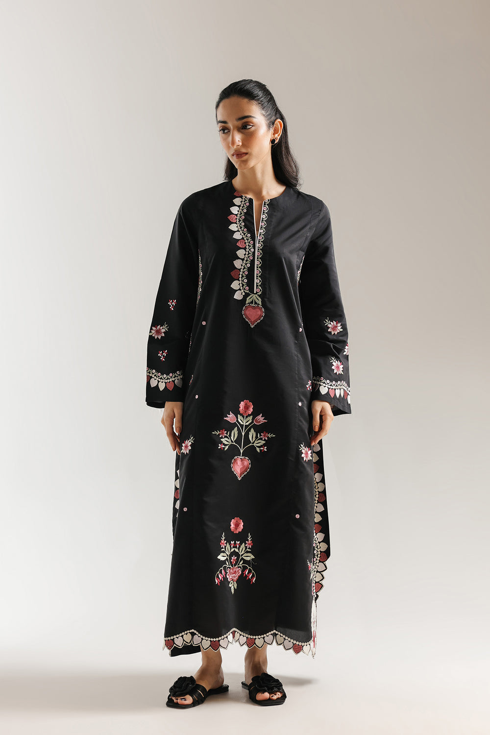 Infuse your evening wardrobe with a touch of whimsical romance in this stunning black floor-length dress. The garment features a clean split neckline, uniquely framed by a vertical trail of delicate pink heart-shaped petals and ivory floral accents. At the center of the bodice, a larger embroidered heart motif anchors the design, leading the eye down to a series of blooming floral bouquets that add a vibrant, garden-fresh energy to the dark canvas. Effortlessly elegant with a modern, playful twist, this dress is the premier choice for special celebrations or formal gatherings where you want to make a heartfelt impression.