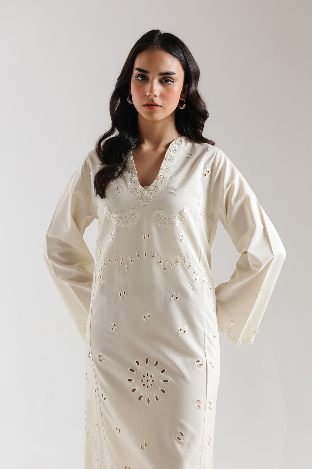 Embrace the serene beauty of this ethereal floor-length dress, rendered in a pale yellow that exudes effortless sophistication. The garment features a graceful V-neckline with a delicate layered insert, leading into a bodice adorned with tonal white embroidery and traditional paisley motifs. The true artistry of this piece lies in its intricate schiffli-style cutwork. A bold, circular sunburst motif anchors the center of the skirt, while the voluminous hemline is finished with an elaborate scalloped border featuring layered geometric and floral cutouts. Timeless and airy, this dress is the premier choice for elegant daytime festivities or sophisticated summer soirées.