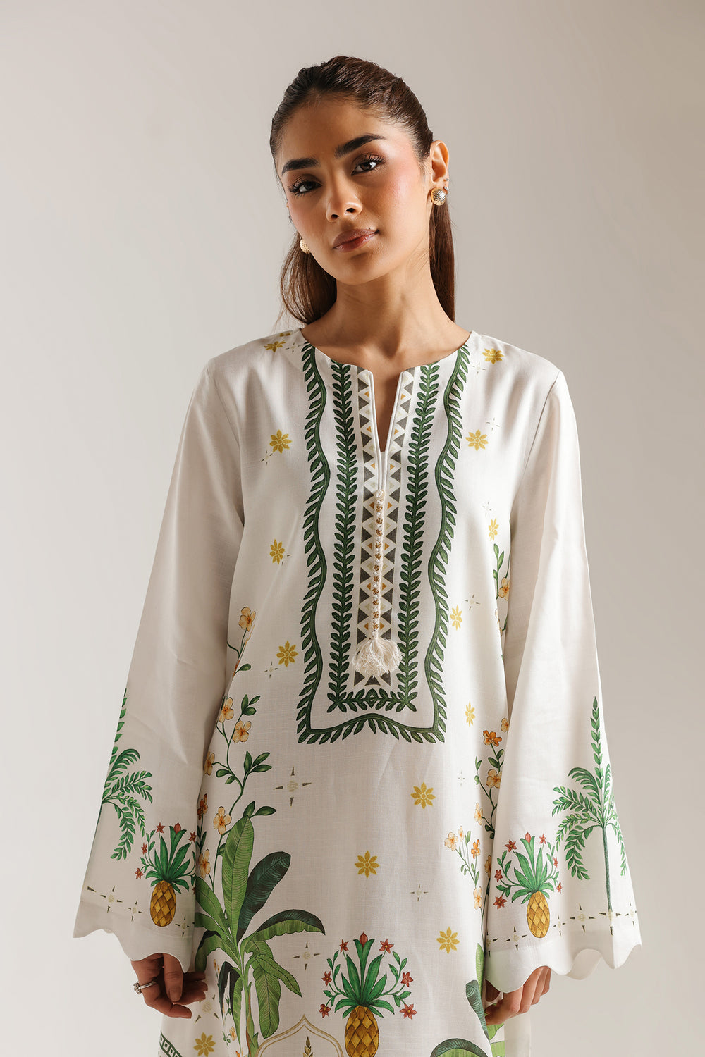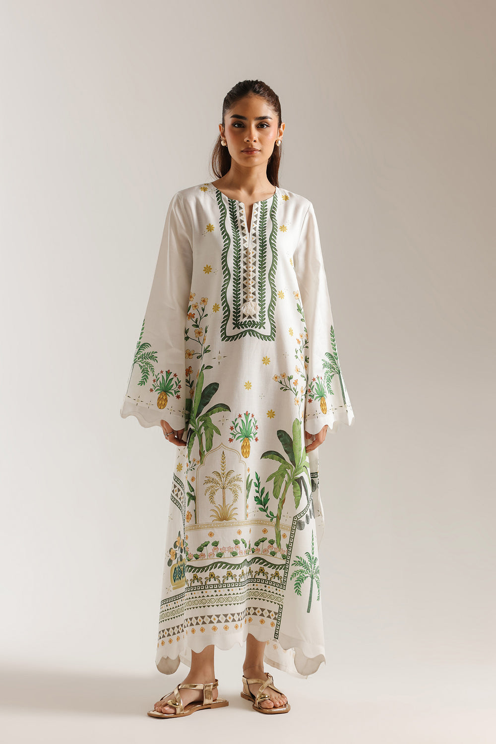 Transport yourself to a sun-drenched paradise with this ethereal ivory dress, a captivating fusion of bohemian flair and meticulous artisanal detail. The garment features a sophisticated split neckline, beautifully framed by a lush green leafy border and accented with a delicate cream tassel for a touch of whimsical charm. The dress serves as a vibrant canvas for a tropical storytelling theme, showcasing detailed illustrations of towering palm trees, golden pineapples, and blooming wildflower sprigs in shades of emerald, marigold, and earthy ochre. This picturesque botanical landscape is punctuated by dainty star-like motifs, creating a sense of natural wonder across the fluid silhouette. The voluminous wide sleeves mirror this tropical artistry and is finished with a signature scalloped edge, adding a feminine and airy feel to the design.