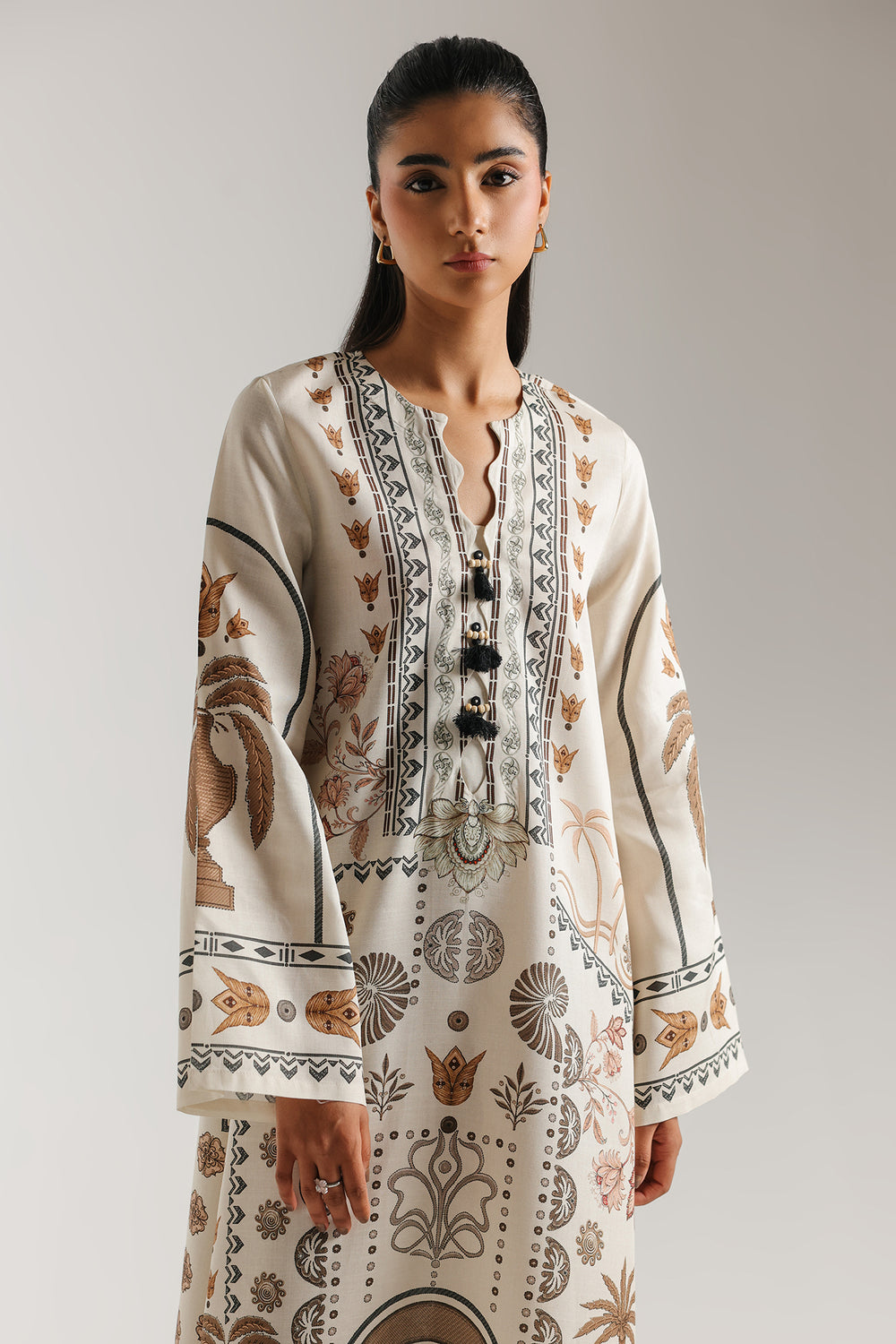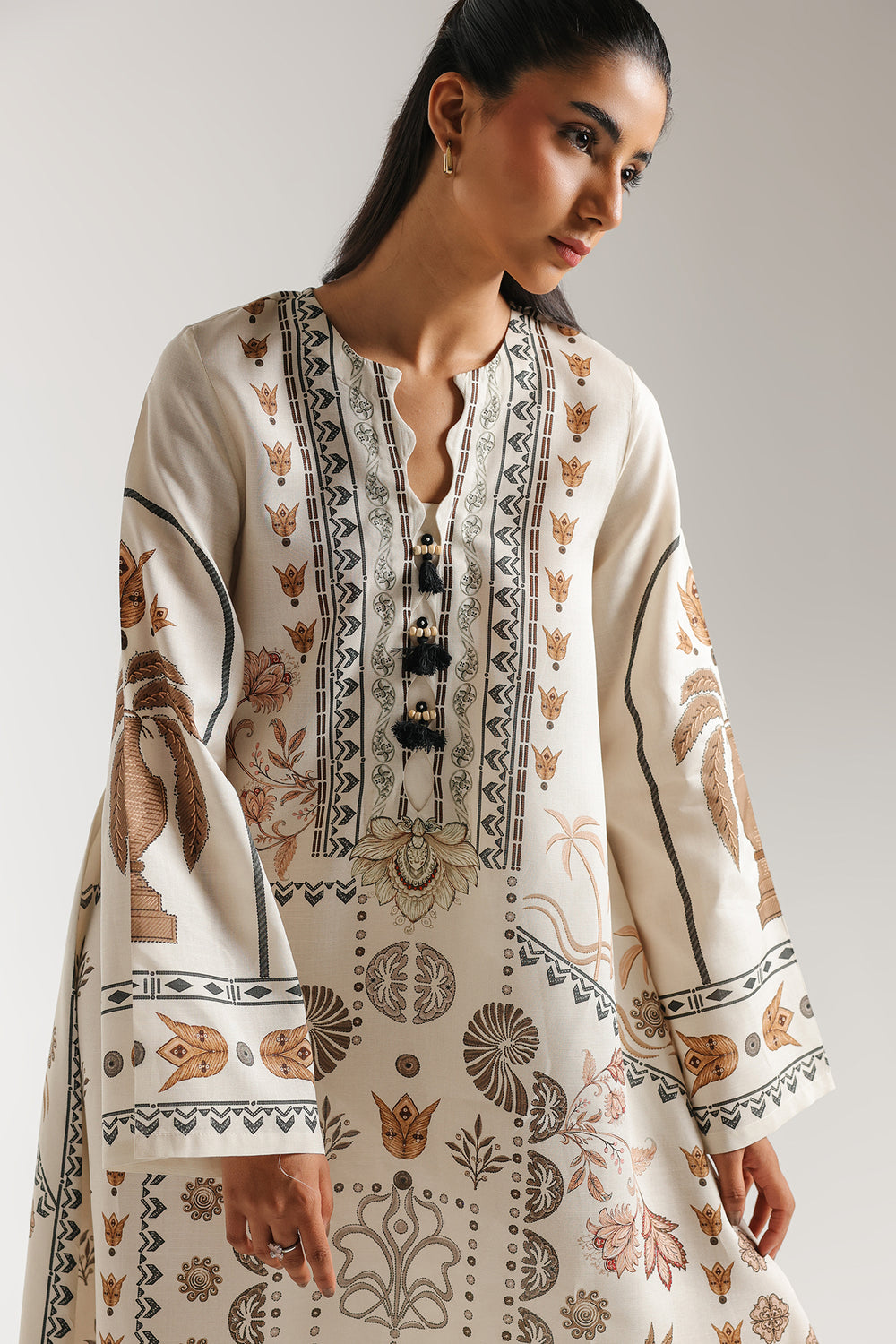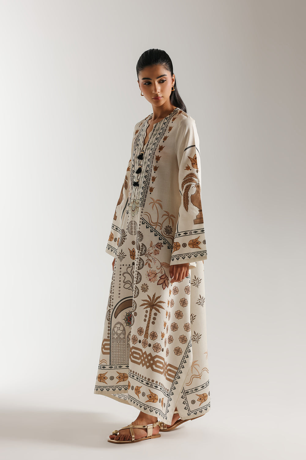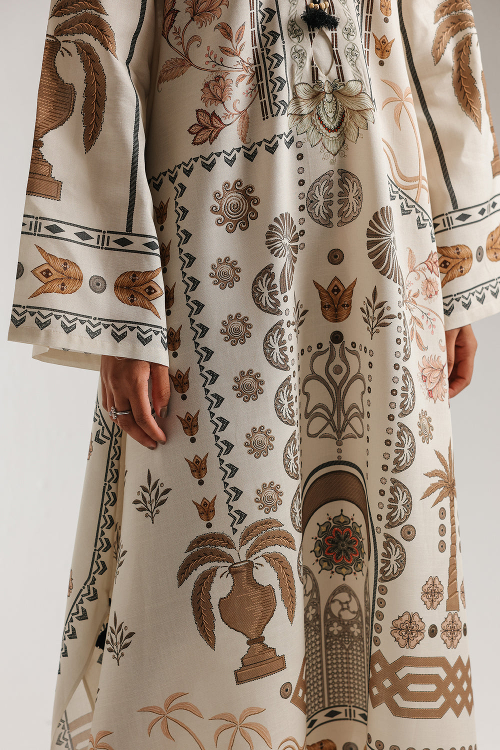 Step into a world of antique charm with this printed dress, designed for a look that is both storytelling and sophisticated. The design features an intricate mix of architectural and botanical prints, showcasing palm trees, urns, and geometric motifs in warm sandy tones and deep chocolate browns. A refined V-neckline is accented with a detailed black and tan border and finished with delicate black tassels at the placket for a touch of texture. The long-line silhouette flows into a wide, flared bottom with a tiered print at the hem, while the wide sleeves are finished with a matching decorative border. This ethereal piece offers a graceful fit, perfect for elevated daytime gatherings or a polished evening ensemble.